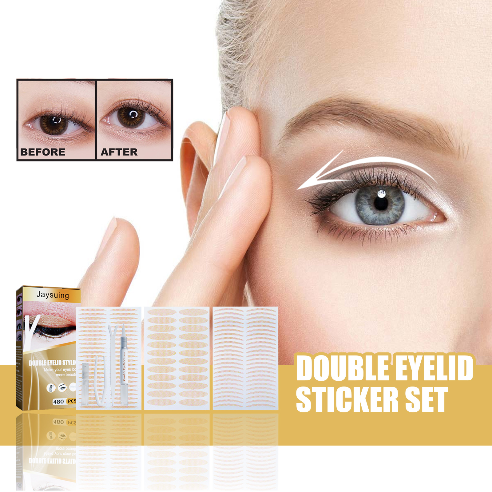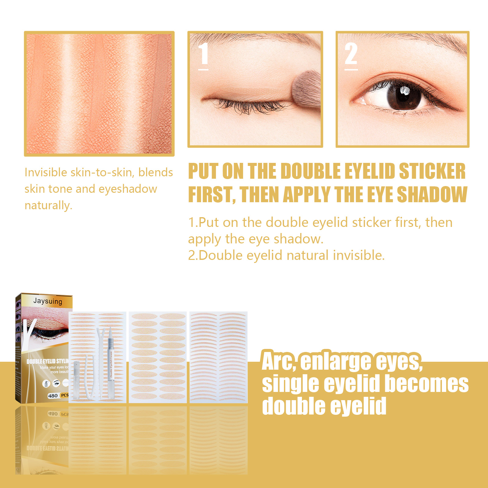 Our double eyelid stickers contain propylene glycol and refined benzyl ester. It can turn single eyelid into double eyelid to enlarge the eyes, natural invisibility, invisible skin blend, skin color and eyeshadow natural, natural lasting, big eye artifacts, invisible no trace, waterproof and sweat resistant. Its use is simple: use a cotton pad to clean the skin around the eyes; Pull out the double eyelid sticker with a Y-shaped fork and attach it to the corresponding convex and convex position of the eye; Use the y shape and the other end to adjust the position of the eyelid sticker; Once adjusted, blink and you can pull. Enlarge your eyes, single eyelid becomes double eyelid, not easy to fall off, strong adsorption force, make your eyes become more beautiful in an instant, more energetic, close to skin color, matte non-reflective, strong support; Strong viscosity, double eyelids solid and reliable; Waterproof and sweat resistant, can be used before and after makeup.
