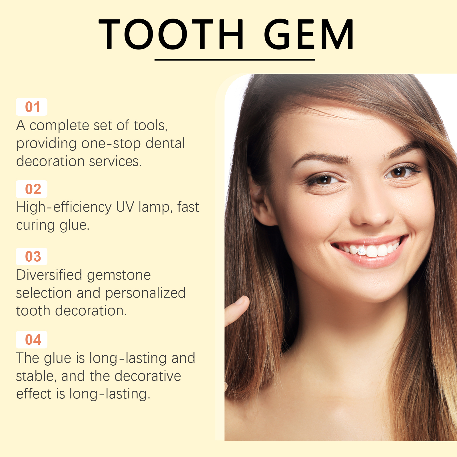 Our DIY fashion dental kit contains acrylic, methacrylate and vinyl. It can be efficient UV lamp, fast setting glue. Diverse selection of gemstones, personalized tooth decoration. The glue is durable and stable, and the decorative effect is lasting. How to use it is simple: 1. Open your mouth and put a white cotton swab in your mouth. 2. Clean your teeth with a pink Q-tip, open the glue, remove the gem with a gem pen, and dip it in the glue. 3. Attach the gem to your teeth. 4. Dry the glue with ultraviolet light. The high quality glue ensures that the gemstone will not fall off for a long time.
