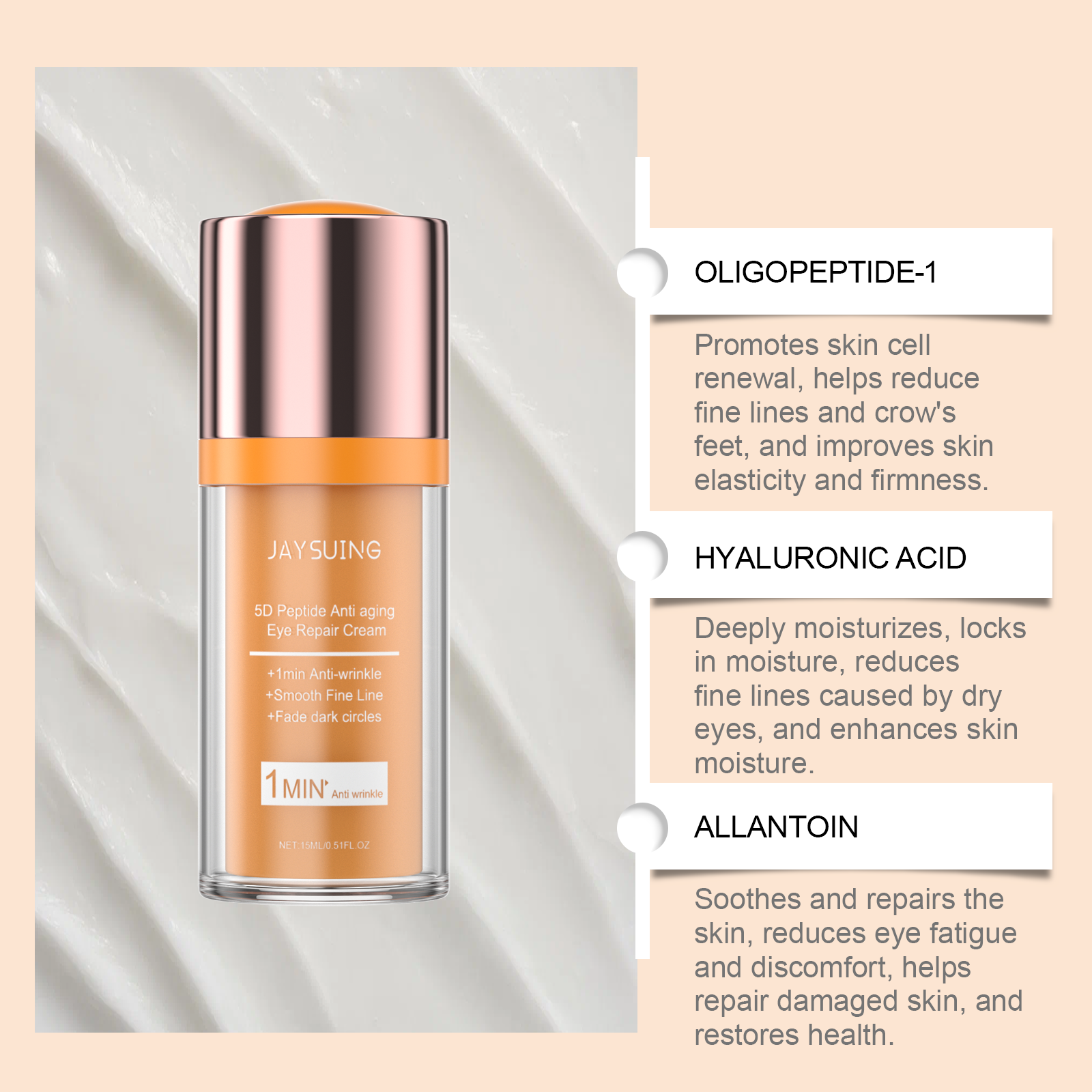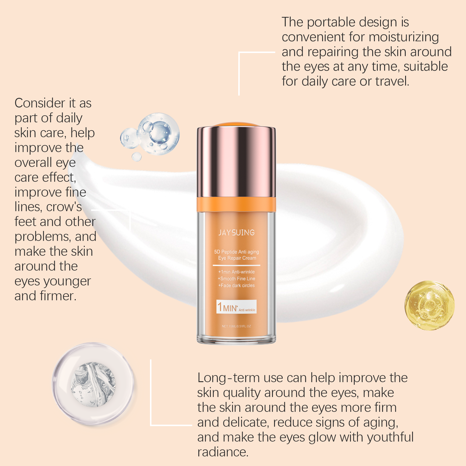 Our eye repair cream contains oligopeptide-1, hyaluronic acid, allantoin. It provides deep moisture to the skin around the eyes, helping to lock in moisture, relieve dryness and tightness, and keep the skin around the eyes hydrated and soft for a long time. Its application method is simple: 1. Clean the skin around the eyes and keep it dry. 2. Apply appropriate amount of the product to the skin around the eyes, gently massage until absorbed. Scientific formula, effectively improve skin elasticity, reduce sagging, tighten eye contour, enhance the smoothness and luster of the skin around the eyes.