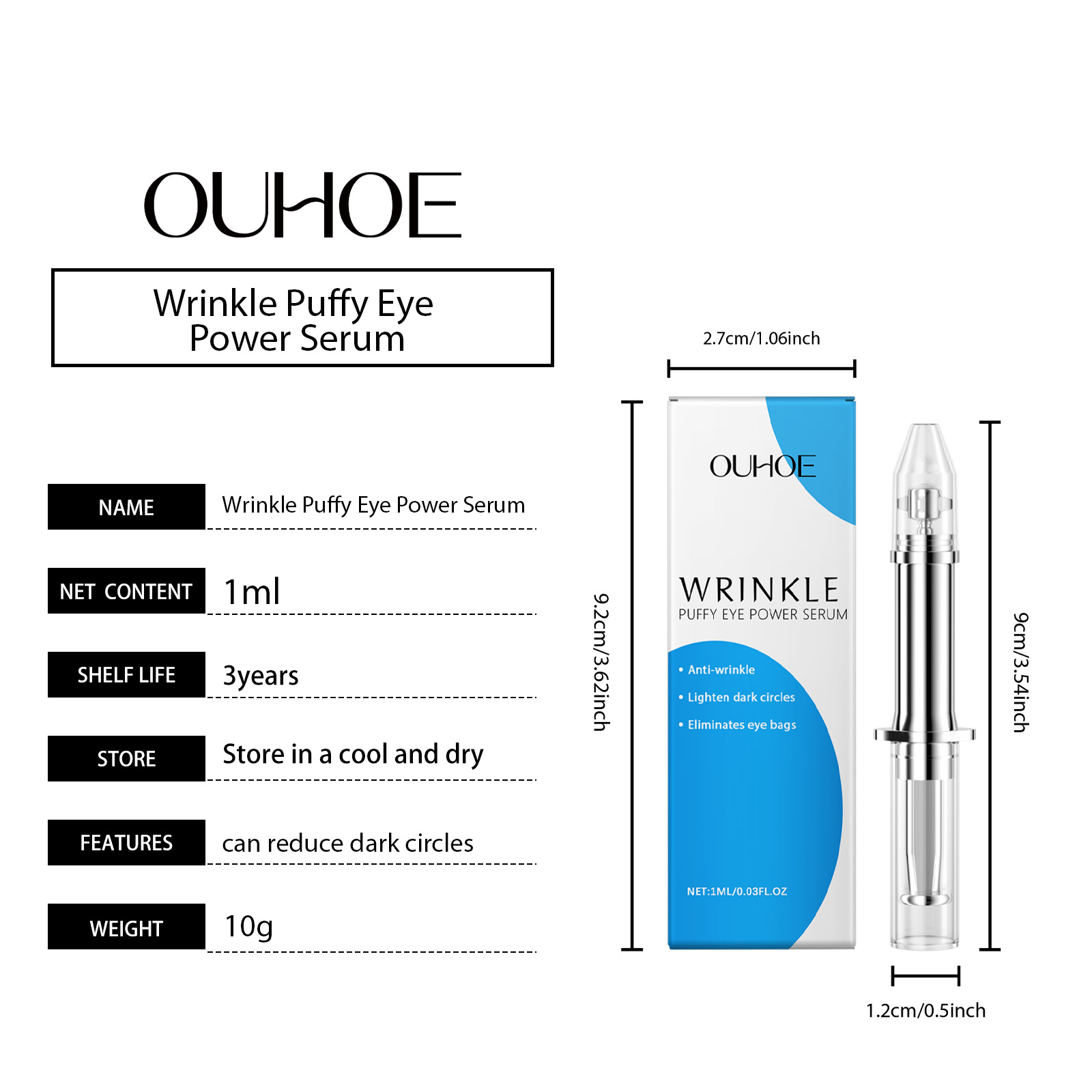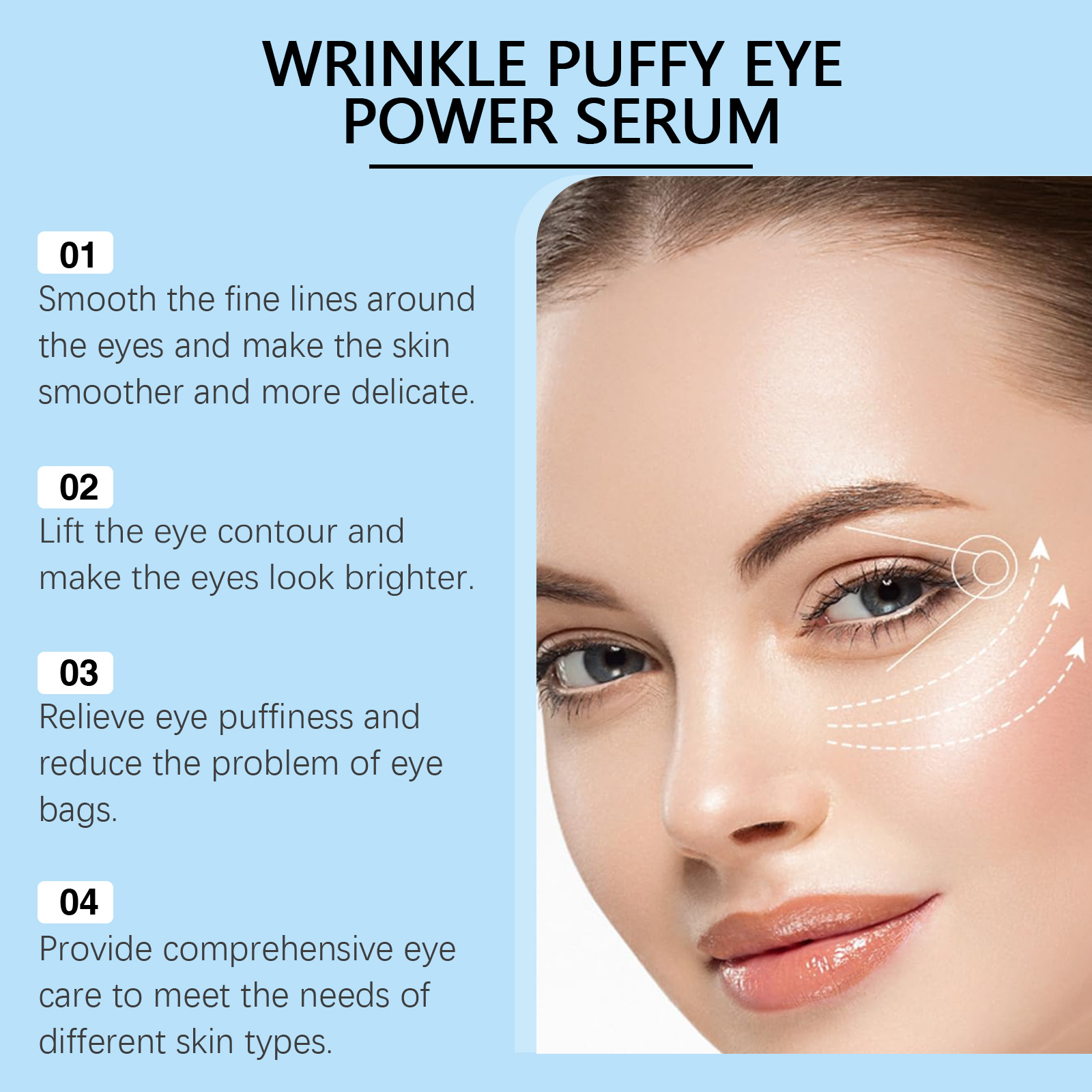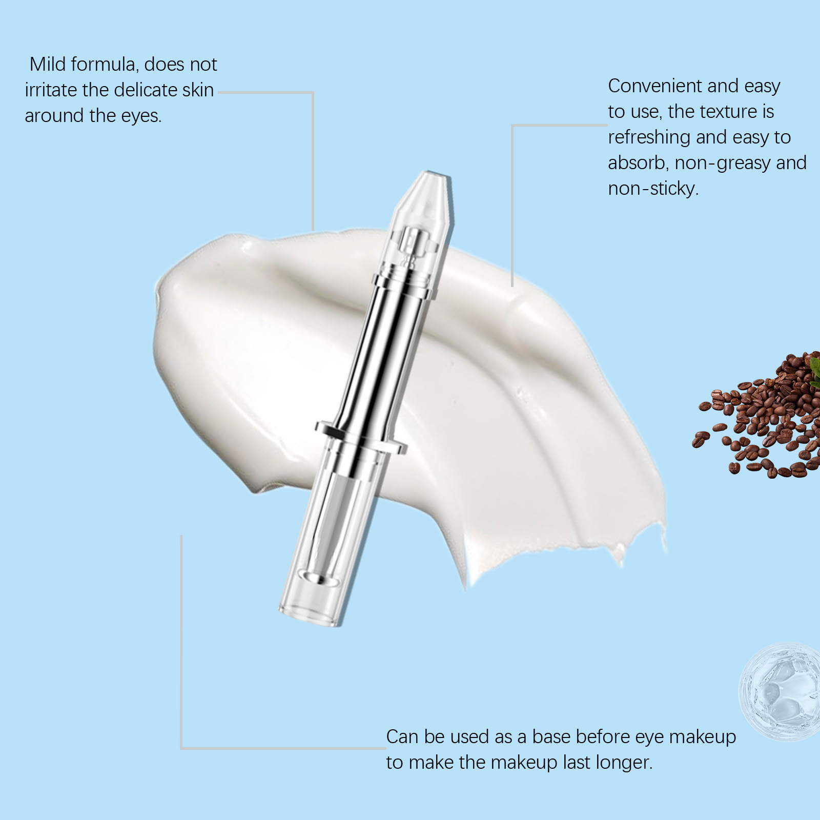 Our eye repair serum contains coffee seed extract, hydrolyzed collagen. It soothes puffiness and reduces bags under the eyes. Its application method is very simple: thoroughly clean and dry the face and the skin around the eyes, gently squeeze out the essence and evenly apply it to the skin around the eyes, and massage the end to promote better absorption. And can provide comprehensive eye care to meet the needs of different skin types.