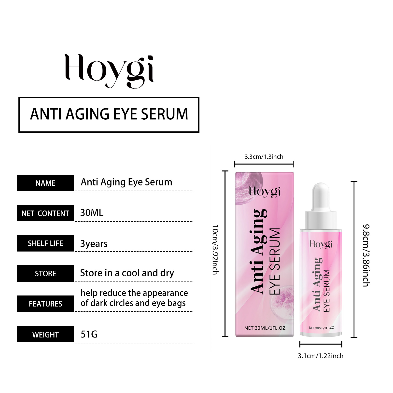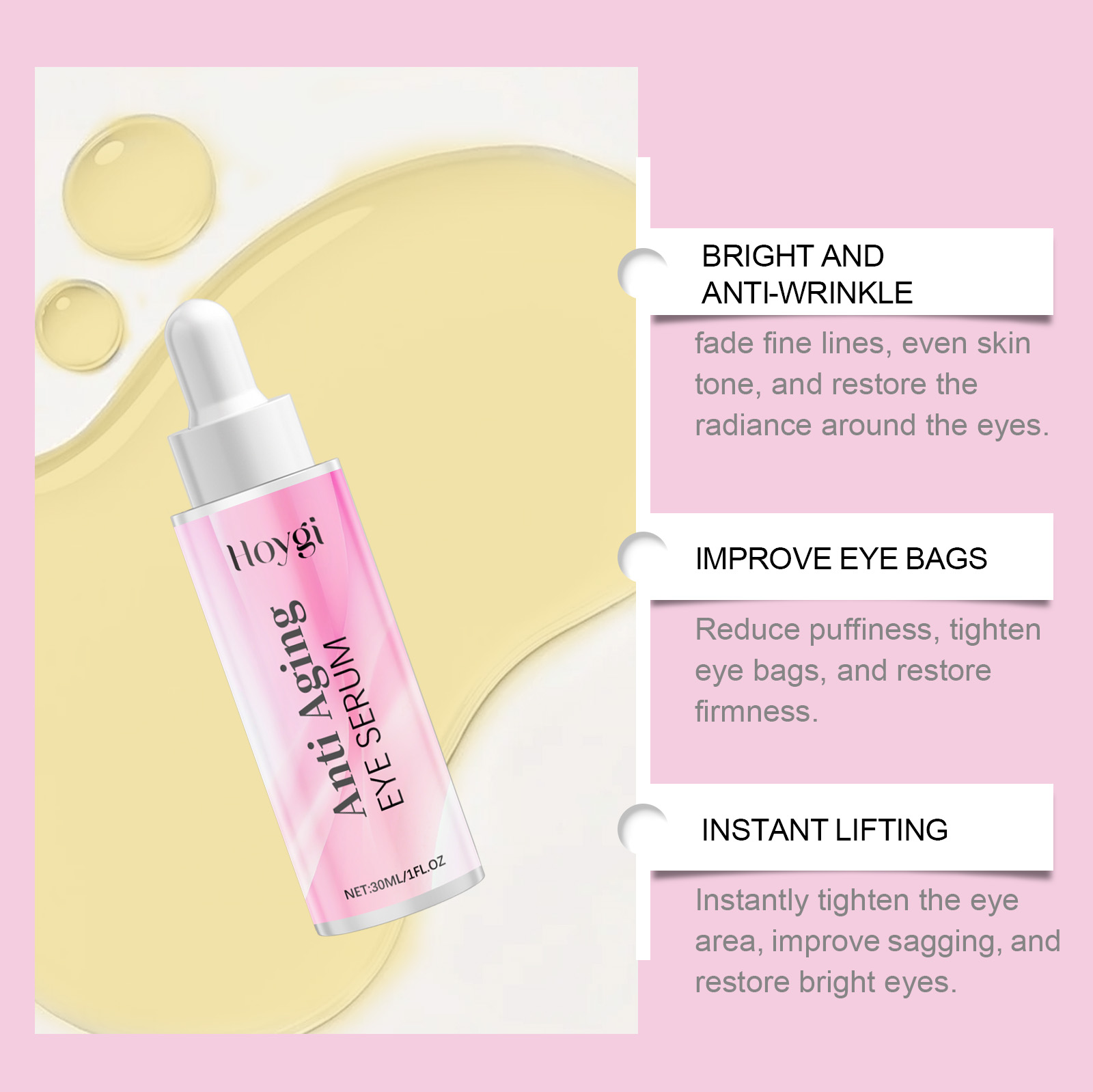 Our eye serum contains coffee seed extract, vitamin C(ascorbic acid), and hyaluronic acid. It immediately tightens the eyes, improves bags under the eyes, and restores bright eyes. Deep penetration provides adequate nutrition to the skin around the eyes. How to use it is simple: 1. Clean the skin around your hands and eyes. 2. Evenly apply appropriate amount of the product to the skin around eyes, gently massage the skin around eyes to promote absorption. Reshape skin contour and improve skin elasticity. It forms a moisture barrier, provides long-lasting moisture, and rejuvenates the skin around the eyes.