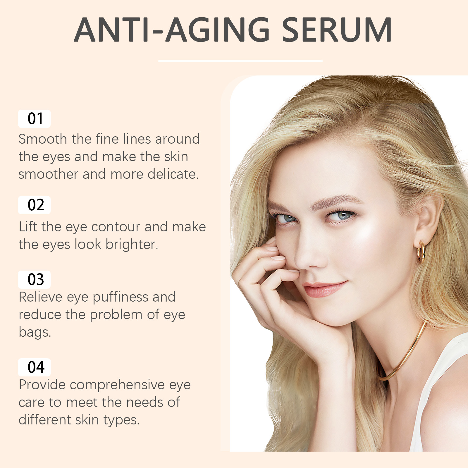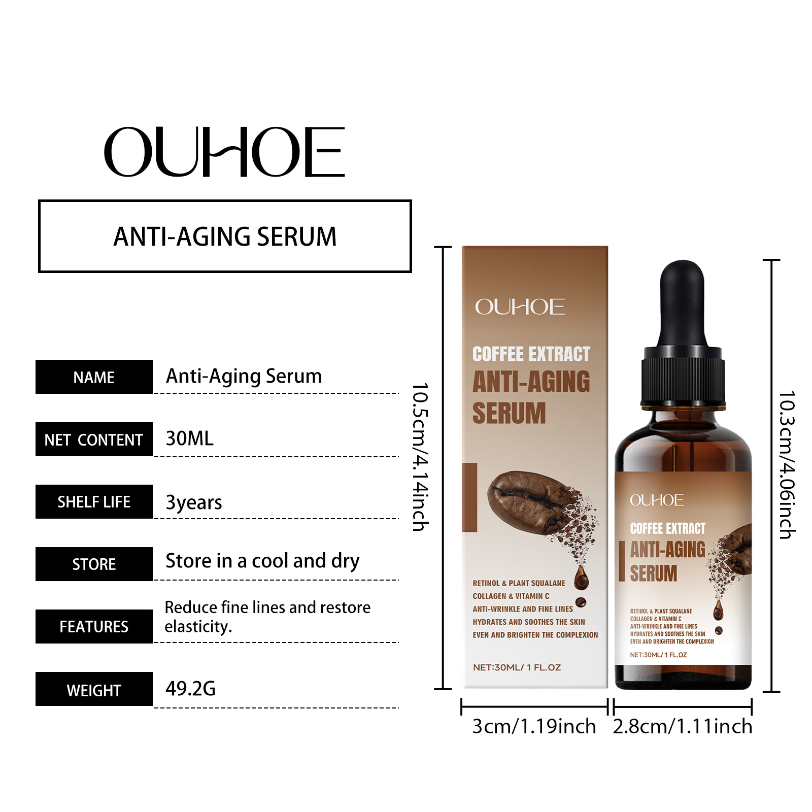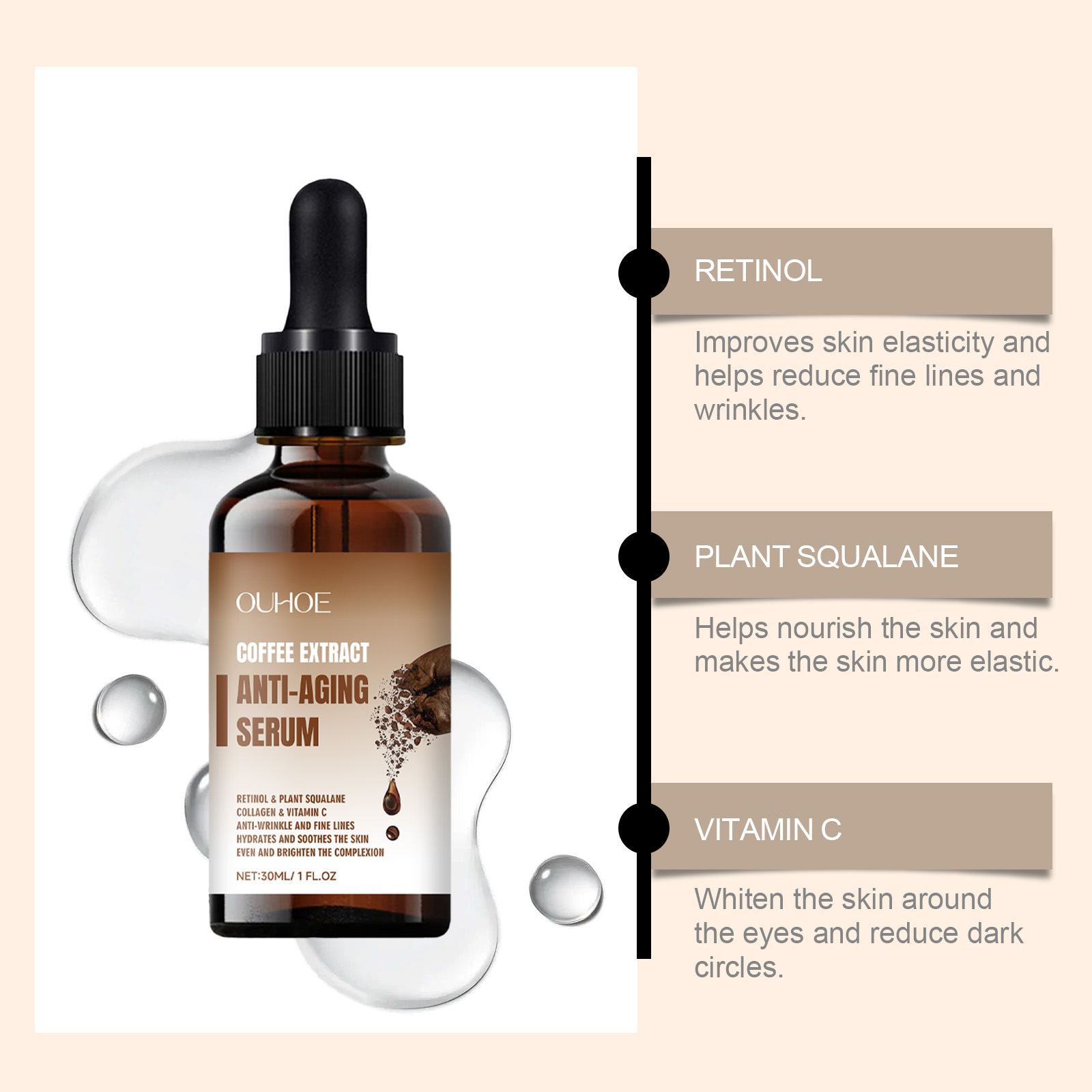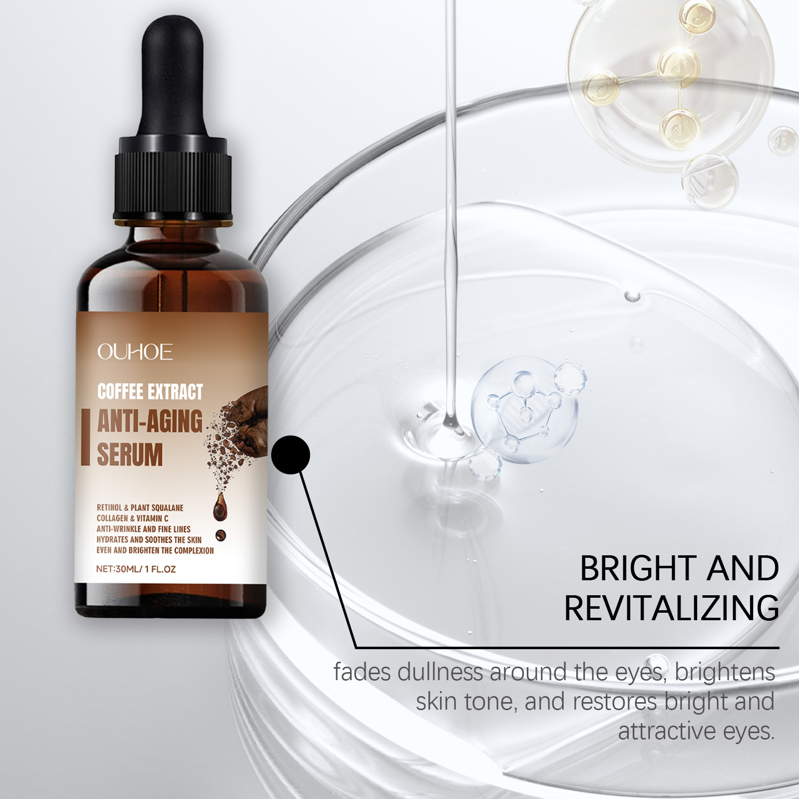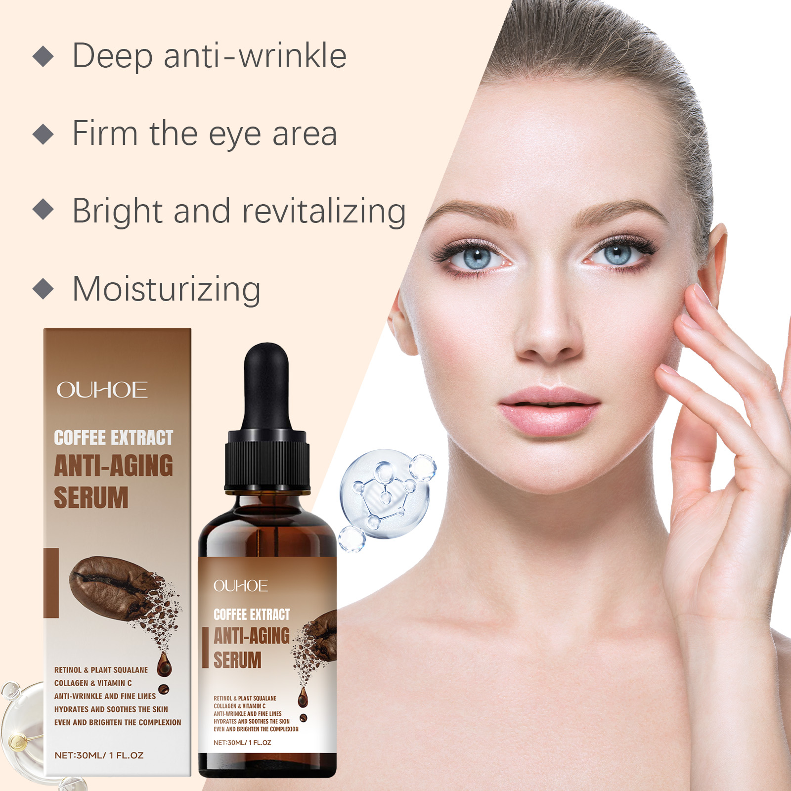 Our eye serum contains coffee seed extract and retinol. It can be uniquely formulated to penetrate deep into the skin and effectively reduce fine lines and wrinkles. Improve the elasticity of the eye skin, tighten the bags under the eye, and improve the black eye roll. Its application method is very simple: thoroughly clean and dry the face and eye skin, apply appropriate amount of this product evenly on the eye area, gently massage until completely absorbed. It can also reduce fine lines and restore elasticity.