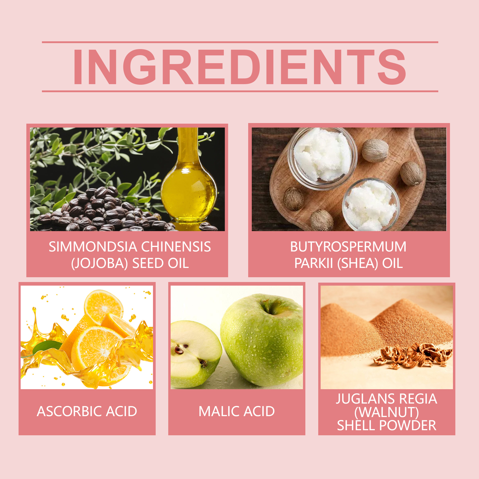 Our face whitening scrub contains Jojoba seed oil, shea butter and vitamin C. It removes dead skin cells and restores smooth skin. Moisturize the skin. Keep moisturized to prevent dryness. The way to use it is simple: 1. Clean your face and keep your face moist. 2. Apply an appropriate amount of scrub evenly to the face. 3. Gently massage the skin with the fingertips in a circular motion, focusing on the forehead, nose, chin and other T-shaped parts. 4. Rinse the scrub with warm water. Lighten dull skin tones and make skin more transparent.