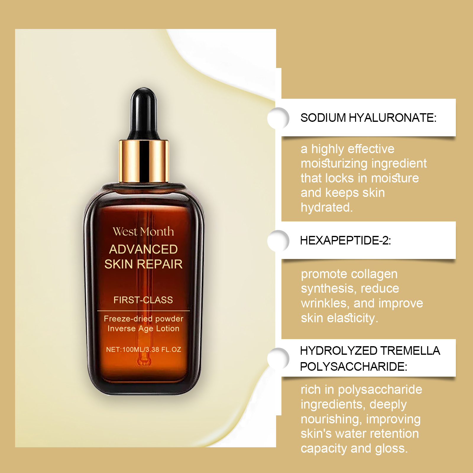 Our facial repair serum contains glycerin, hydroxyethyl cellulose and collagen. It can effectively fight wrinkles and promote skin regeneration. Its application method is very simple: clean and dry facial skin, apply an appropriate amount of essence evenly on the face, gently massage until absorbed. It can also improve skin elasticity and tighten contours.
