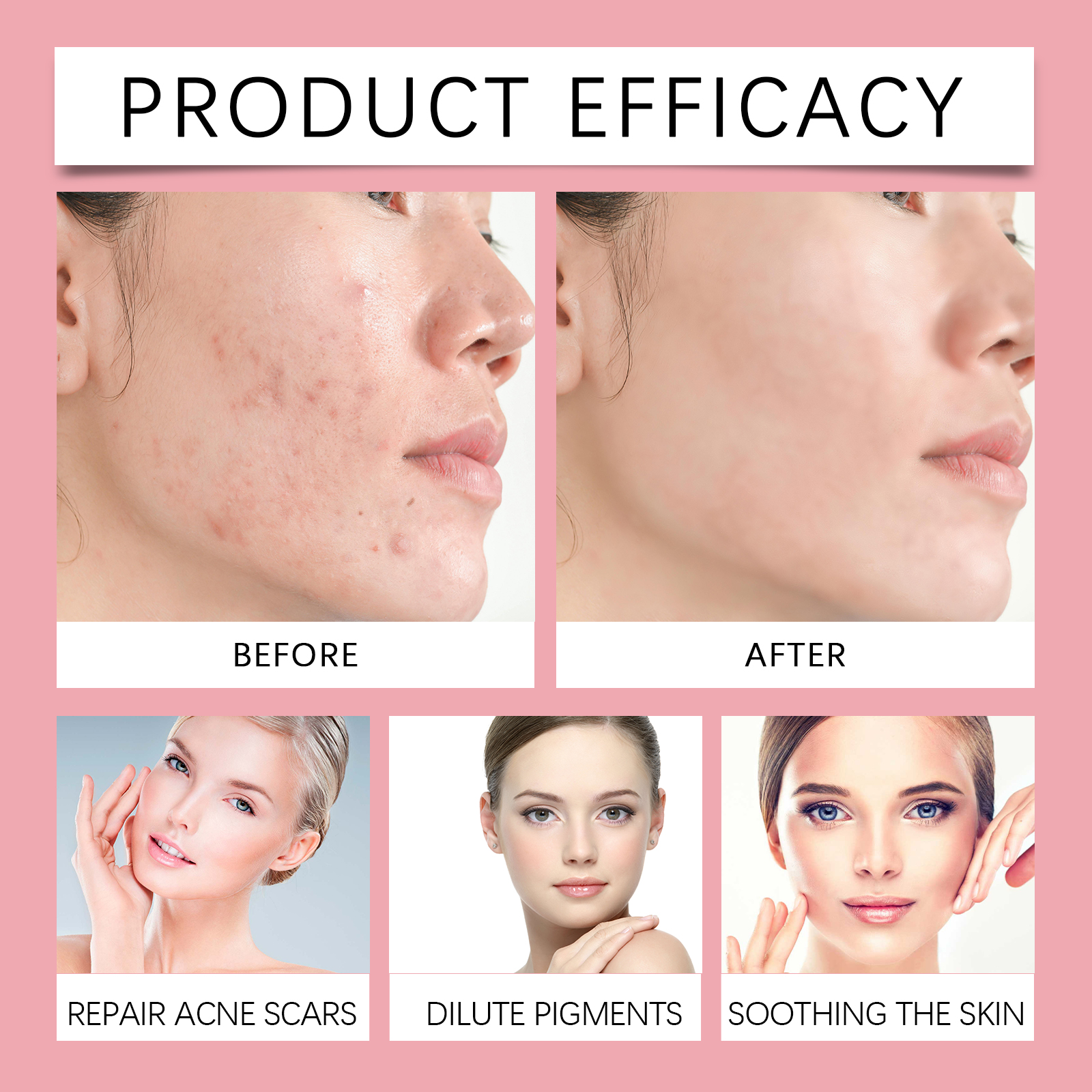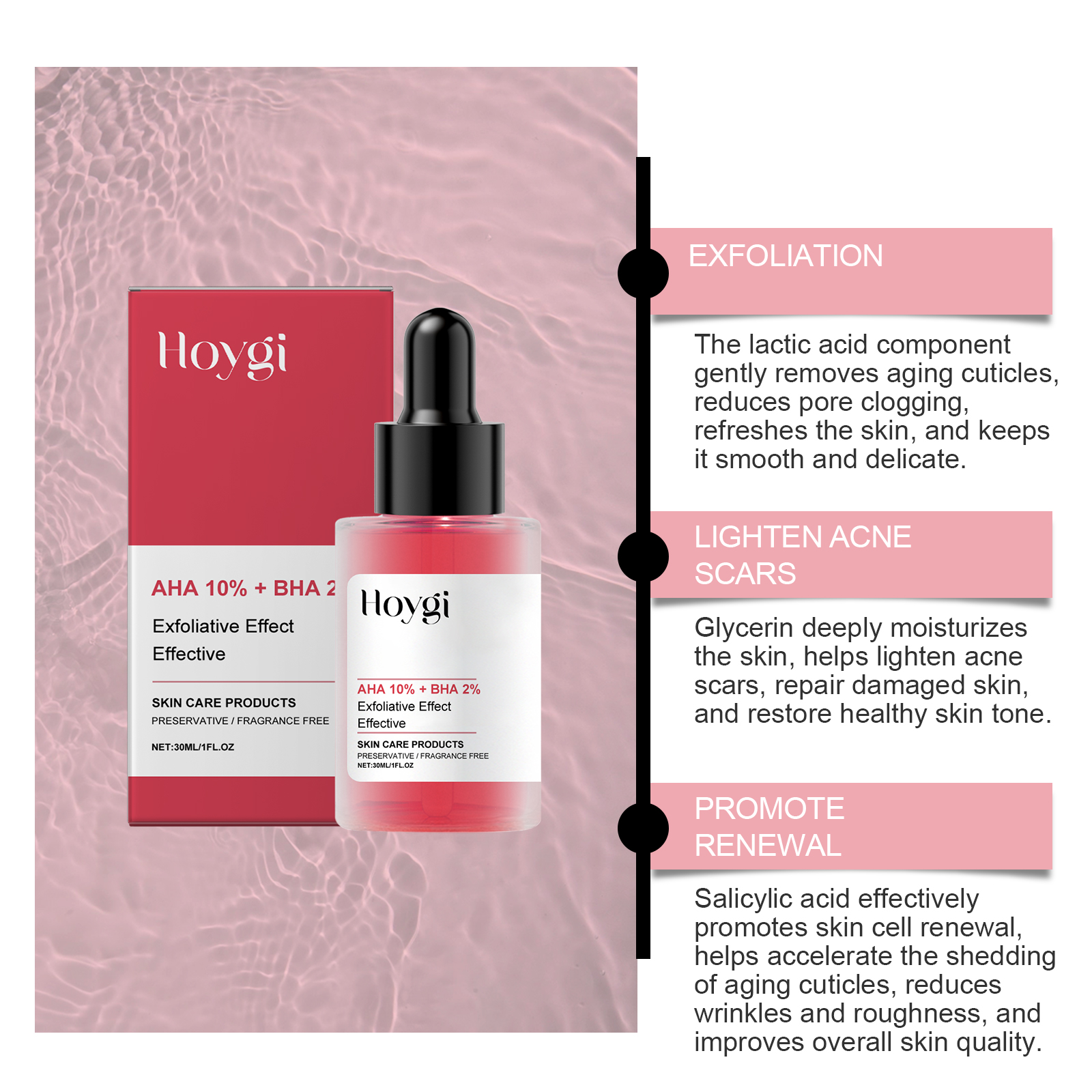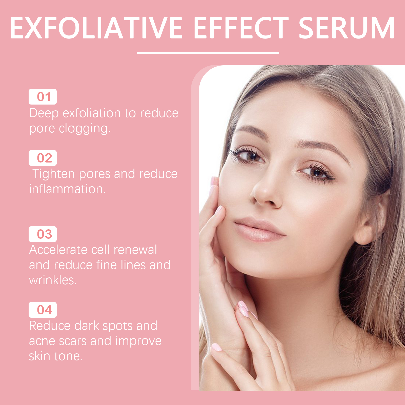 Our face serum contains glycerin, vitamin E (tocopherol). It can improve dark spots and dullness, resulting in a more even skin tone and radiant complexion. Its application method is very simple: clean facial skin, keep skin dry, apply appropriate amount of this product on facial skin, gently massage until absorbed. And can promote keratin metabolism, reduce the appearance of blackheads, acne.