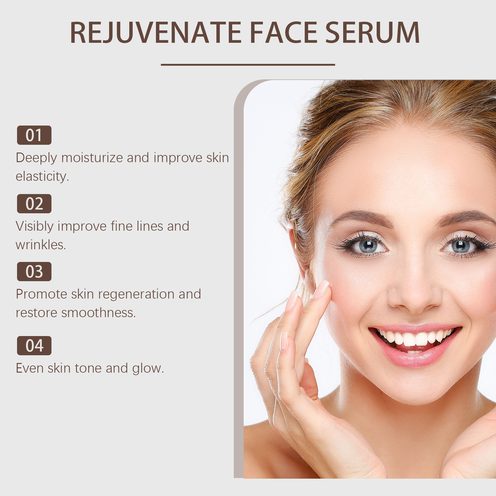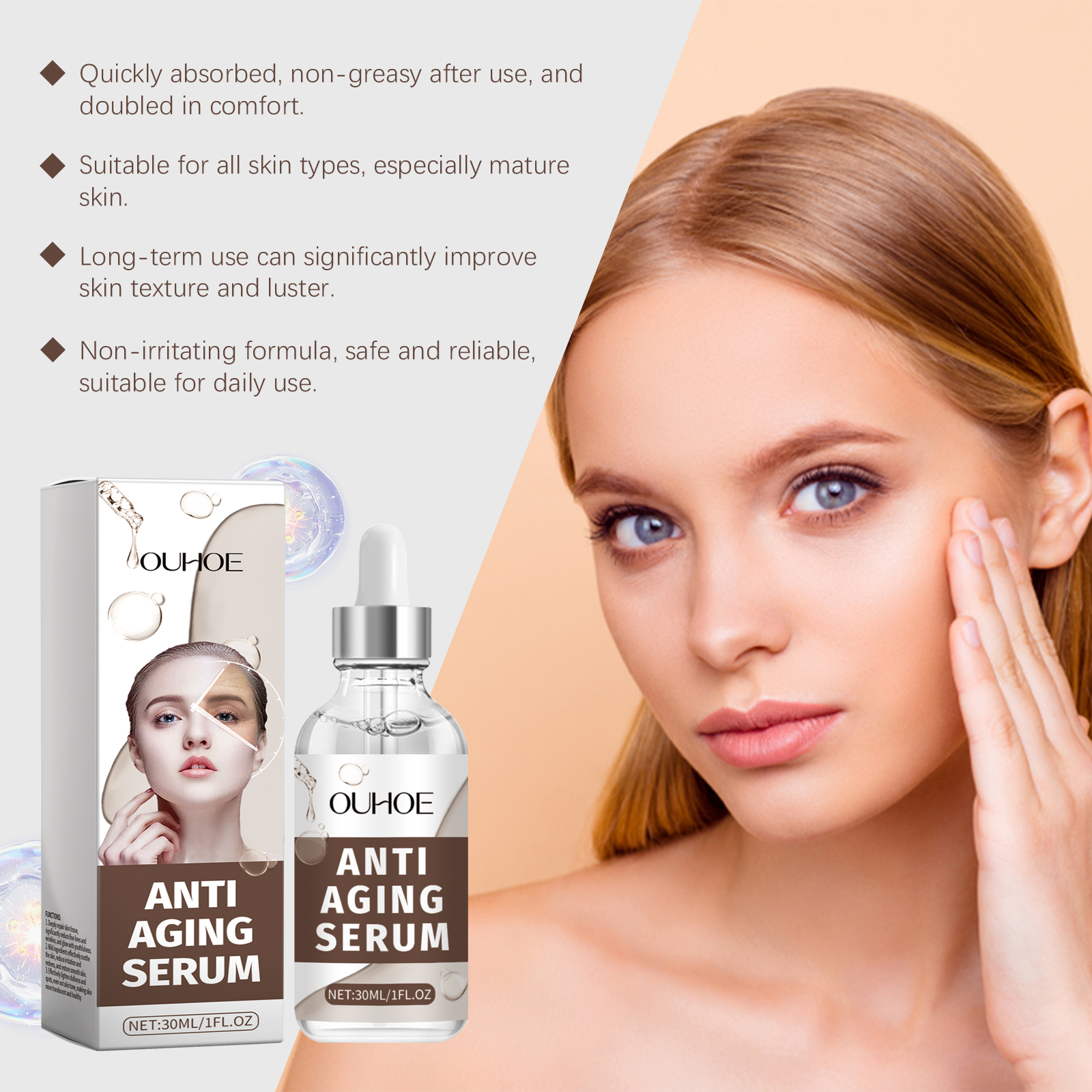 Our facial skin care serum contains niacinamide and retinol. It can improve fine lines and wrinkles and restore youthful vitality. Its use method is very simple: clean the facial skin, keep the skin dry, take an appropriate amount of essence, evenly apply on the face, gently massage to promote absorption. It can also provide lasting moisture to the skin and improve skin elasticity.
