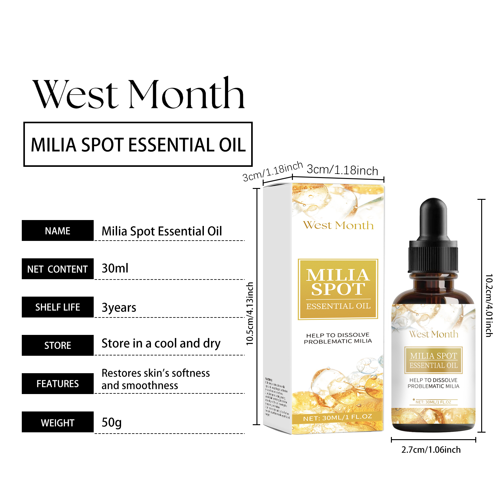 Our anti-freckle miliary essential oil contains rose oil and lemon extract. It deeply moisturizes and leaves skin supple and plump. Its application method is very simple: clean and dry facial skin, take appropriate amount of this product, evenly apply it to the skin around the belly button, gently massage until absorbed. It also keeps skin soft, prevents dryness, and strengthens the moisturizing barrier.