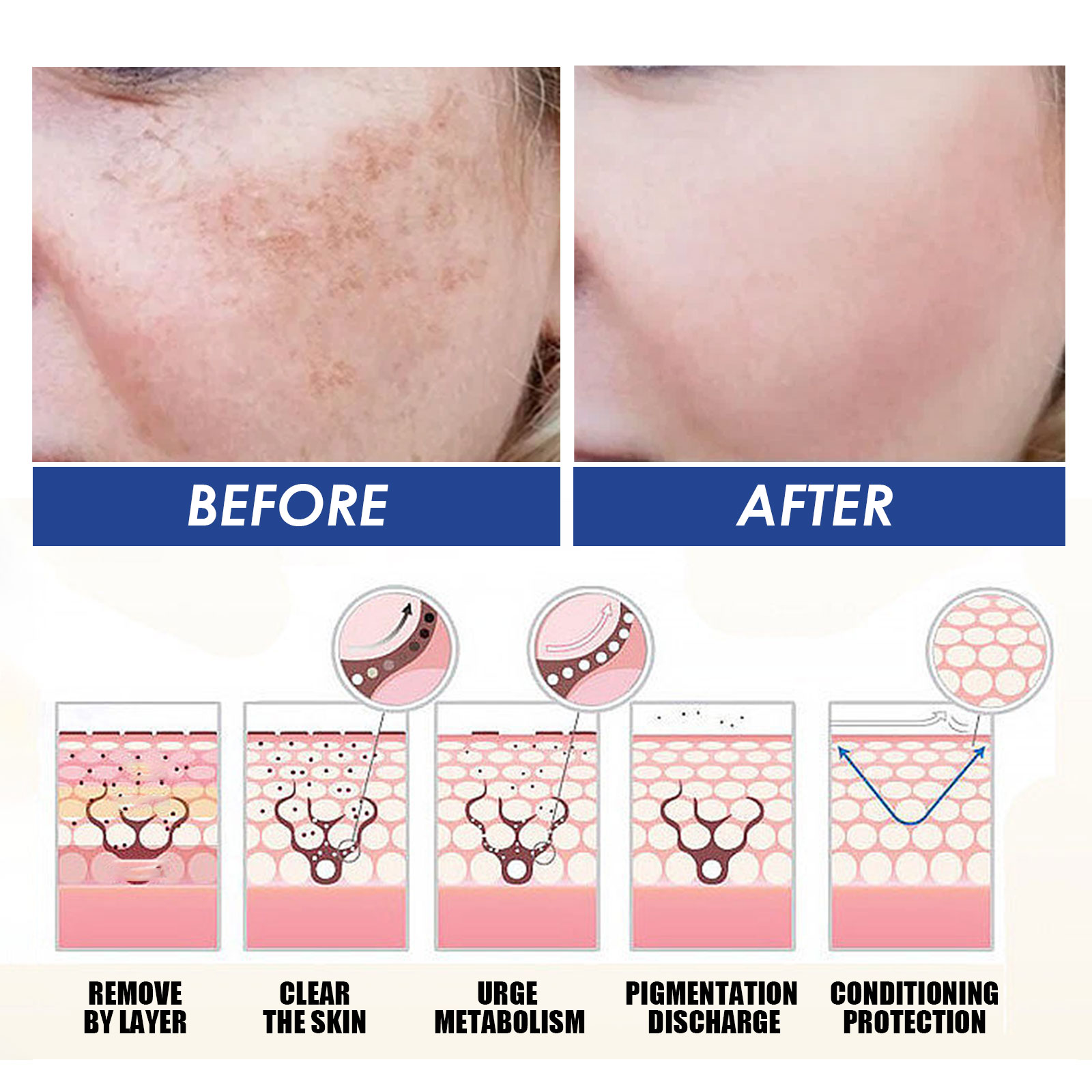 Our facial treatment serum contains glycerin, carbomer. It can inhibit dark spots, crush melanin, light and non-sticky, gently brightening facial skin, suitable for various skin types; Cleans skin, speeds up metabolism, hyperpigmentation. Its use method is very simple: after cleansing and toning, take appropriate amount of essence evenly apply to the face skin, gently massage with your hand until absorbed. Use it daily for better results. Reduce dark spots, reduce hyperpigmentation, improve uneven skin tone, deep moisturizing, nutritional repair.