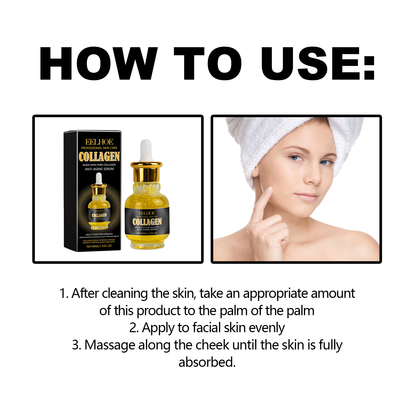 Our facial serum contains hydroxyethyl cellulose, sodium hyaluronate, collagen. It can slow the process of skin aging and fine lines and wrinkles, make skin look younger and firmer, even out skin tone, reduce dull skin and make skin look brighter and smoother. Its application method is very simple: after cleaning the skin, take appropriate amount of this product in the palm, evenly apply to the face skin, massage along the cheeks until the skin is completely absorbed. It can deeply moisturize the skin, reduce dryness and roughness, and keep the skin hydrated. The ingredients are mild and suitable for all skin types, including sensitive skin.