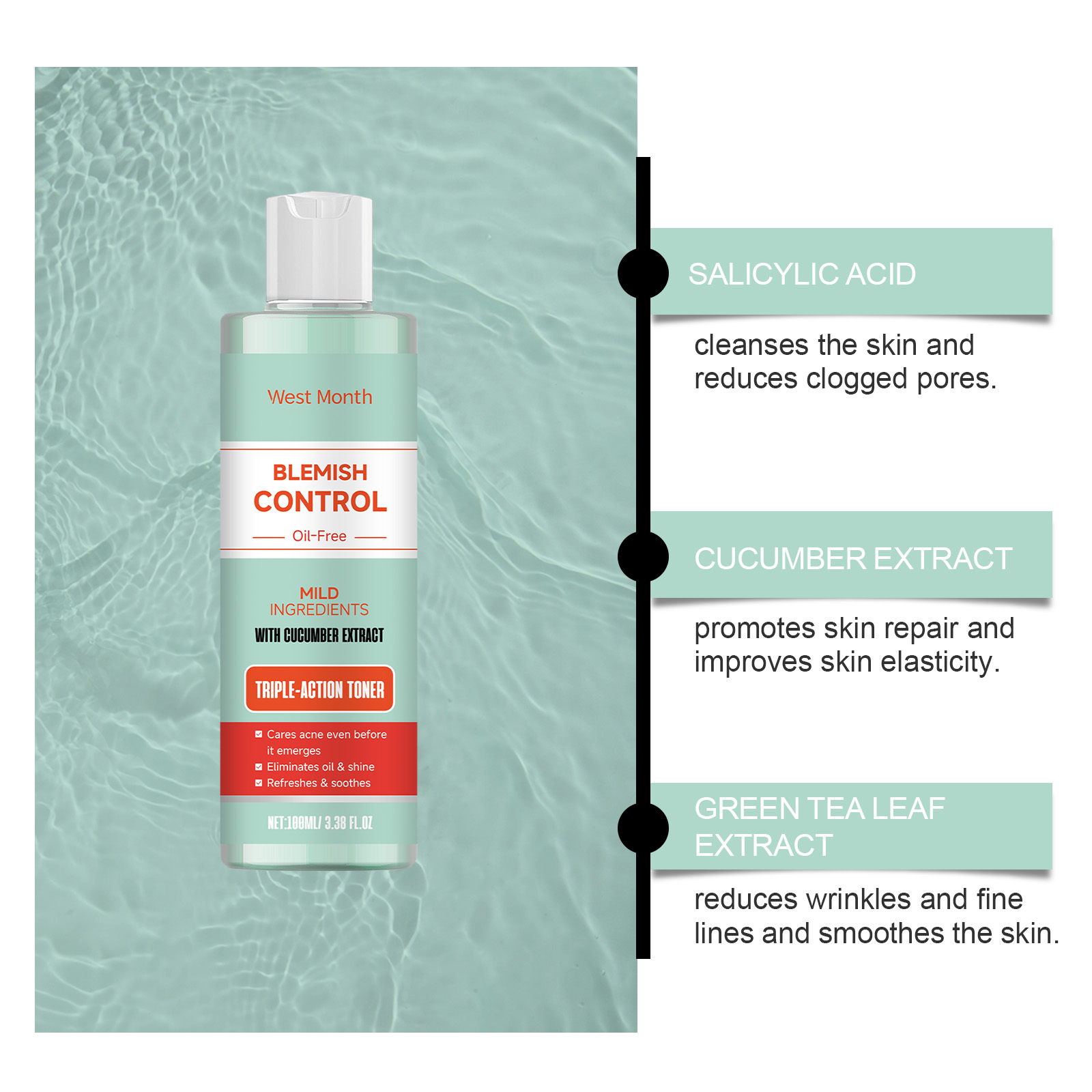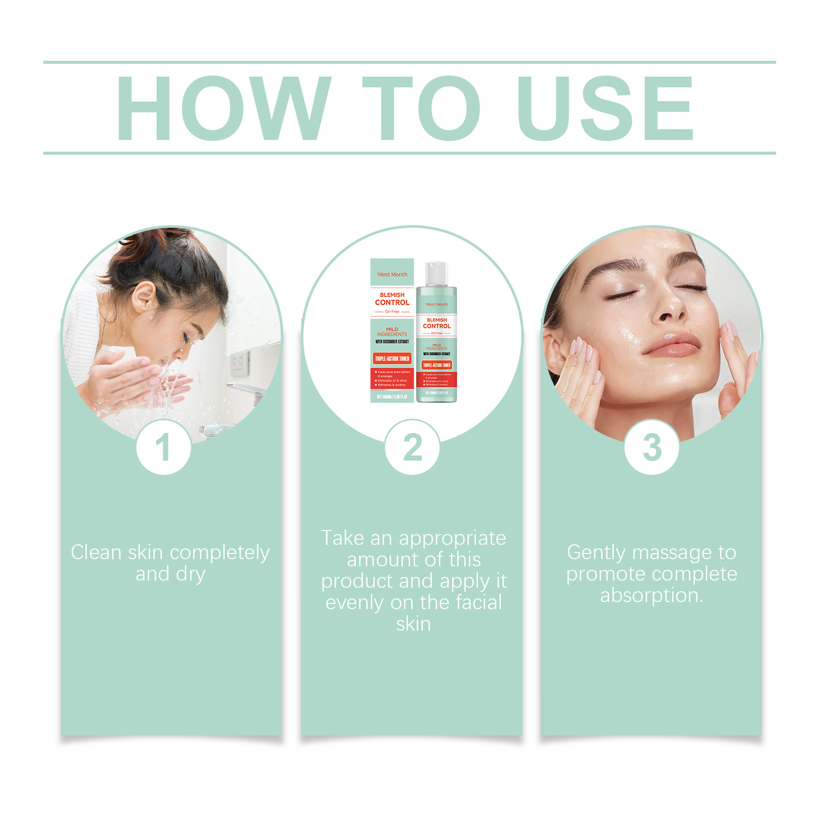Our facial toner contains green tea extract, hyaluronic acid. It can help remove excess impurities and cleanse the skin. Its application method is very simple: thoroughly clean the skin and dry it, apply appropriate amount of this product evenly on the face skin, gently massage to promote complete absorption. And can effectively remove acne and closed acne, improve skin roughness.
