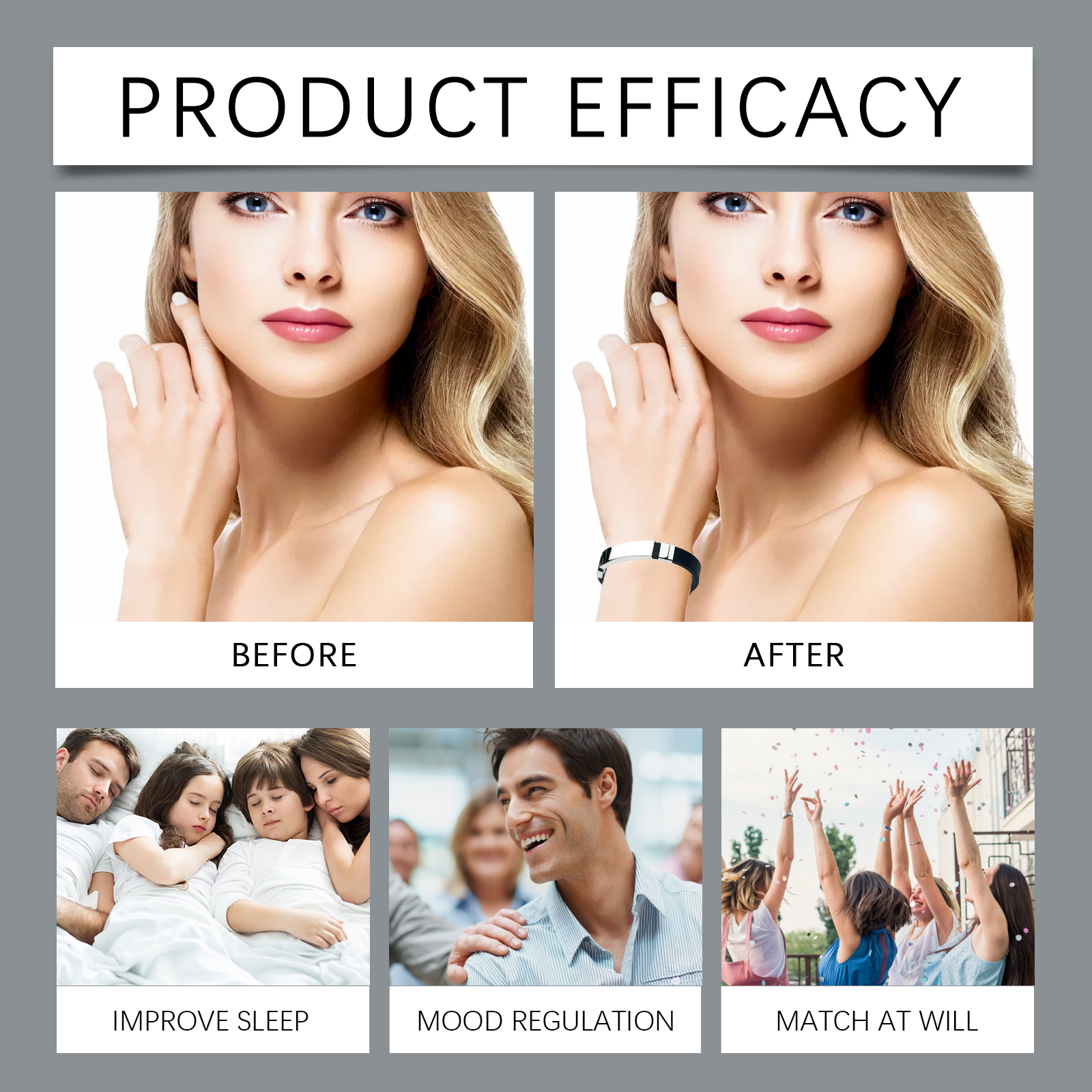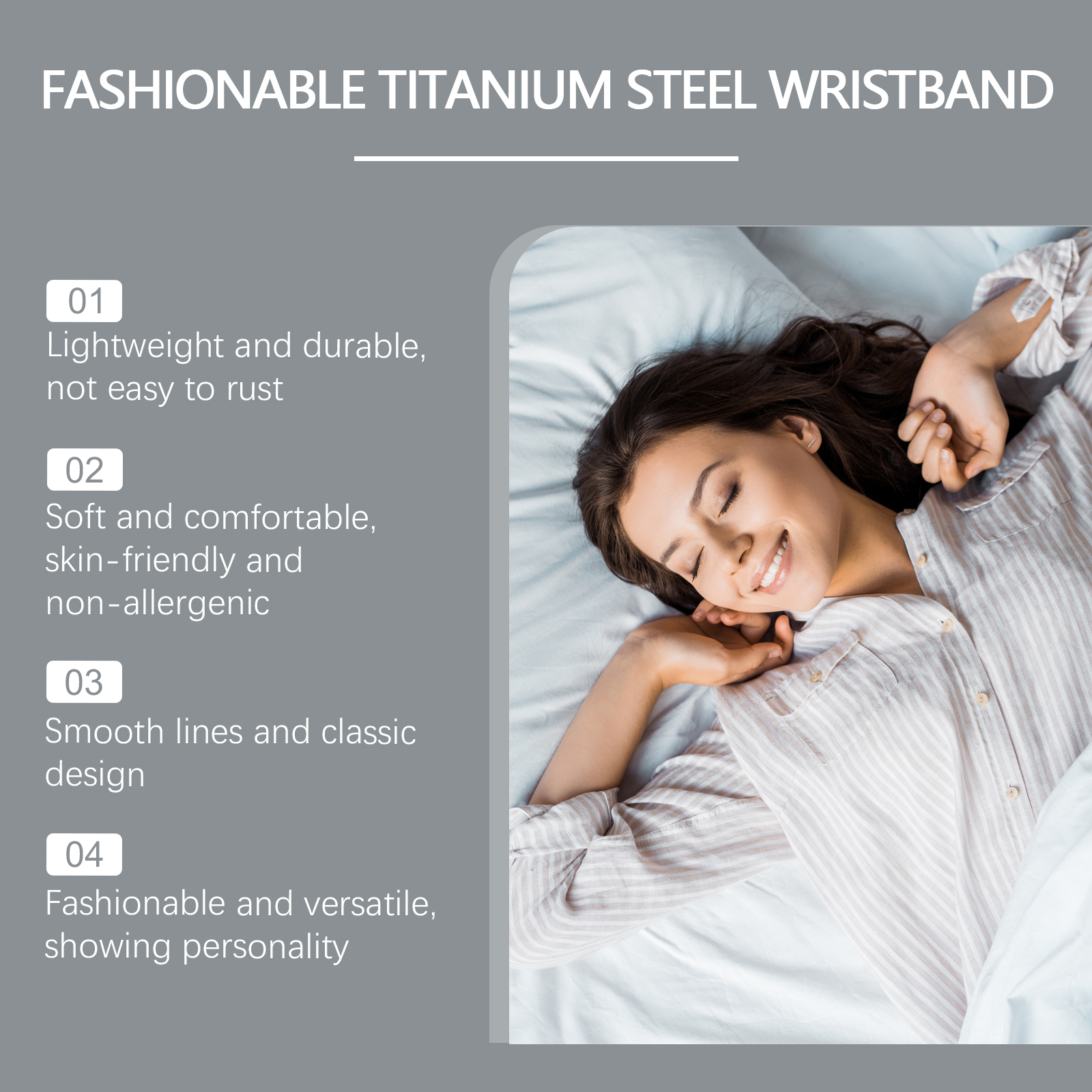 Our fashionable titanium bracelet contains titanium steel, silicone, it can make people relax and conducive to sleep. Its use is simple: simply wear the product directly on your wrist. And can promote blood circulation, good health. Helps regulate emotions and maintain a good state of mind.