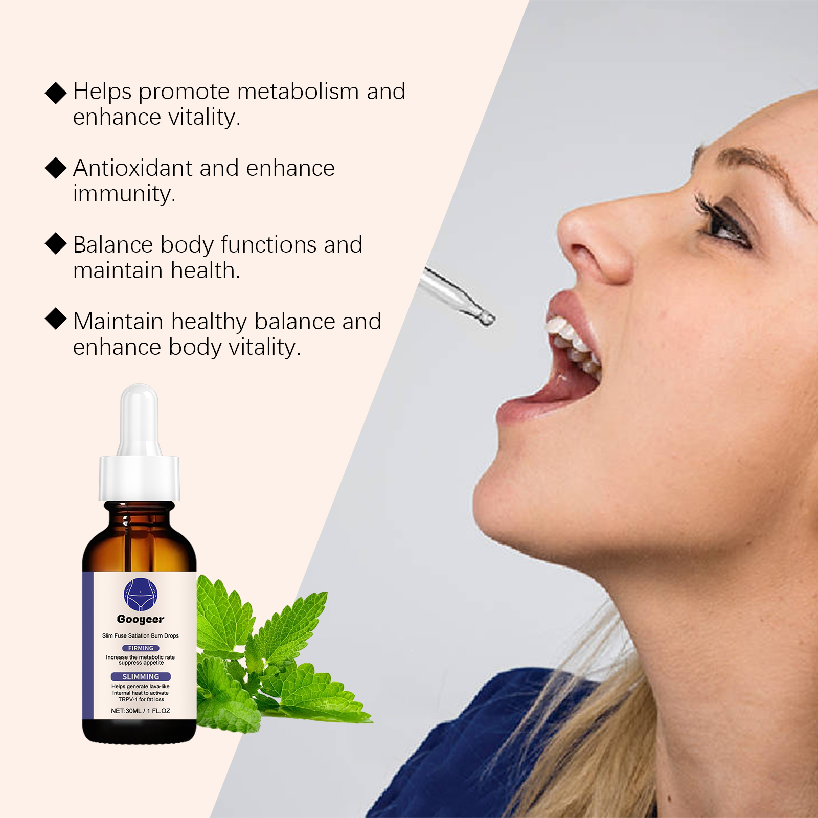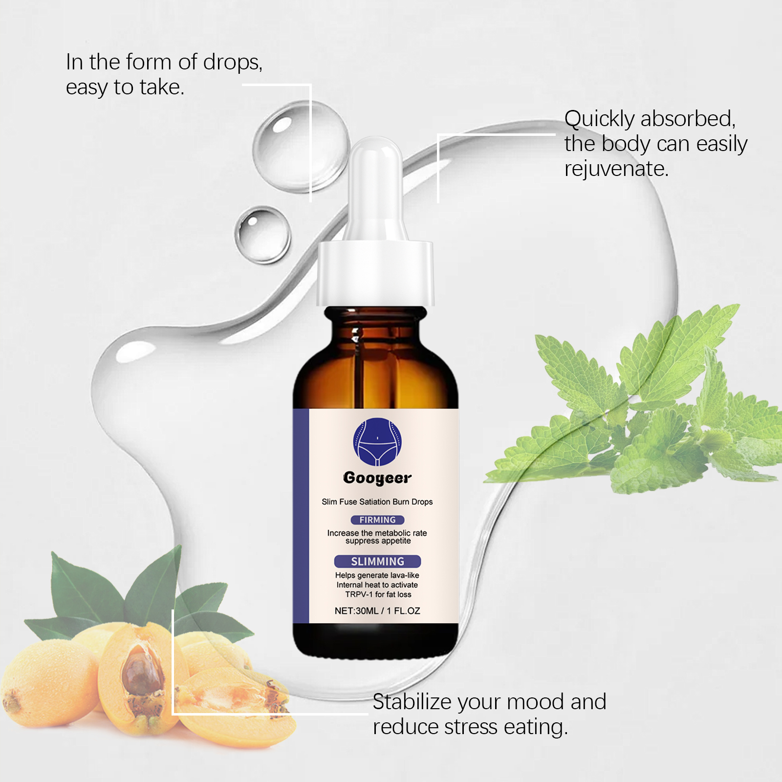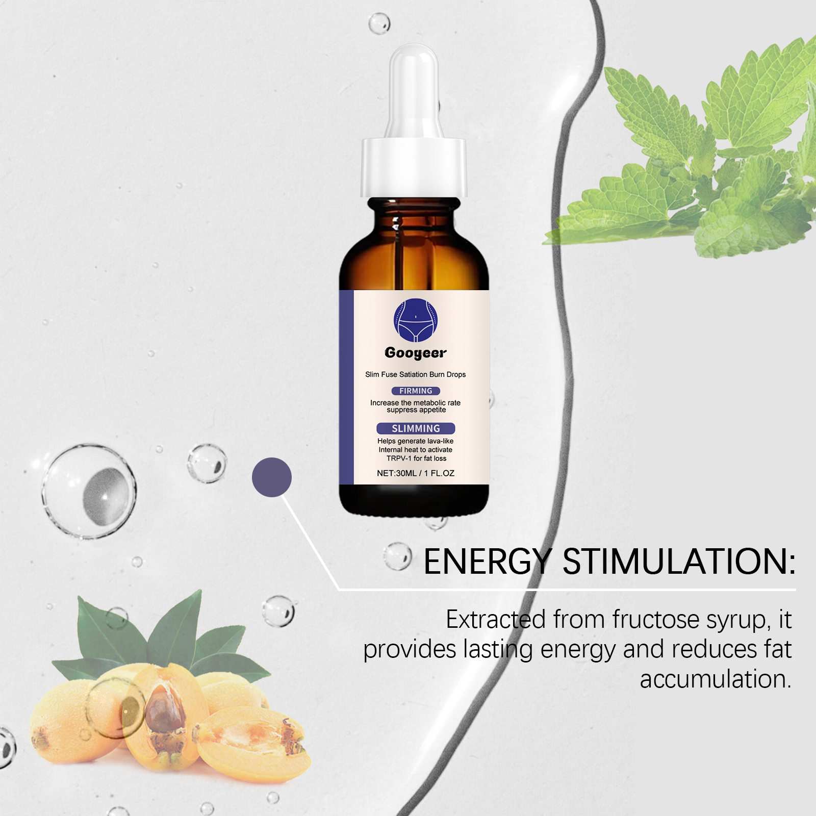 Our fat burning drops contain loquat extract, mint leaf extract. It balances blood sugar levels, reduces fat synthesis, and provides the body with a stable source of energy. The way to use it is simple: shake it well before eating, 1-2 drops at a time, and take it 1-2 times a day. And can be a multi-ingredient, comprehensive nutritional supplement.