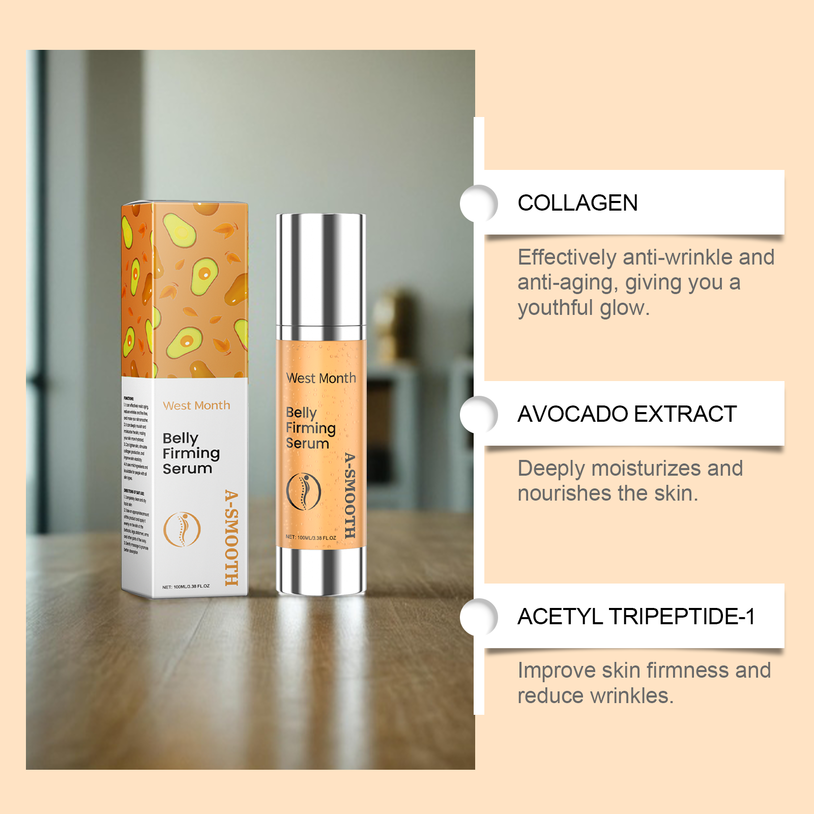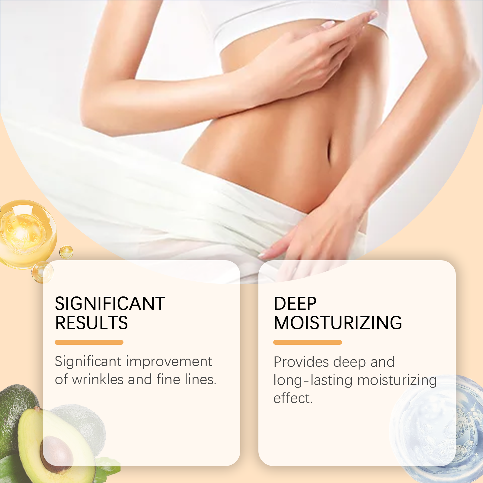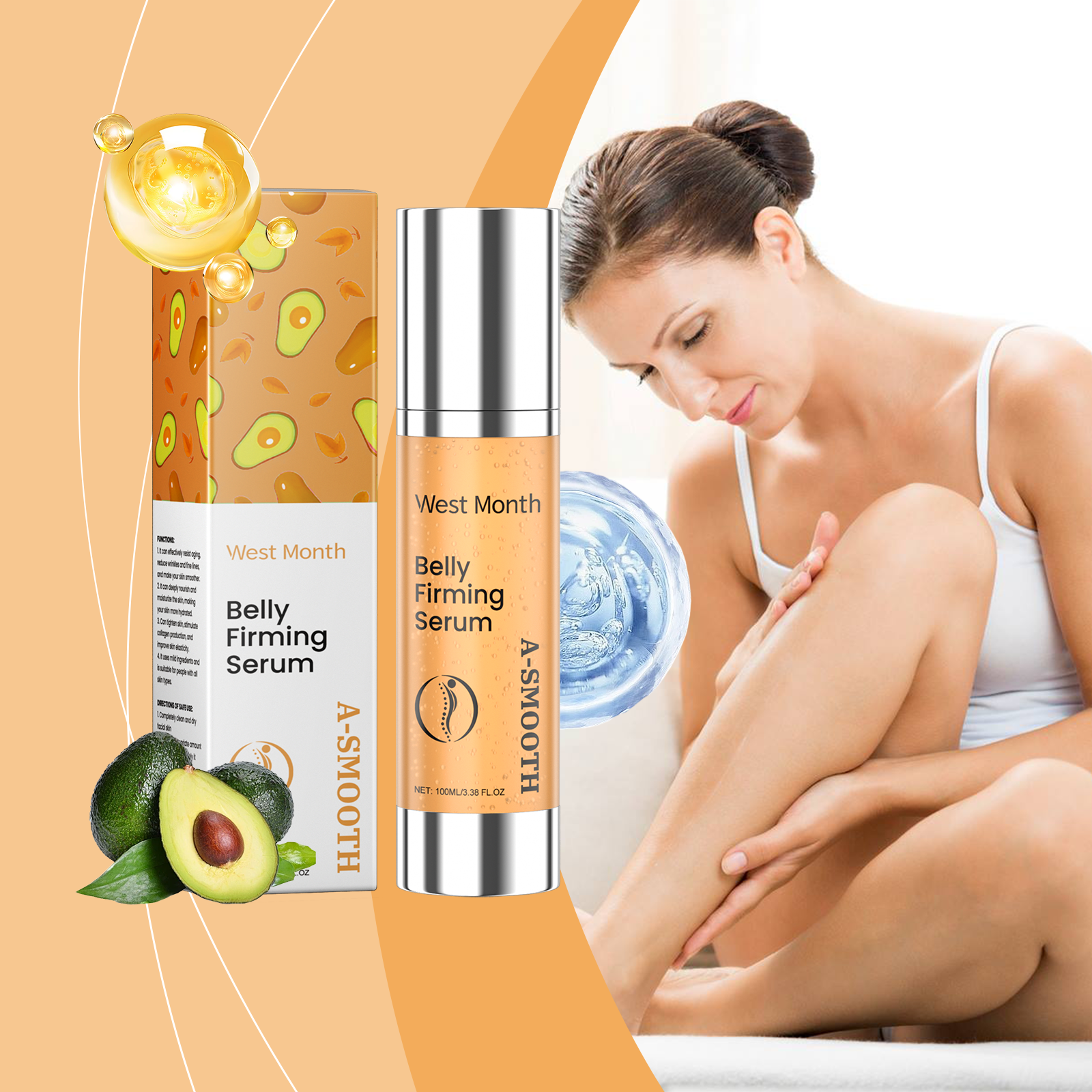 Our firming treatment essence contains avocado extract, shea butter, collagen. It can significantly improve wrinkles and fine lines. Provides deep and long-lasting moisturizing effect. Its application method is simple: 1. Thoroughly clean and dry facial skin. 2. Usage: Apply appropriate amount of the product evenly on the buttocks, legs, abdomen, arms and other skin; 3. Massage gently to promote better absorption. Enhance skin elasticity and rejuvenate. Use mild ingredients, safe and non-irritating.