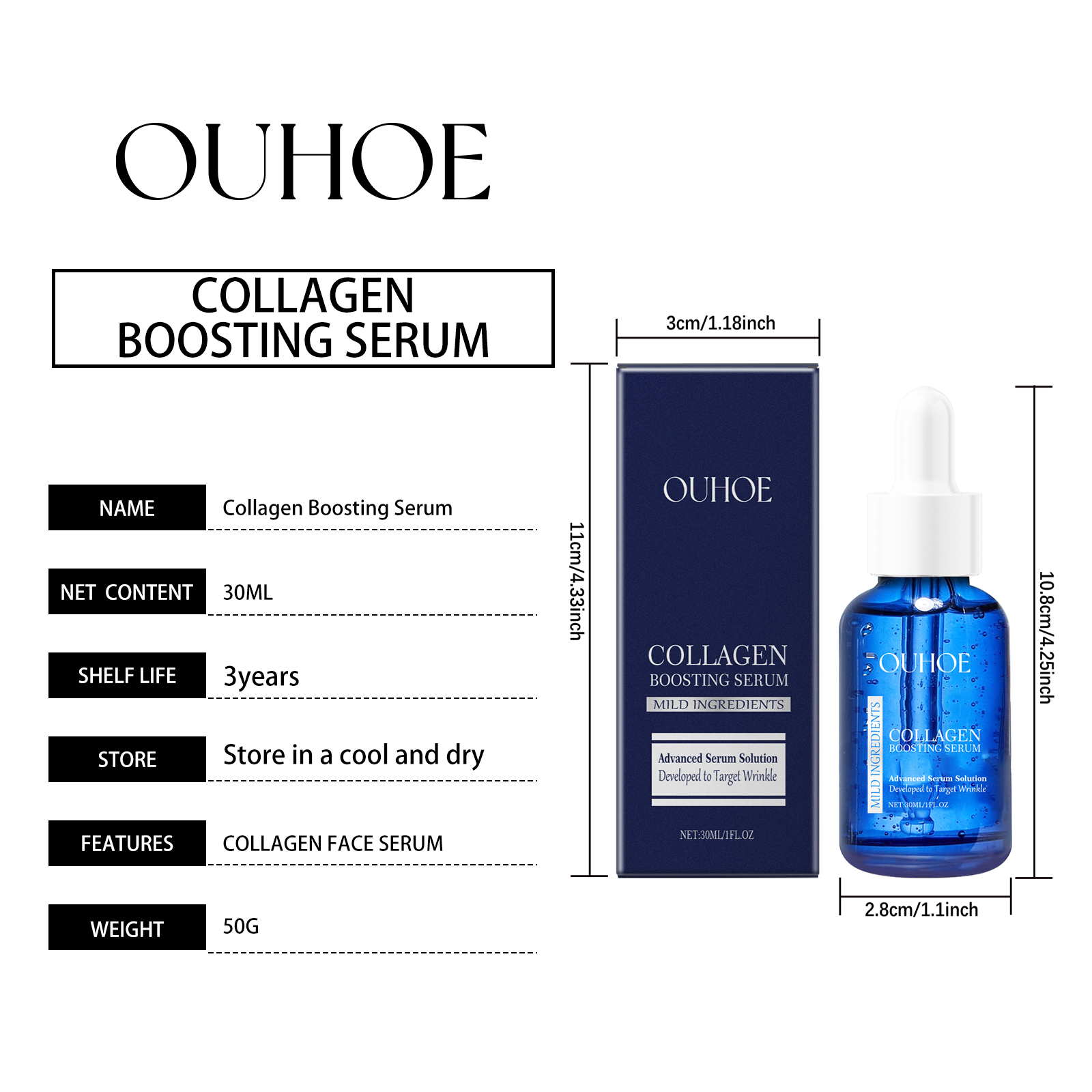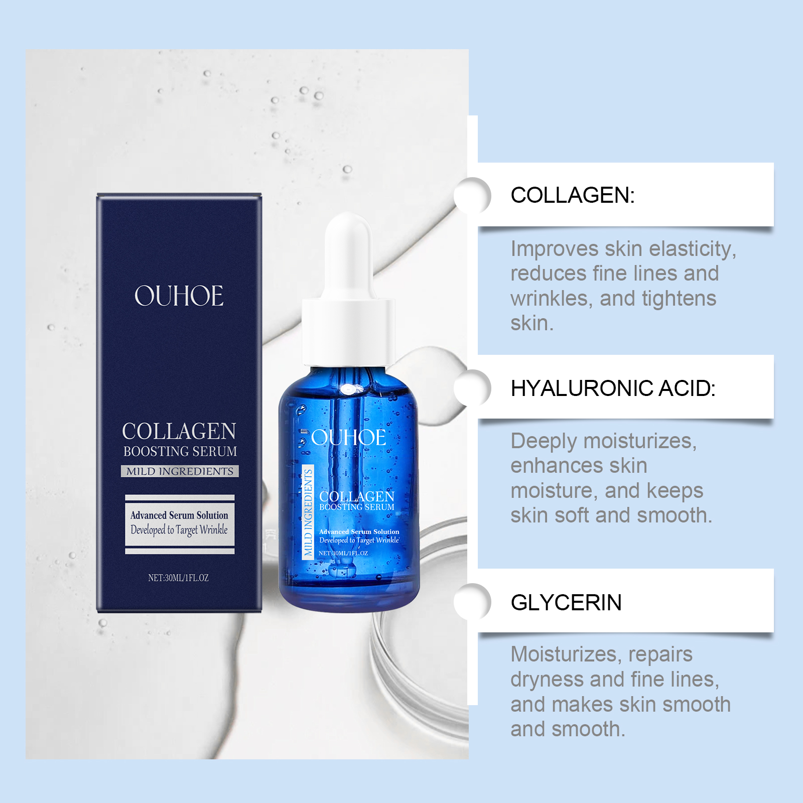 Our firming serum contains glycerin, vitamin E (tocopherol). It locks in moisture and provides an adequate supply of moisture to the skin: leaving the skin looking softer and smoother. Its application method is very simple: clean facial skin, keep skin dry, apply appropriate amount of this product on facial skin, gently massage until absorbed. It can deeply moisturize and repair fine lines caused by dryness, leaving skin smooth and delicate, and restoring youthful luster.