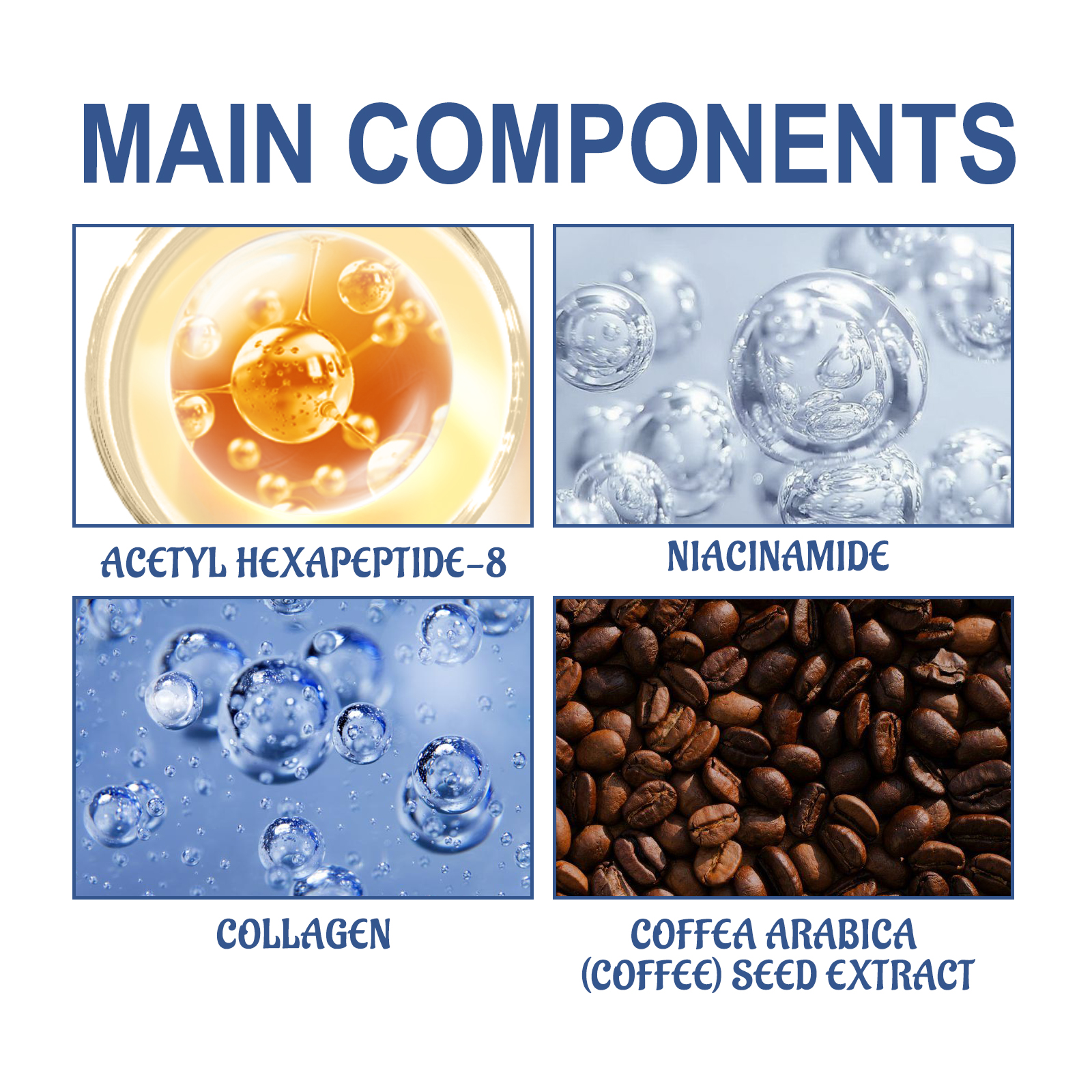 Our firming eye gel contains acetyl hexapeptide-8, coffee extract. It can eliminate eye puffiness, anti-blue light, moisturize eyes, anti-liner, relieve dark circles. Its application method is very simple: after cleansing and toning, take a mung bean-sized eye cream on the fingertips, evenly apply it to the skin around the eyes, and gently massage with the fingertips to absorb it. And users can experience a tighter eye area. Improve eyelid appearance, pay attention to fade dark circles.