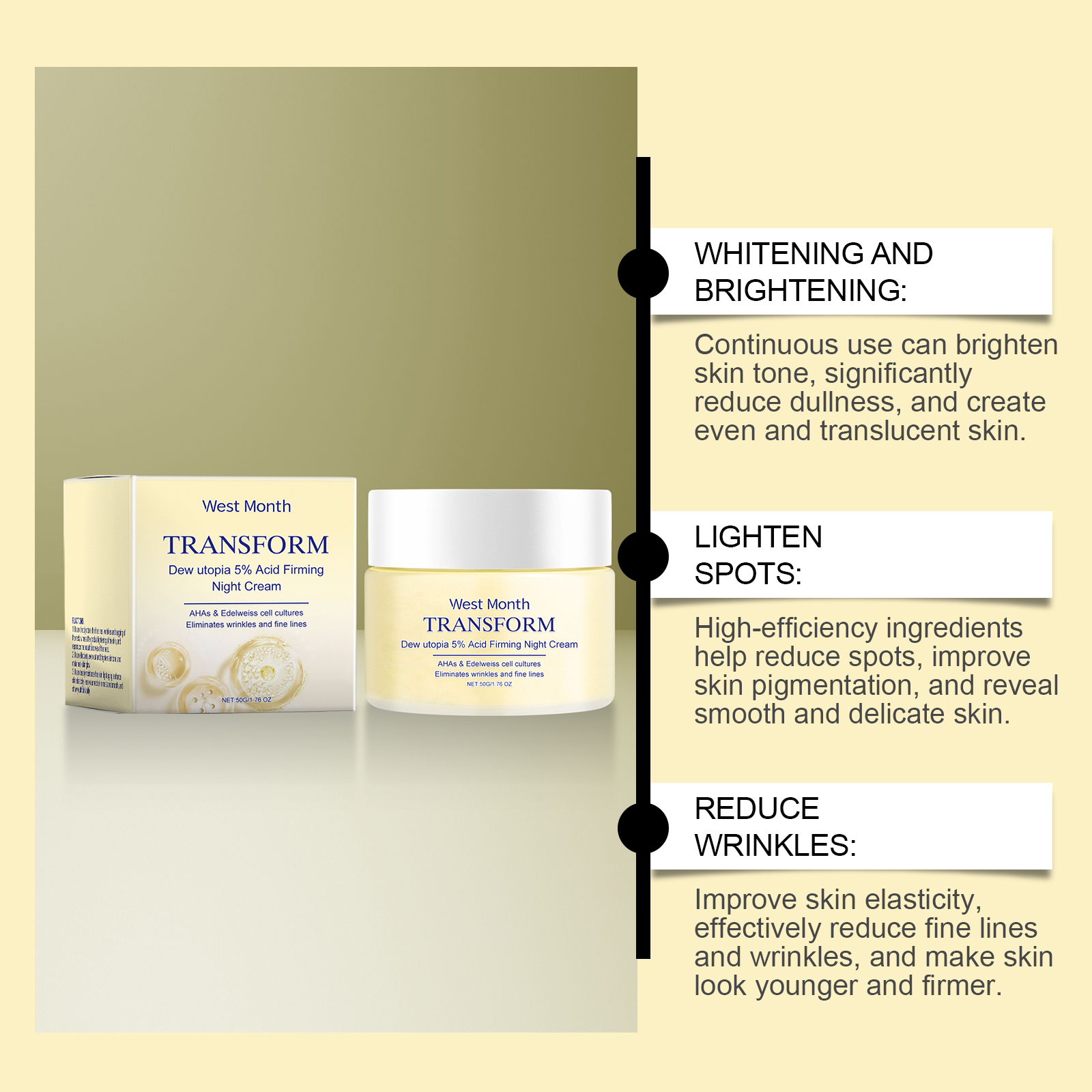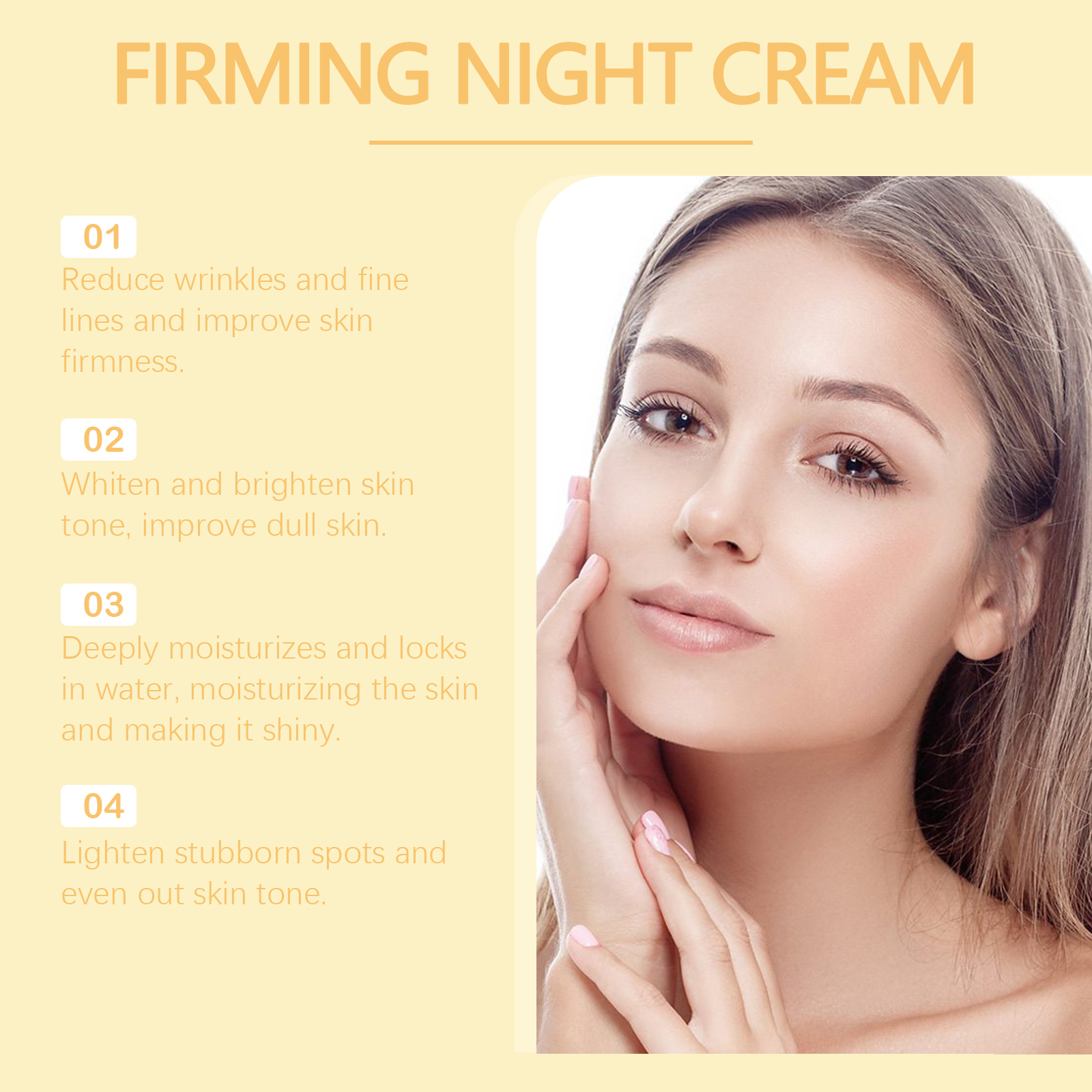 Our firming cream contains acetyl tripeptide-1 and arbutin. It can boost collagen production, help repair damaged skin, and improve elasticity. Its application method is very simple: completely clean dry facial skin, apply appropriate amount of this product evenly on facial skin, gently massage to promote better absorption. And can improve the texture of the skin, create a smooth skin.