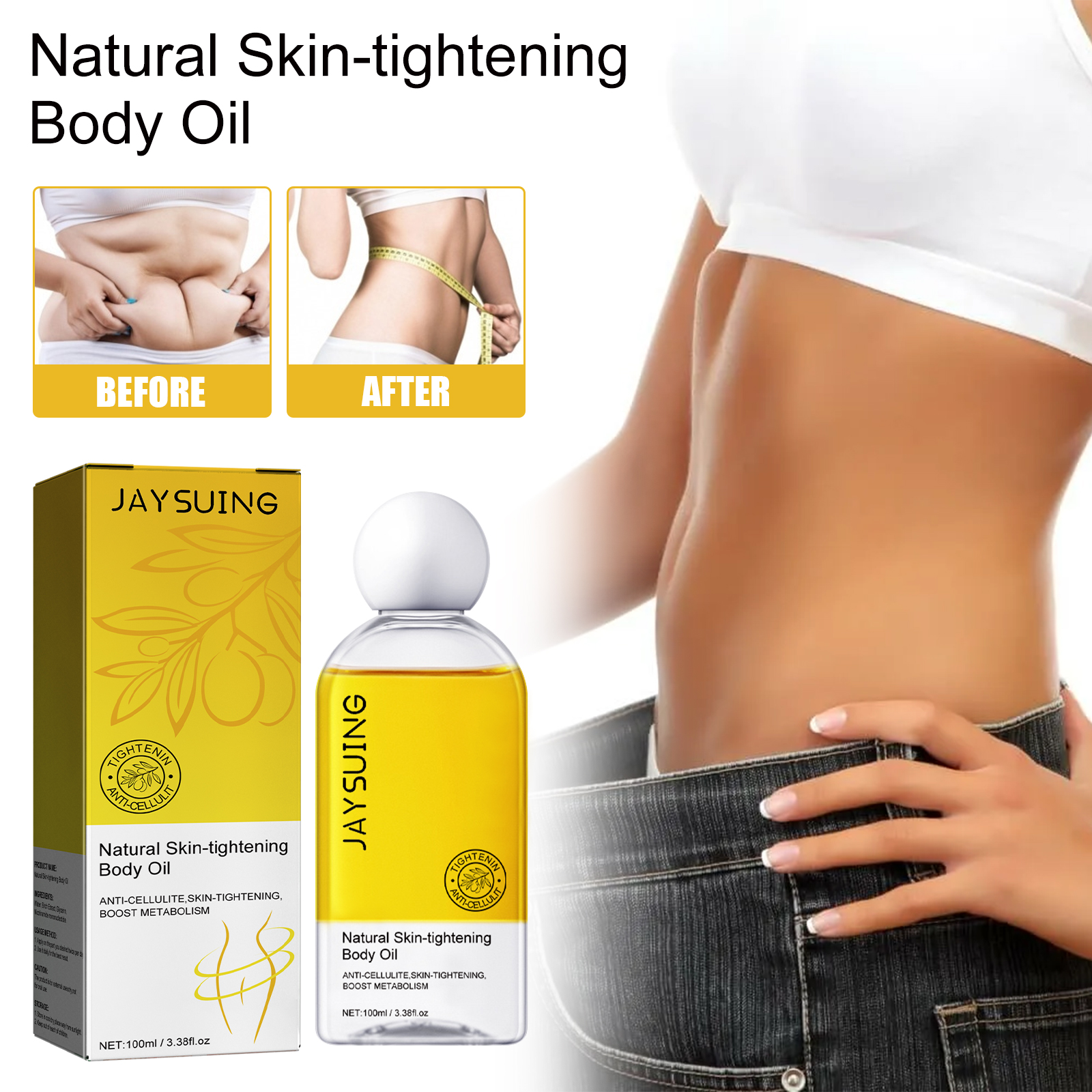 Our firming Skin Body oil contains birch extract, nicotinamide mononucleotide, glycerin. It can promote metabolism, decompose fat, absorb fast, not greasy, moisturize the skin, easy to apply, non-sticky, moisturize and nourish the skin, stimulate metabolism and remove excess water in the tissue; Helps the body grow new skin cells, and also has the ability to regenerate connective tissue; Helps the body eliminate cholesterol, reduces fat tissue and blood pressure. The way to use it is simple: apply it to the desired area twice a day; Use daily for best results. Firming Skin Body oil boosts the metabolism of the applied area and helps to break down and remove fat deposits from the skin, leaving your body smoother and firmer.