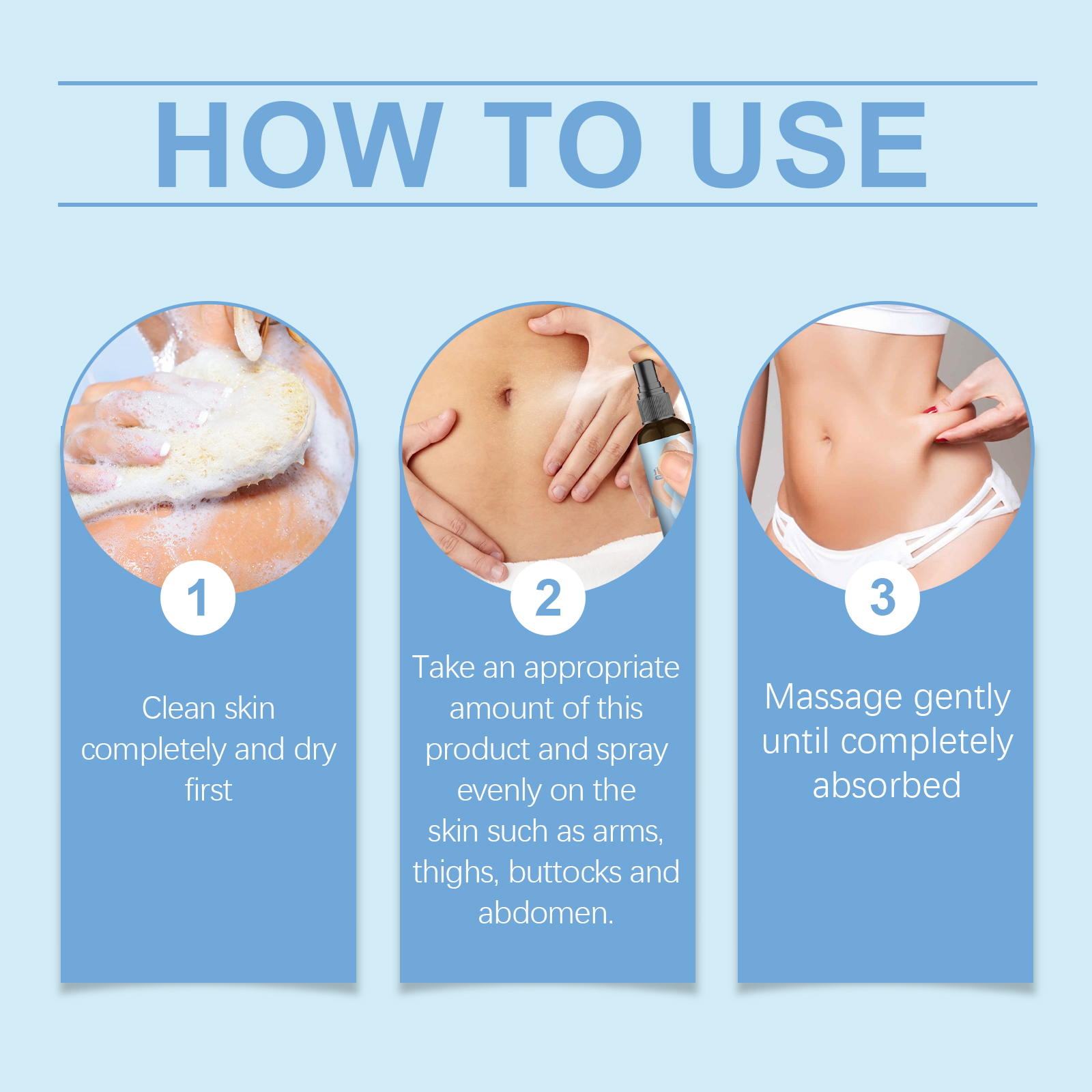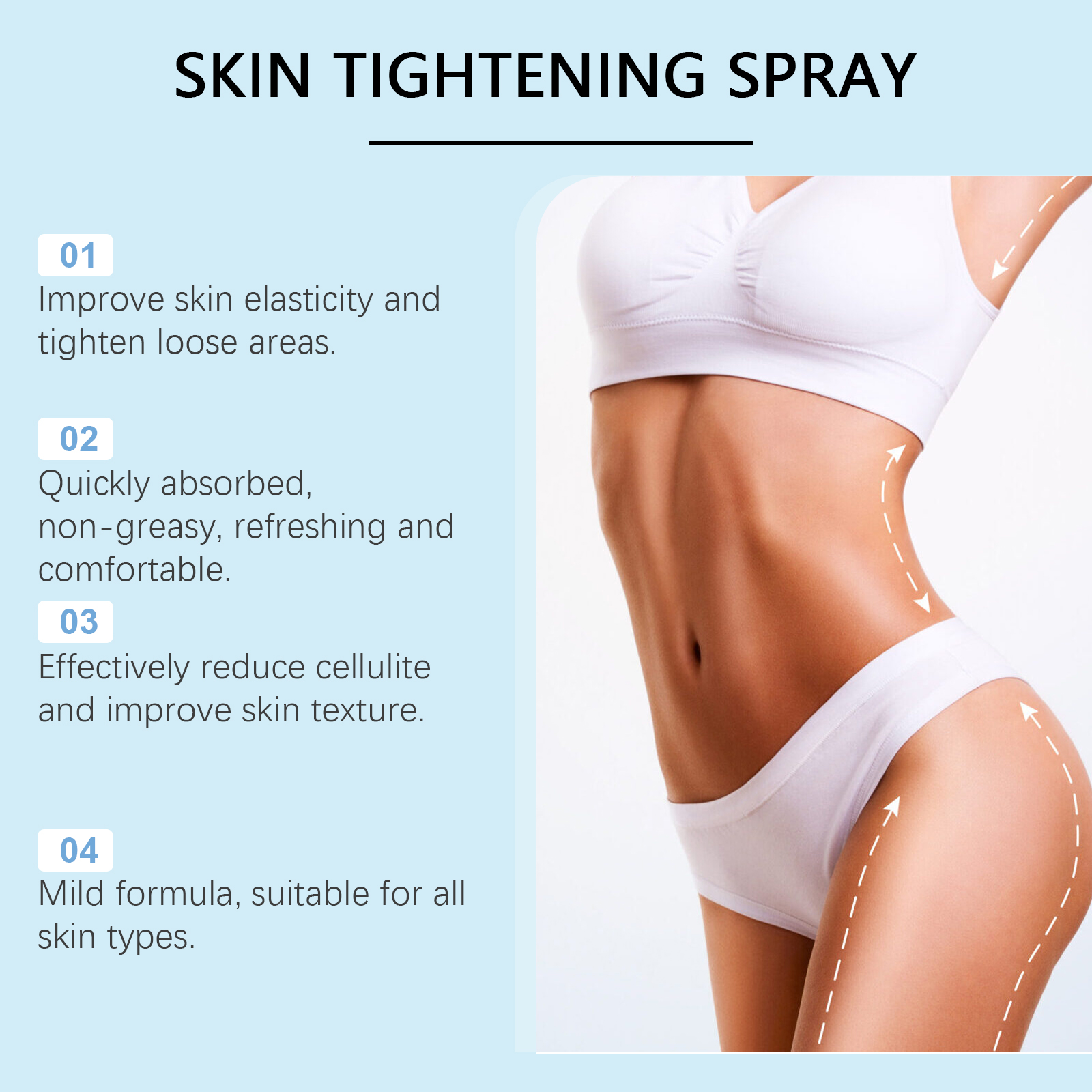 Our firming spray contains panthenol, PCA sodium and ginger root extract. It tightens loose skin and creates a thin, tight body line. Its use method is very simple: thoroughly clean the skin and dry it first, take an appropriate amount of this product evenly spray on the arms, thighs, buttocks, abdomen and other skin. Massage gently until fully absorbed. And lightweight formula, instant absorption without adhesion, suitable for daily use, convenient and fast.