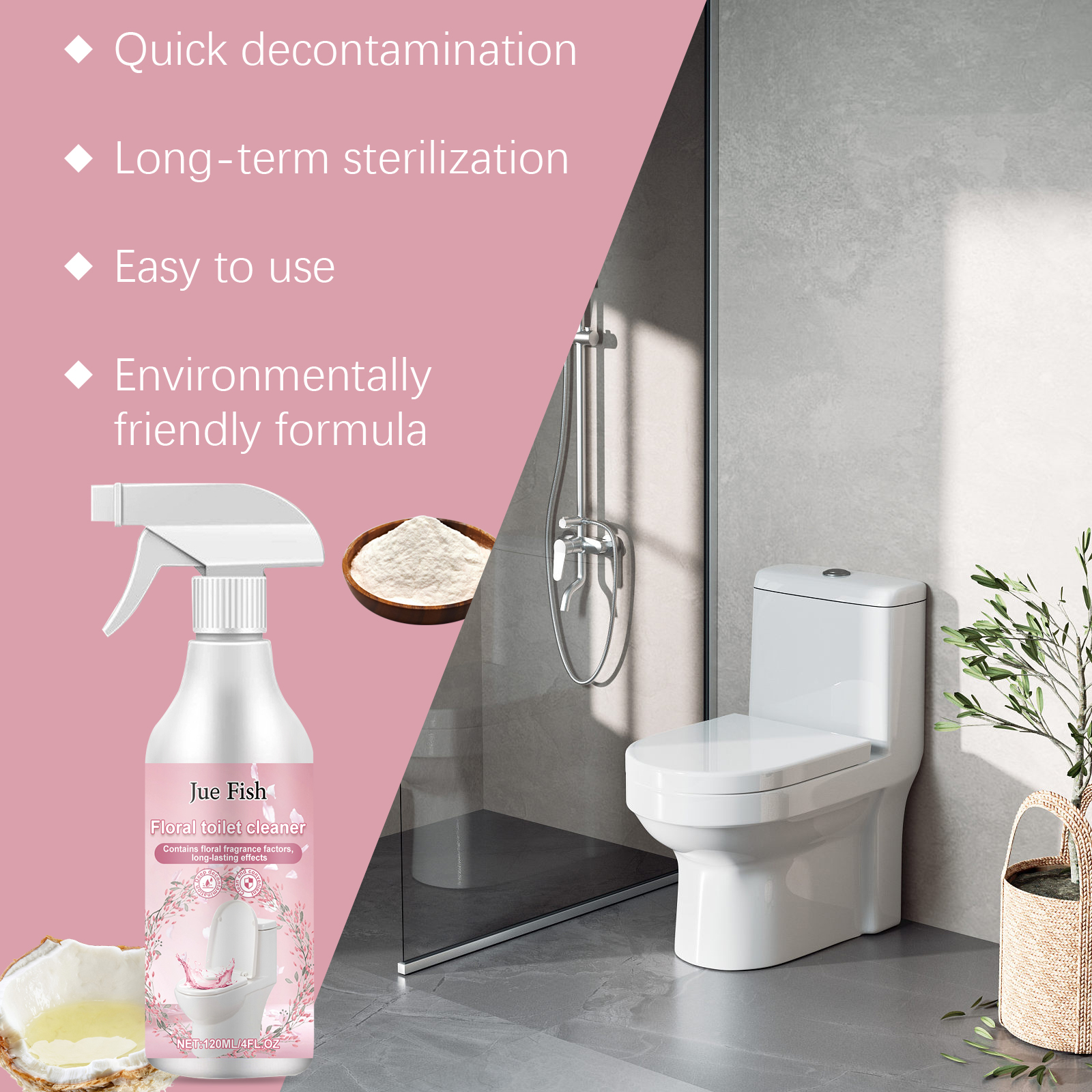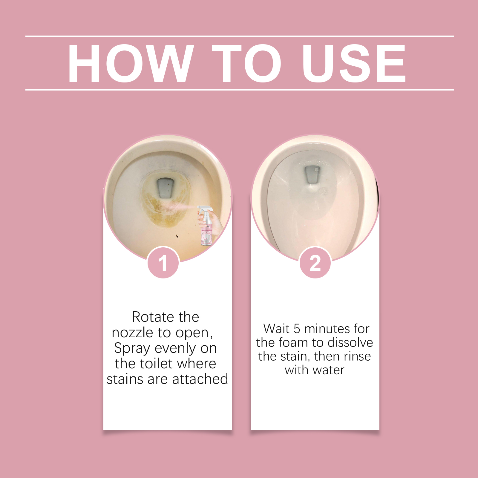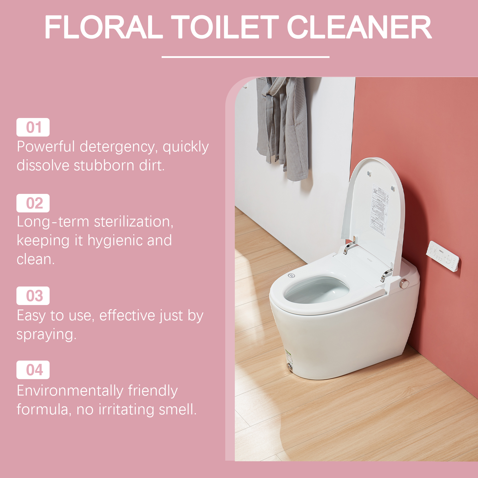 Our floral toilet detergent contains disodium EDTA, cocamidopropyl betaine, and sodium bicarbonate. It can penetrate deeply, strong decontamination, and make your toilet look new; Easily remove dirt, including stains, oil and water stains, leaving no trace. Its use method is very simple: 1. Turn on the rotating nozzle and spray evenly on the toilet with stains; 2. Wait 5 minutes for the foam to dissolve the stain, then rinse with water. Floral toilet decontamination cleaner uses mild ingredients that do not damage tile glaze and can also prevent tile oxidation and yellowing.