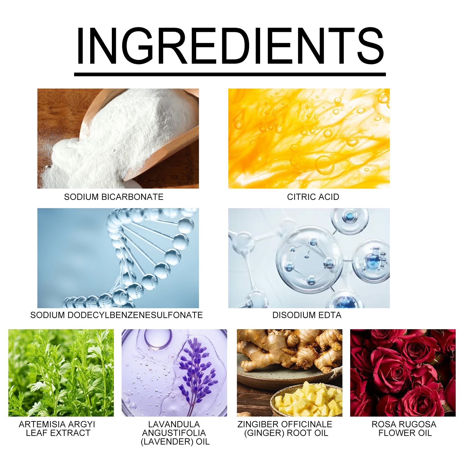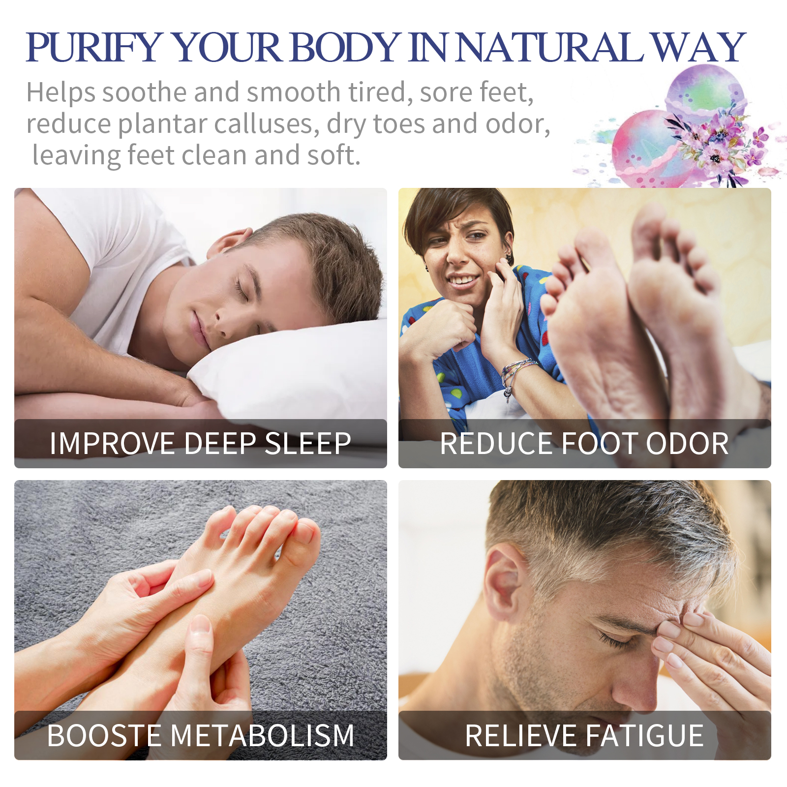 Our foot bath balls contain sodium bicarbonate and citric acid. It can help soothe and smooth tired, sore feet, reduce calluses, dry toes and odors, and leave feet clean and soft. The way to use it is very simple: 1. Fill the basin with hot water, 2. Drop the foot bath ball in it and let it bubble and dissolve. 3. Soak your feet for 20-30 minutes. And it can effectively remove odor.