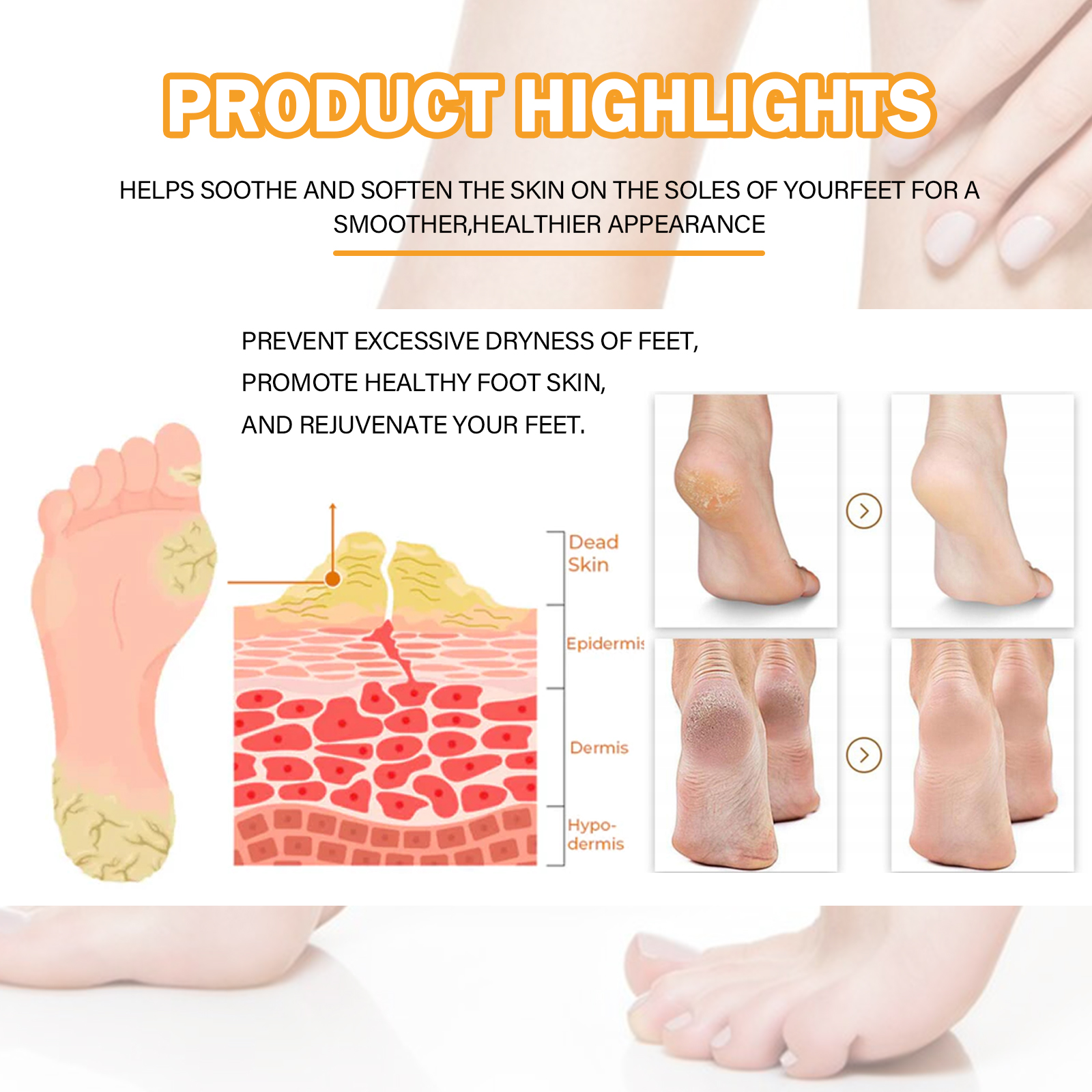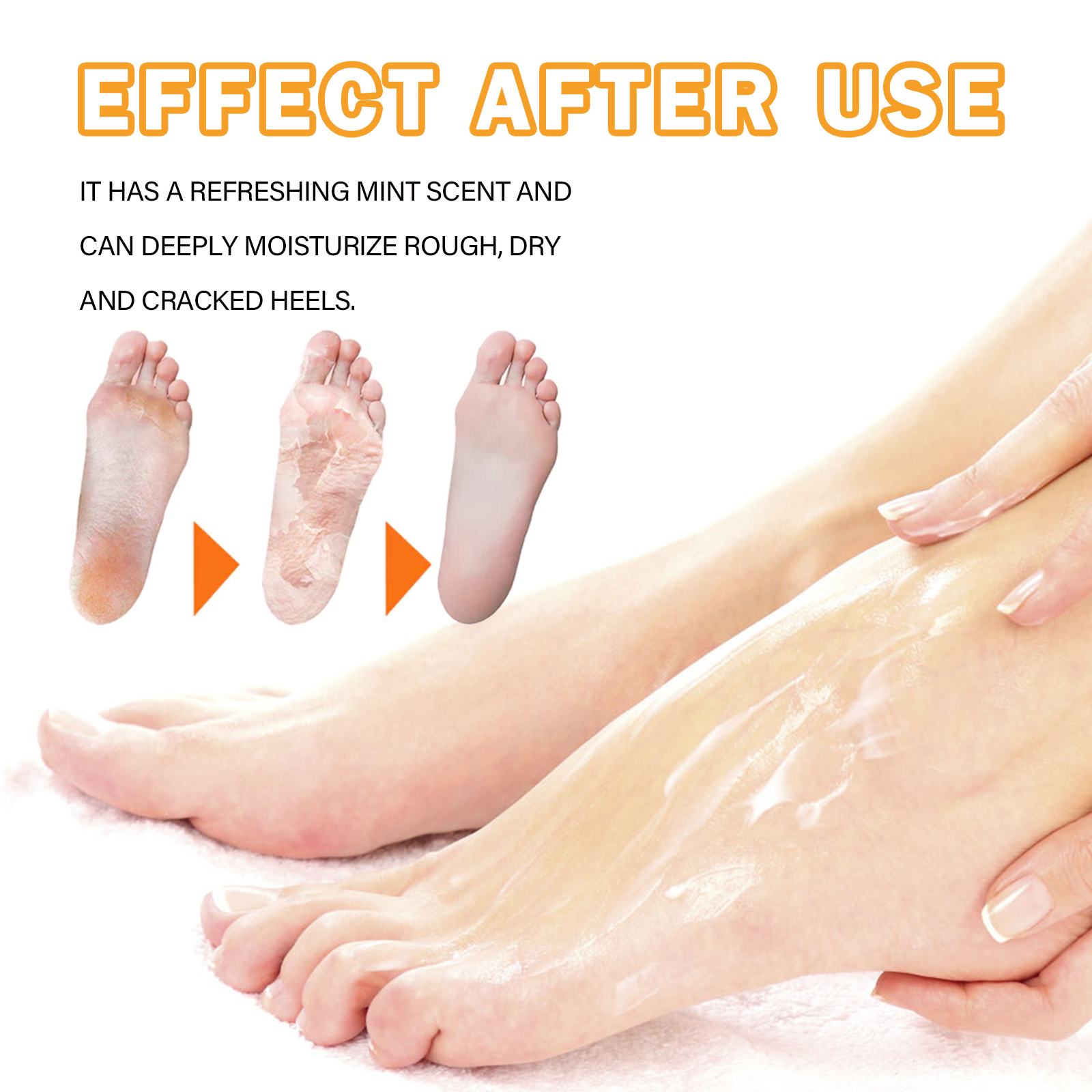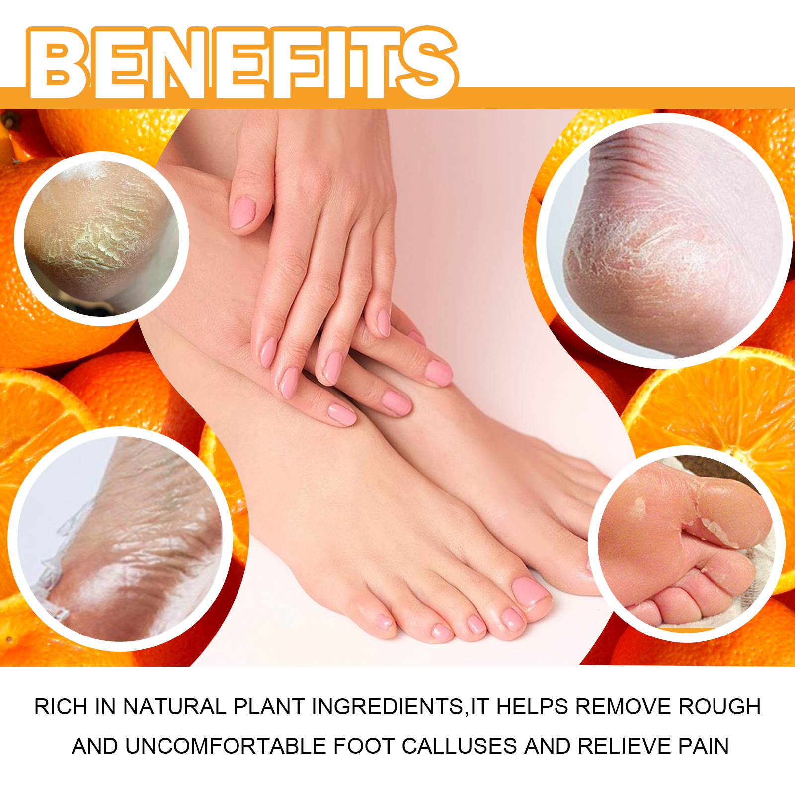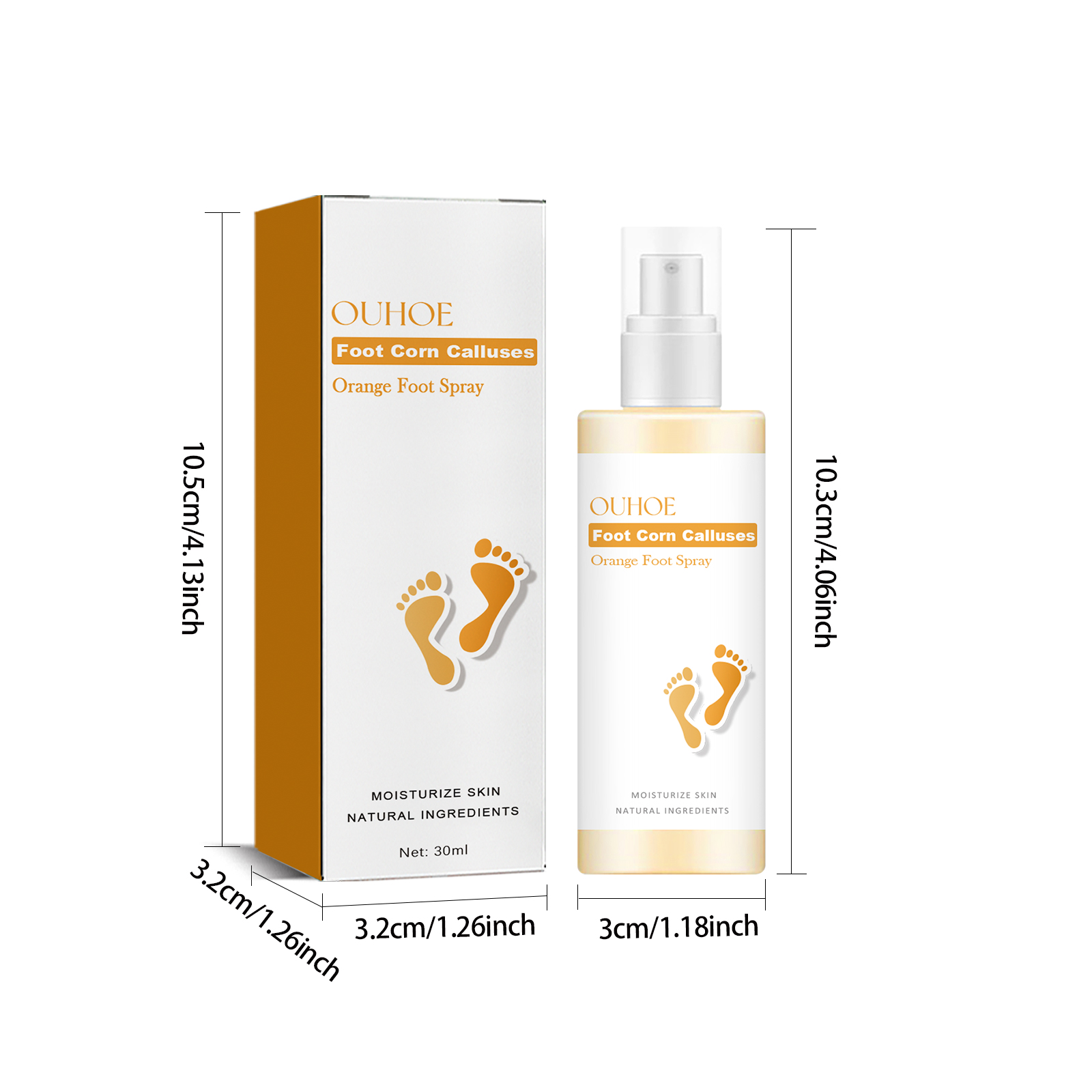 Our foot calluses Moisturizing spray contains orange extract, saffron extract. It can help remove rough and uncomfortable foot calluses and relieve pain. Its use method is very simple: soak the feet in warm water, then dry, take an appropriate amount of this product evenly spray on the feet, 5-10 minutes later with clean water, gently rub with the hand or wipe with a wet towel to remove calluses. And it removes dead skin calluses.