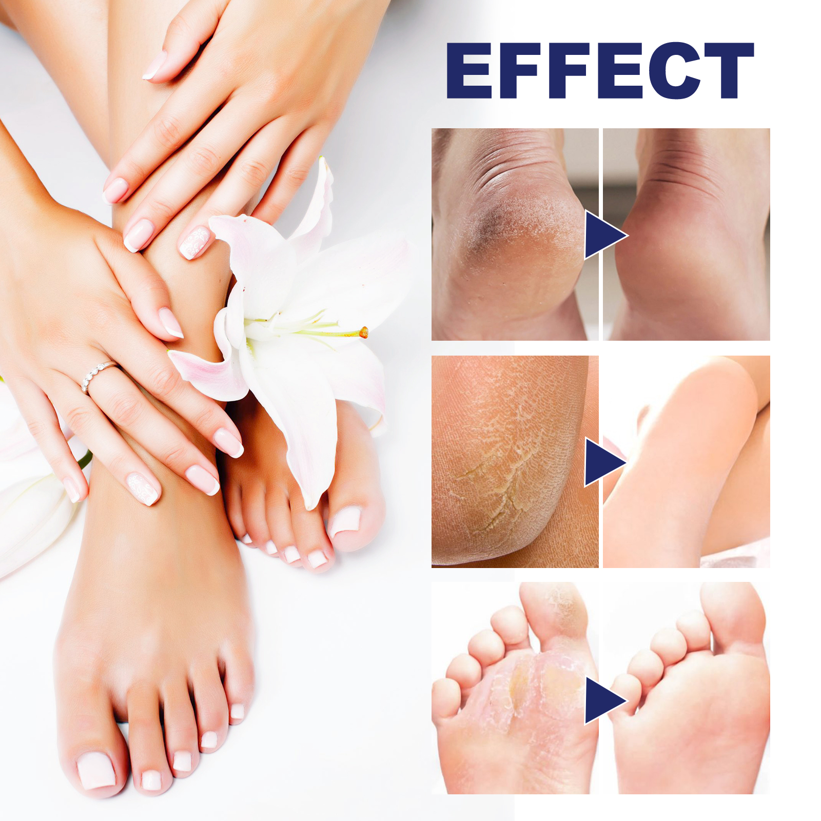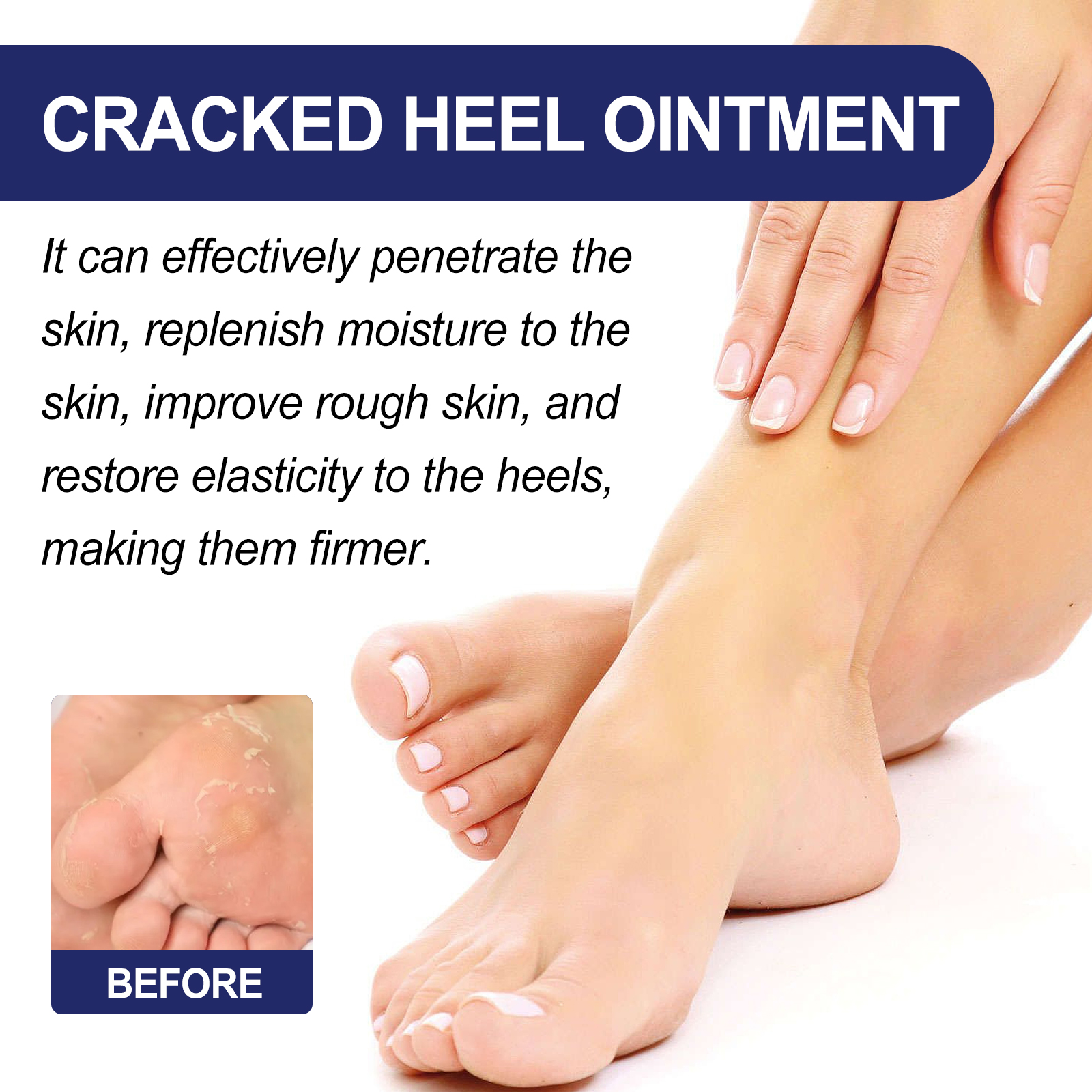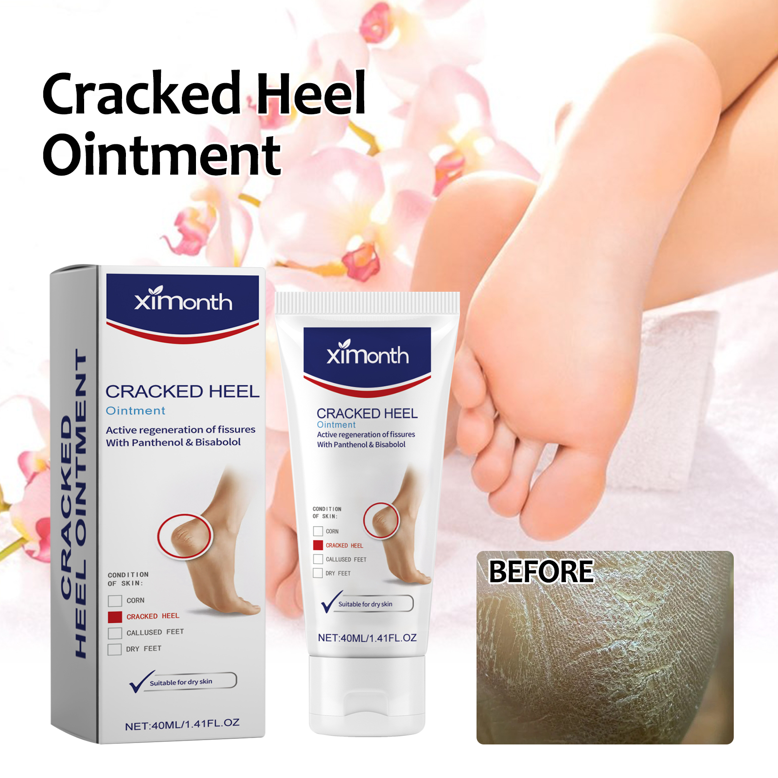 Our Cracked Heel Ointment contains Cera Microcristallina, Lanoliin, Bisabolol. It can effectively penetrate the skin, replenish moisture for the skin, improve rough skin, restore elasticity to the heel, and make it firmer. Its use method is very simple: after cleaning and drying the heels, take appropriate amount of product evenly apply to the heels, gently massage until absorbed. Repair cracked and painful cracks in the skin, make the skin smooth and healthy, and form a protective barrier.