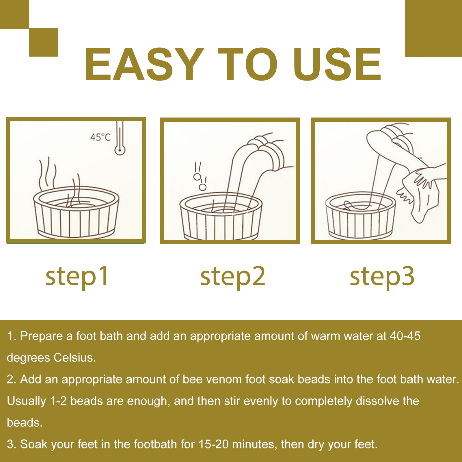 Our Bee Venom Body Drainage Slimming Foot Soak Beads contains artemisia vulgaris extract, calendula officinalis extract, carthamus tinctorius (safflower) flower extract. It can relieve leg swelling, slim and shape the body, provide immediate relief, help repair and nourish the skin, improve dryness, cracks and other problems, making the foot skin smoother and softer. Its application is simple: Prepare a foot bath and add an appropriate amount of warm water at 40-45 degrees Celsius. Add an appropriate amount of bee venom foot soak beads into the foot bath water. Usually 1-2 beads are enough, and then stir evenly to completely dissolve the beads. Soak your feet in the footbath for 15-20 minutes, then dry your feet. Suitable for relieving foot pain and swelling caused by standing or walking for a long time, and effectively reduce the stress of daily life and work.