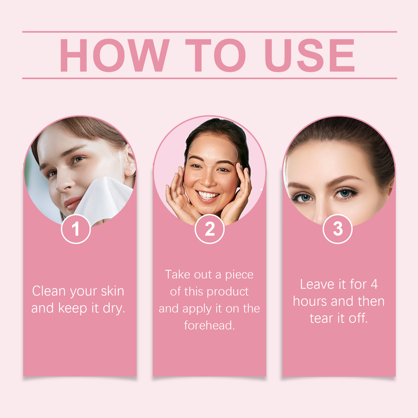 Our forehead strips contain glycerin, peppermint extract and lemon extract. It effectively helps reduce fine lines and wrinkles on the forehead and keeps the skin smooth. Helps to improve skin firmness and restore the youthful state of hair. Its use is simple: take out a piece, leave it for four hours, and then tear it off. Clean skin and keep it dry. Apply this product to face. And can be invisible patch easy to wear, does not affect daily activities.