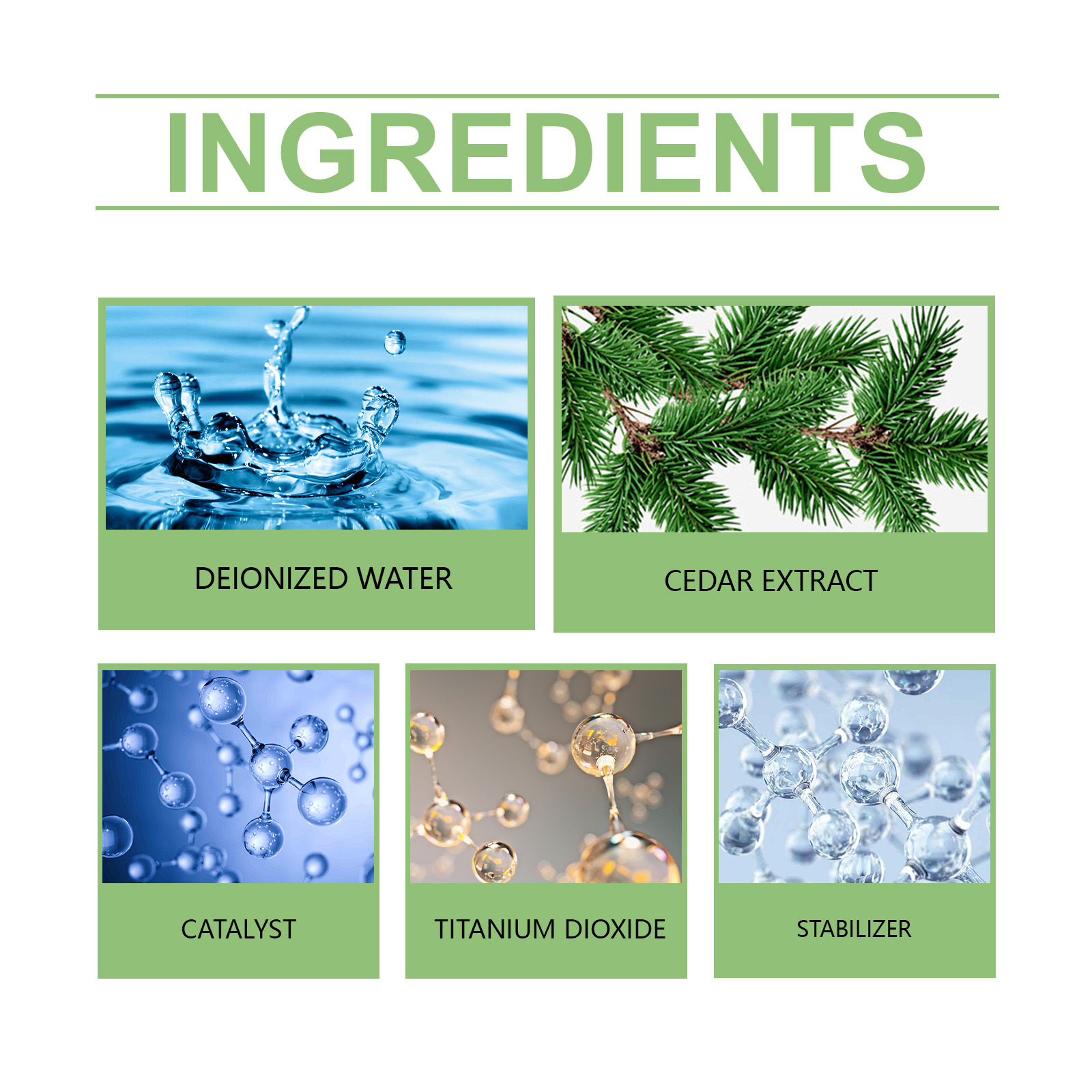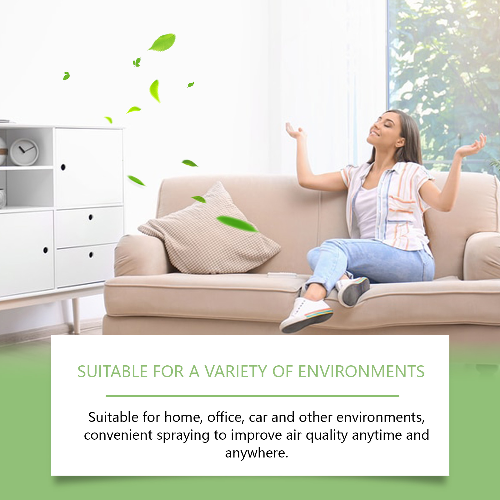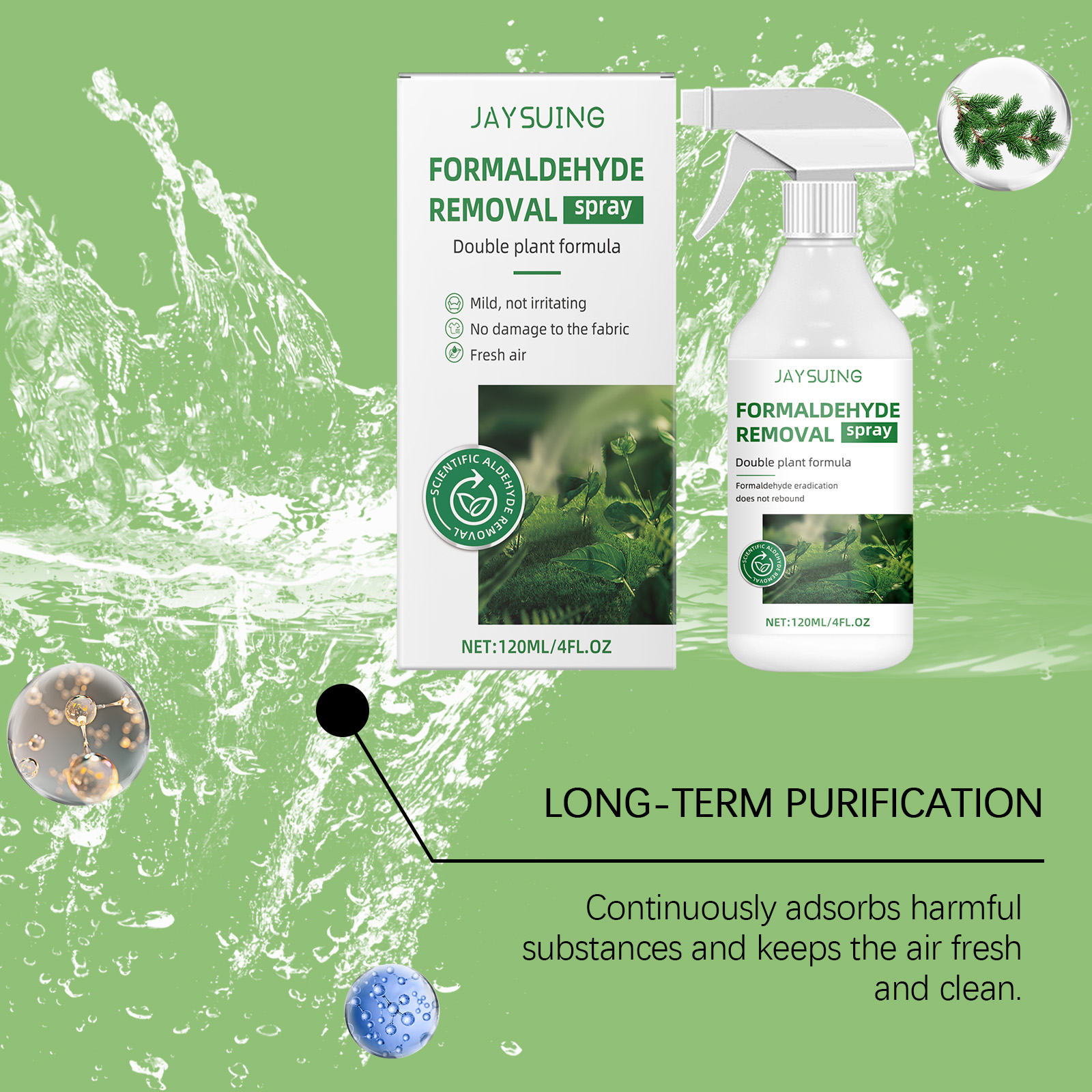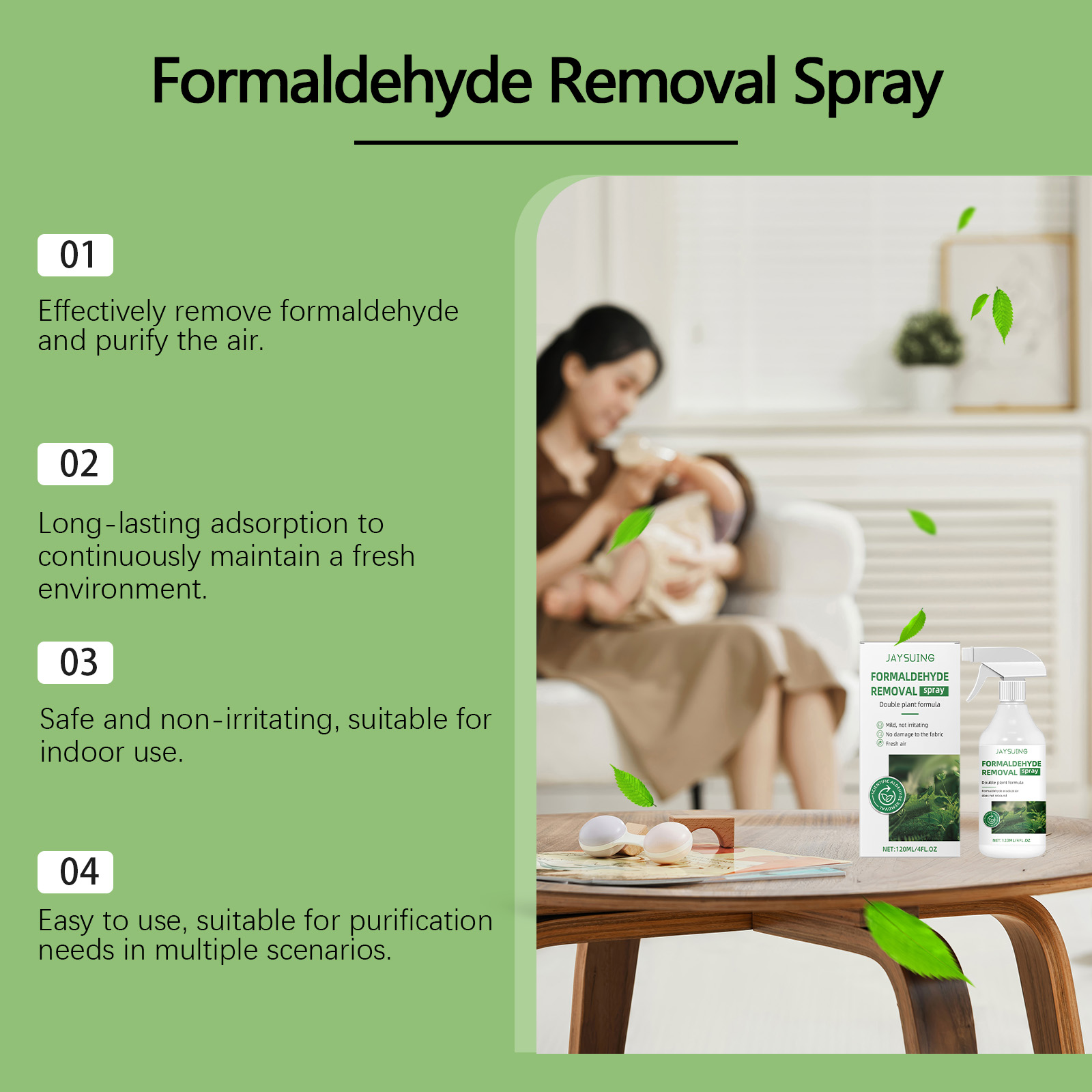 Our formaldehyde removal spray contains catalysts, titanium dioxide, and stabilizers. It can quickly neutralize formaldehyde molecules, purify the air, and improve indoor environmental quality. The way to use it is simple: dry your home before use until it is clean and dry. Spray the product evenly on the surface of the furniture. After spraying, open the doors and Windows to make the room ventilated, the effect will be better. And it can continue to release fresh ingredients, keep the air clean for a long time, and bring peace of mind to your home.