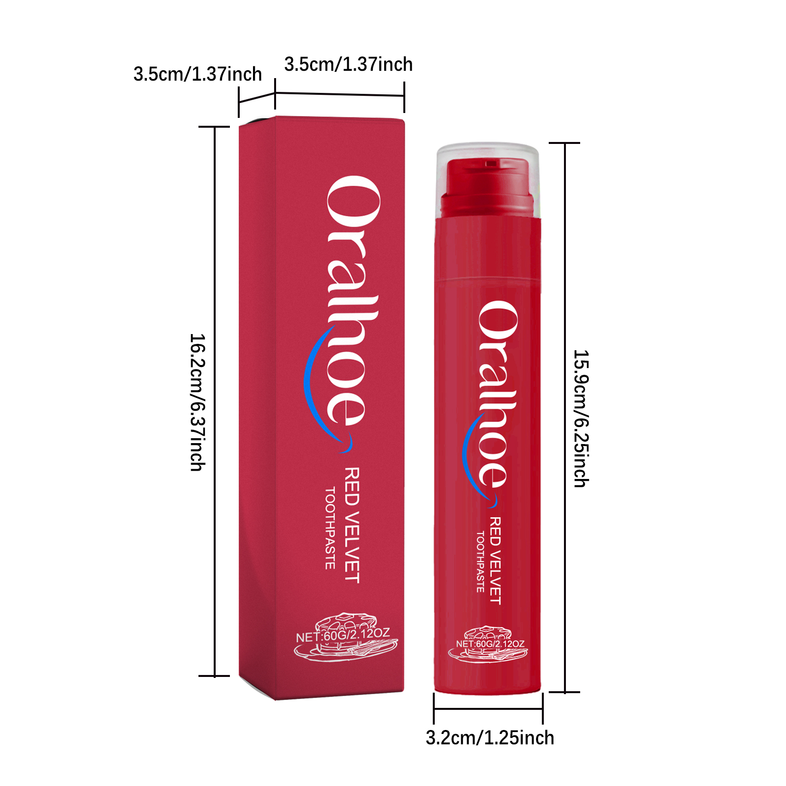 Our Red Velvet Toothpaste contains Glycerin, Allium Sativum (Garlic)Bulb Extract, Chrysanthellum Indicum Extract. It can help repair cavities, fight tooth decay, restore tooth health, help remove bad breath, freshen breath, and make you more presentable in conversation. Its use is very simple: take a proper amount of toothpaste on the toothbrush, brush with the correct method for 2-3 minutes, and finally rinse your mouth with water. It can safely and effectively remove the stains on the surface of the teeth and restore the teeth to bright white.