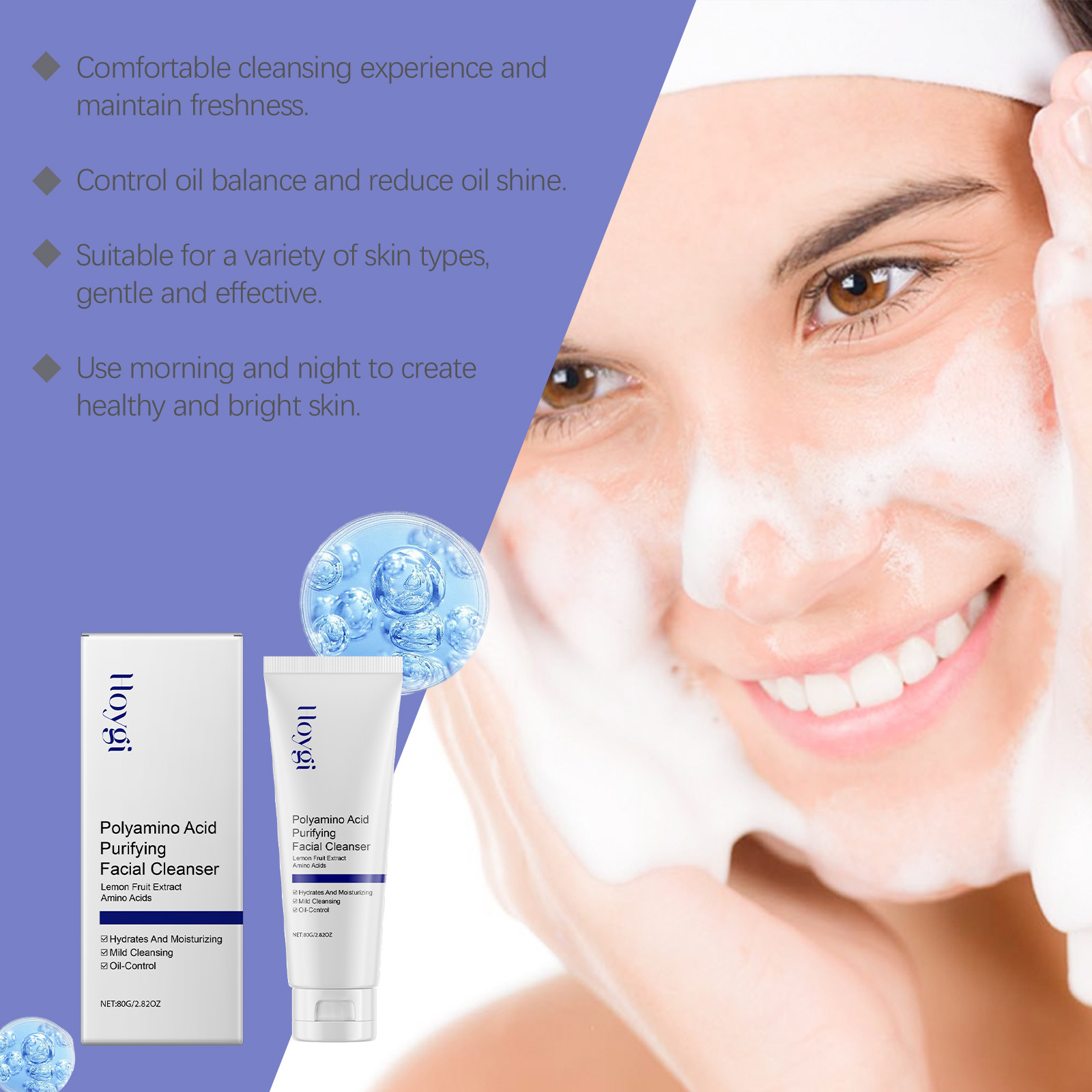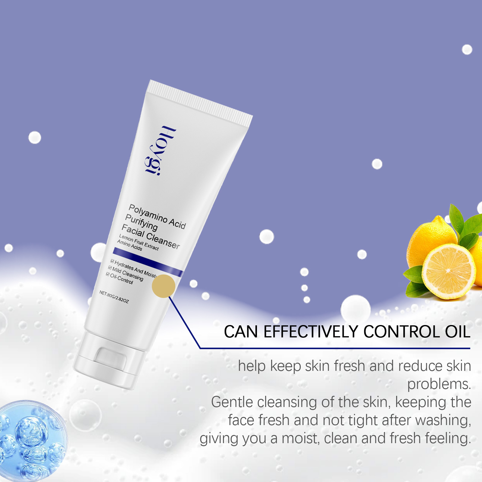 Our acne cleanser contains lemon fruit extract, hyaluronic acid, collagen. It can effectively remove facial dirt and oil. Its use method is very simple: take the appropriate amount of this product in the palm. Apply to wet face, gently massage for 2 minutes and rinse thoroughly with water. And it gives your skin a healthy glow.