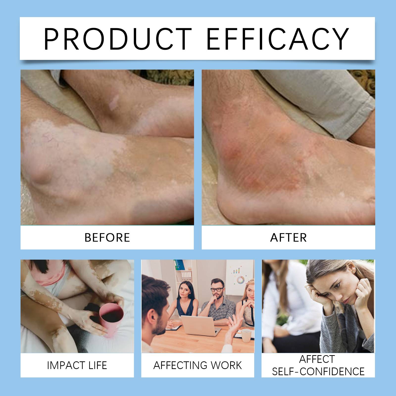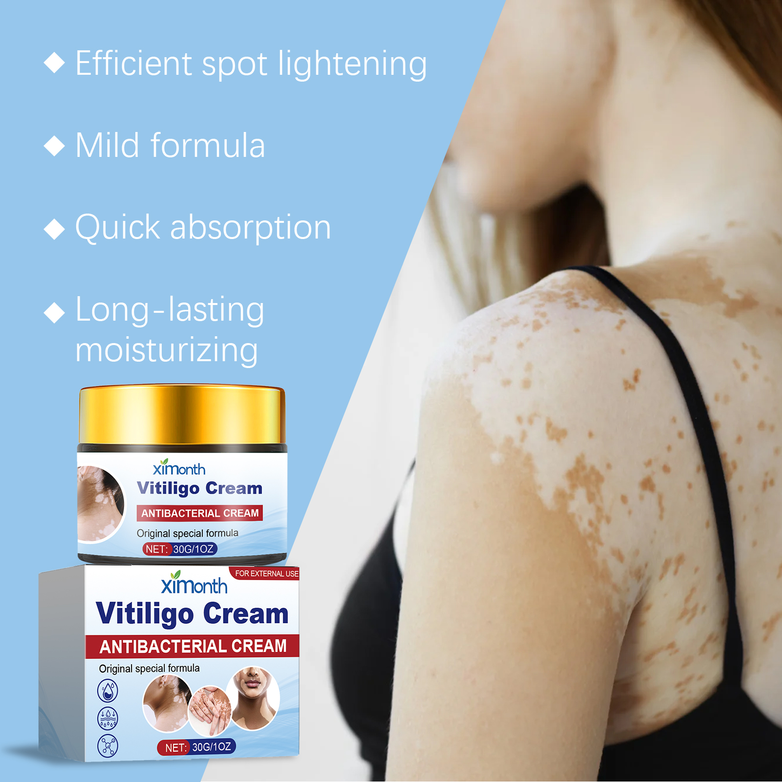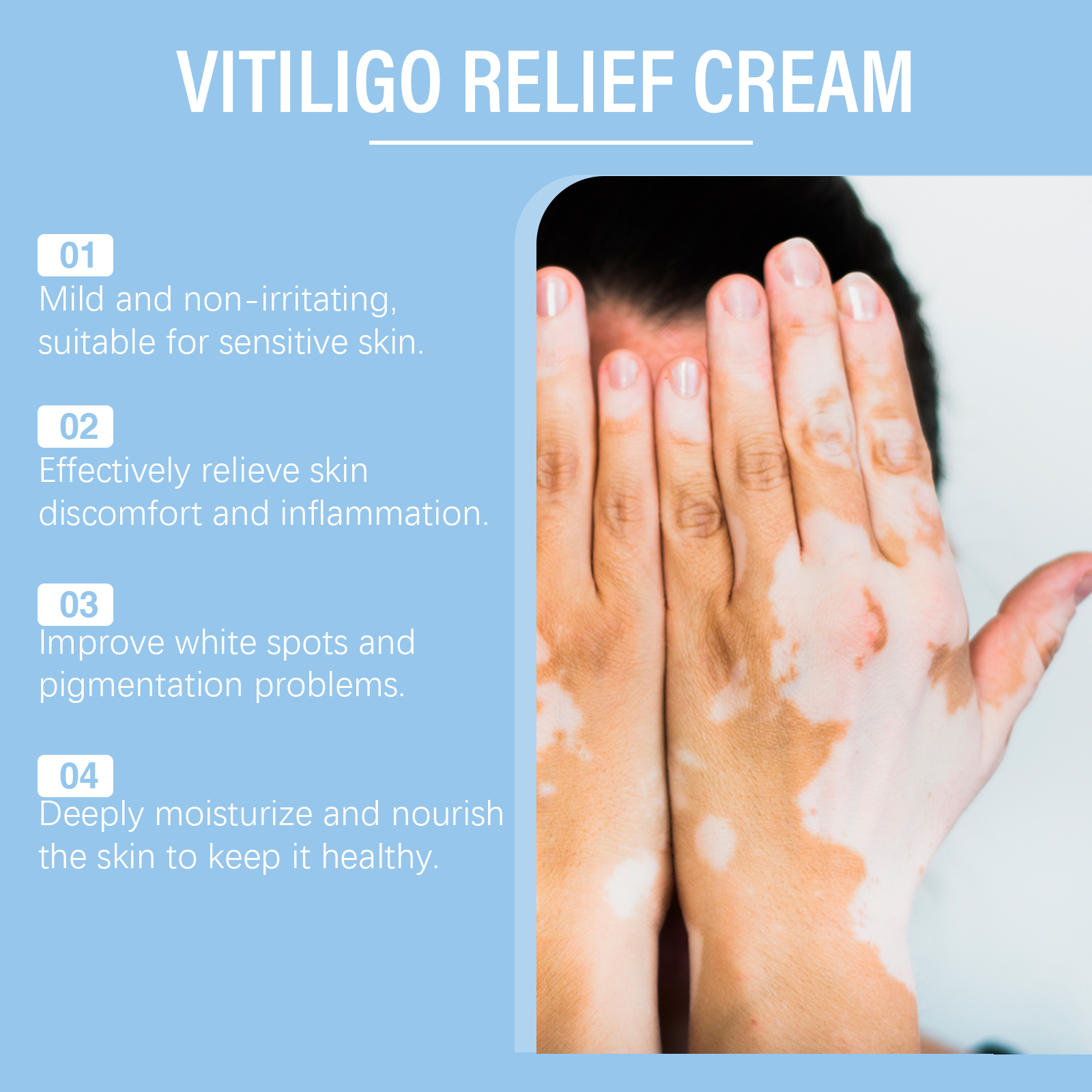 Our skin care cream contains Asiaticum extract and comfrey extract. It can effectively fight bacteria, regulate skin cell metabolism, prevent the spread of white spots, and restore skin health. Its use method is very simple: thoroughly clean the skin, dry first, apply appropriate amount of this product evenly on the growth of white spots, gently massage to promote absorption. And can deeply moisturize, deep into the skin layer, provide instant, lasting soothing effect, make the skin more soothing.