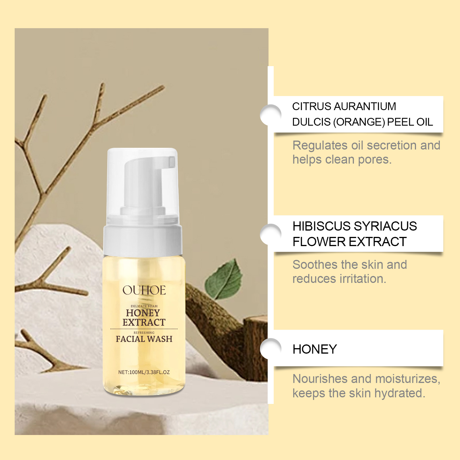 Our gentle Honey foam cleanser contains honey and white willow bark extract. It can effectively regulate oil secretion and avoid facial greasy. Its application is simple: apply to moist skin, massage into the face, avoid around the eyes, and rinse off. It can also reduce facial acne and blackheads and keep skin healthy.