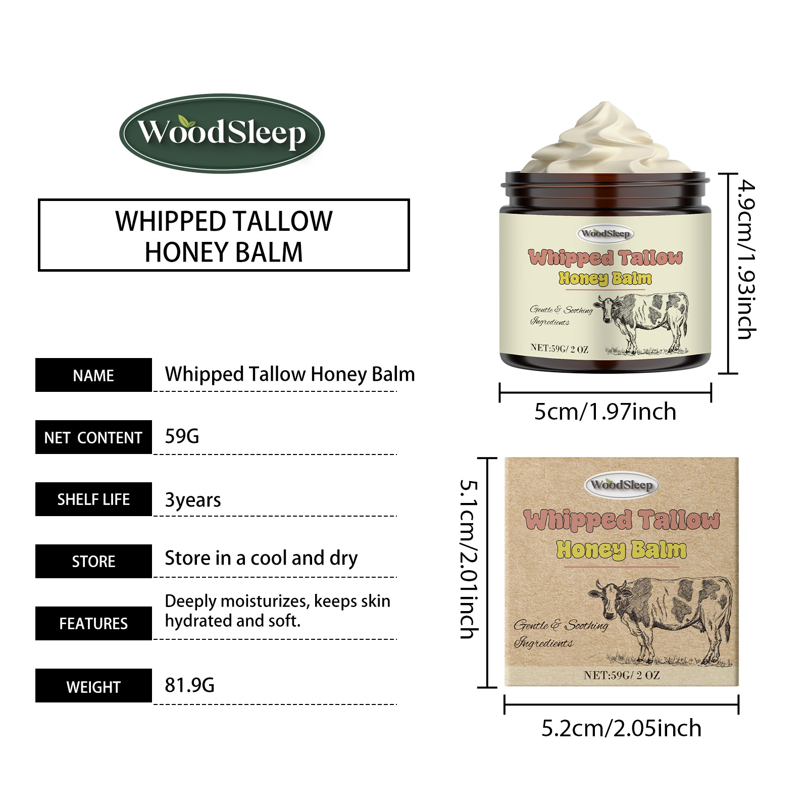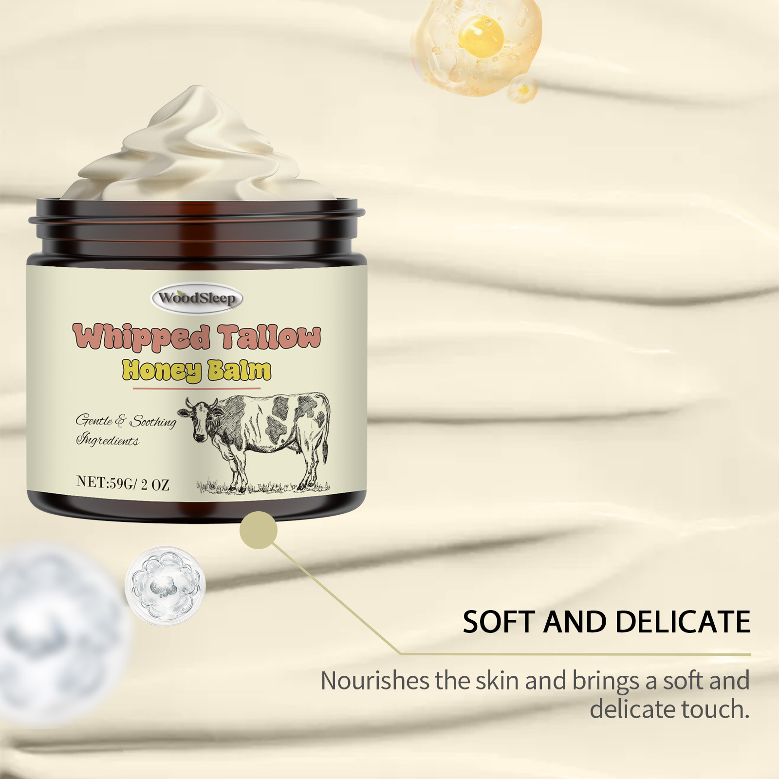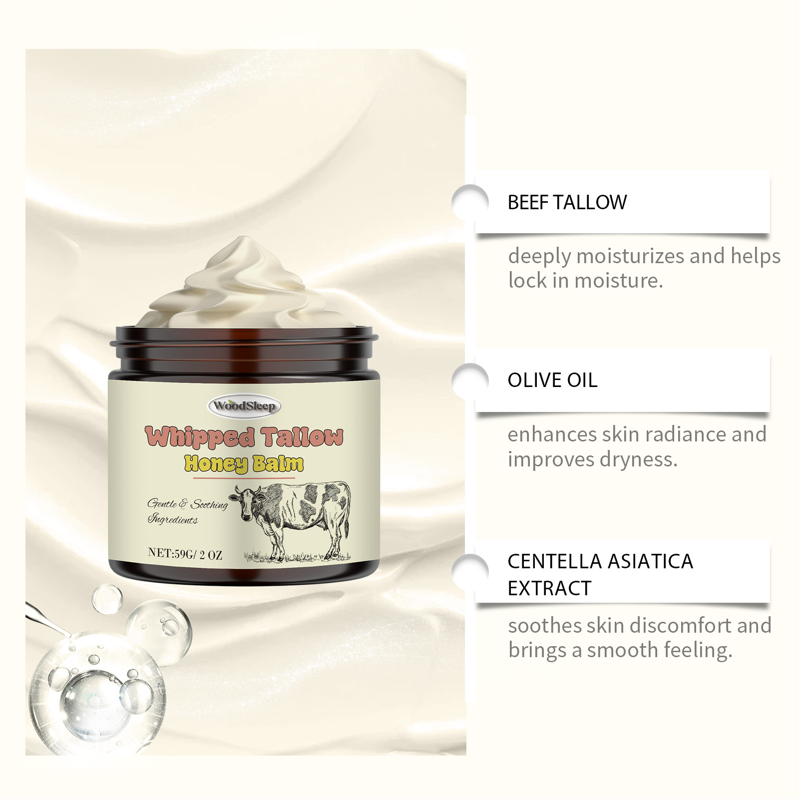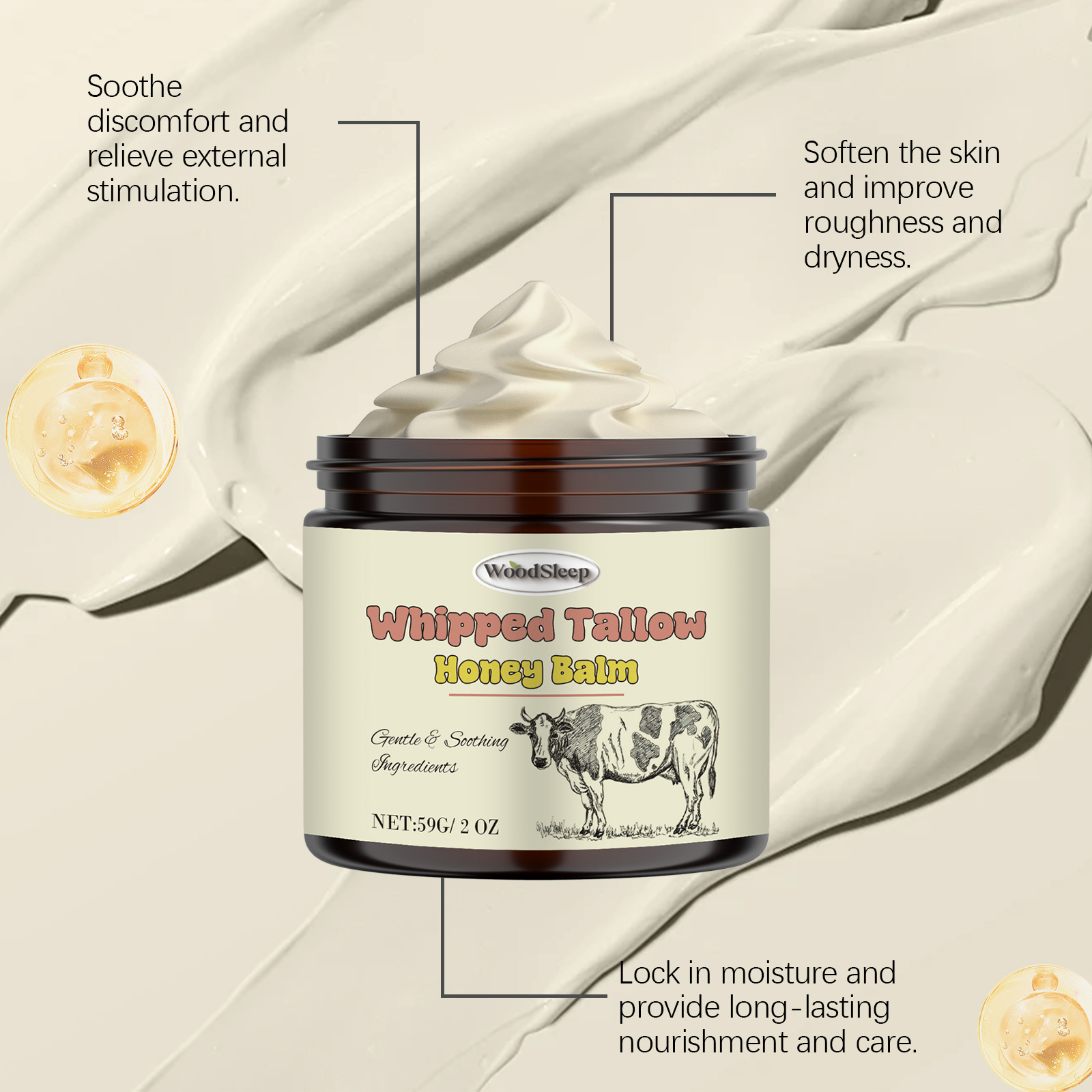 Our tallow honey cream contains glycerin and mineral oil. It can help relieve skin discomfort. Deep moisturizes skin, locks in moisture and keeps skin hydrated. Its application method is very simple: clean your facial skin, apply appropriate amount of this product evenly on the facial skin, gently massage in circles to promote absorption. It also deeply moisturizes and keeps skin hydrated.