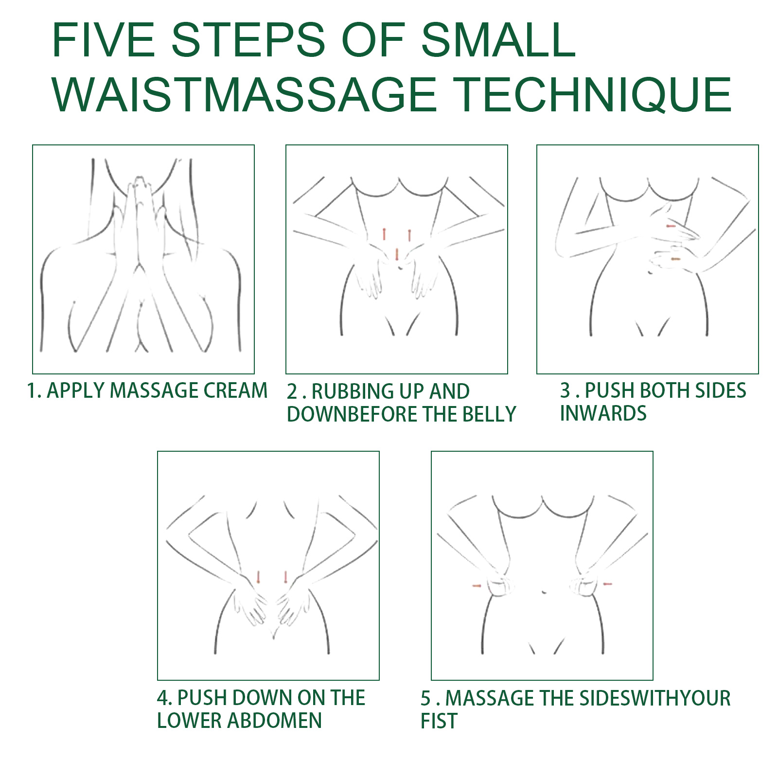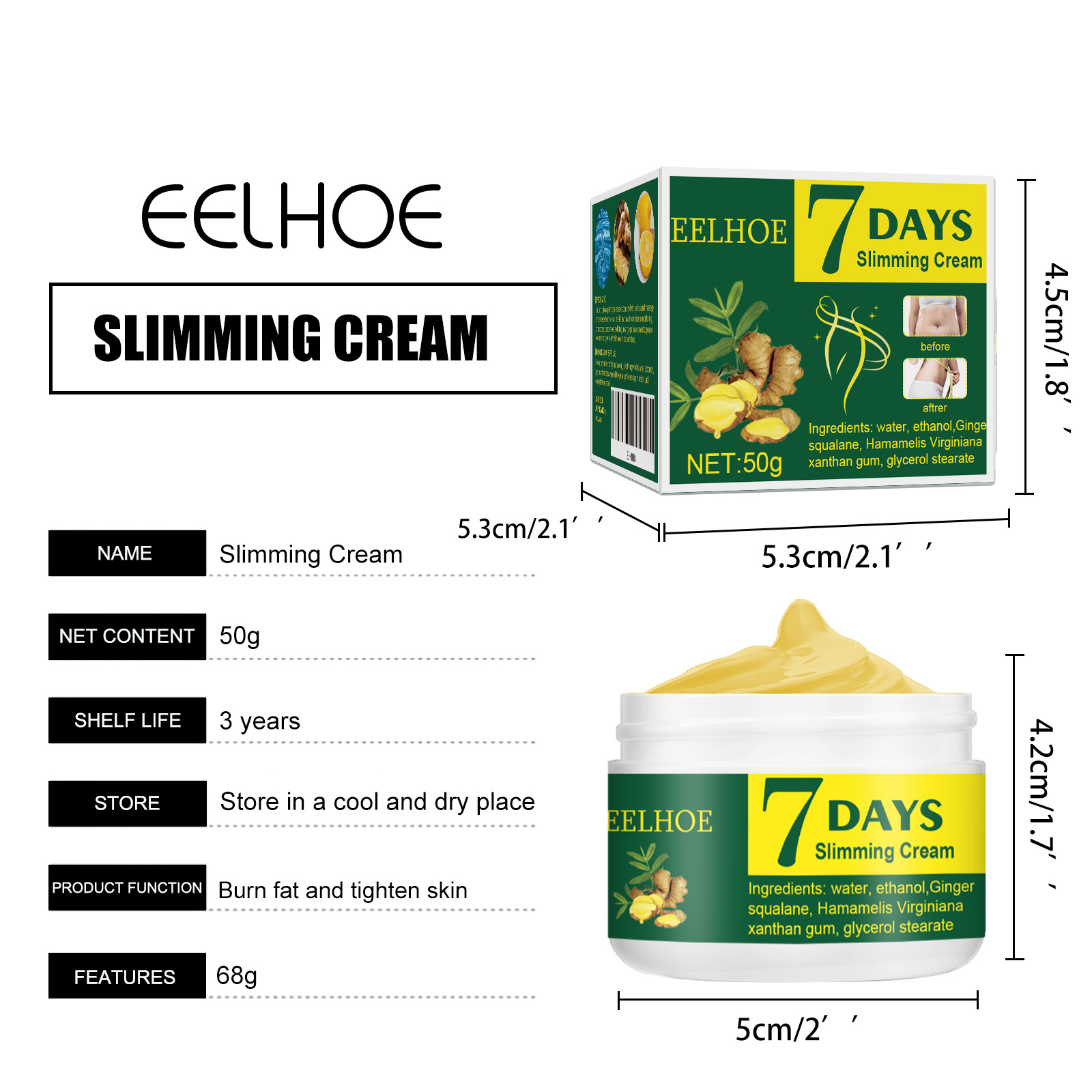 Our 7 Days Slimming Cream contains water, ginger. It can permeate the muscles of the skin and have the functions of moistening, compactness and lifting, make people feel warm and glow healthy skin color at the same time. Its application method is very simple: Apply massage cream. Rubbing up and downbefore the belly. Push both sides inwards. Push down on the lower abdomen. Massage the sideswithyour fist. Burning fat for waist and abdomen, firming skin, warming and slimming, make skin bright, tender, moisturize and smooth.