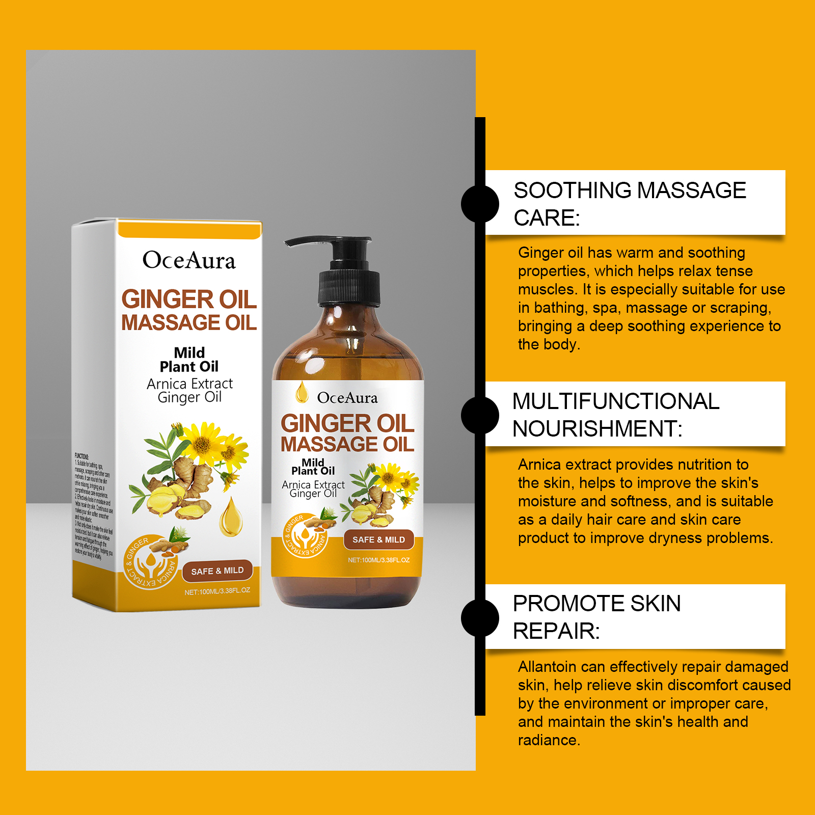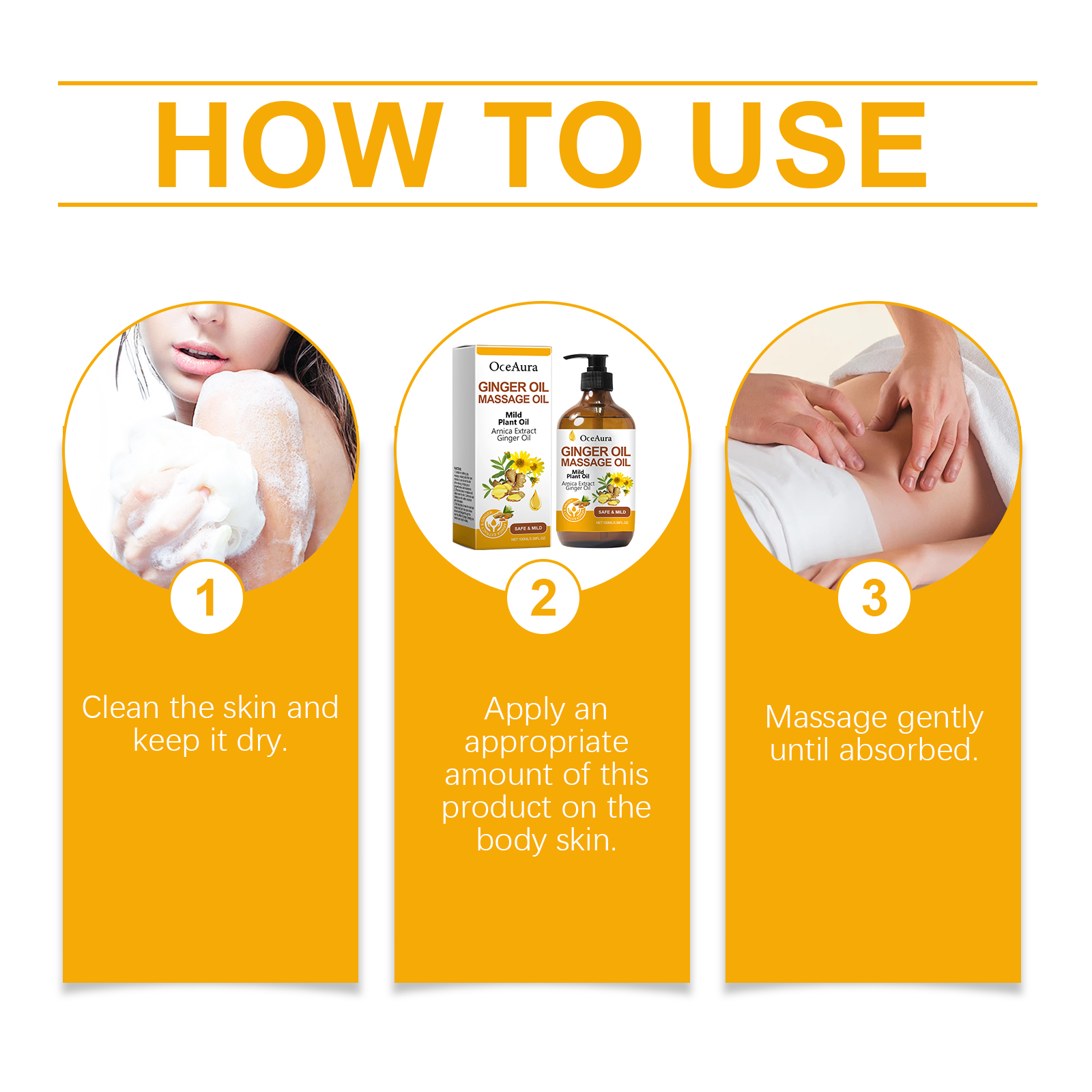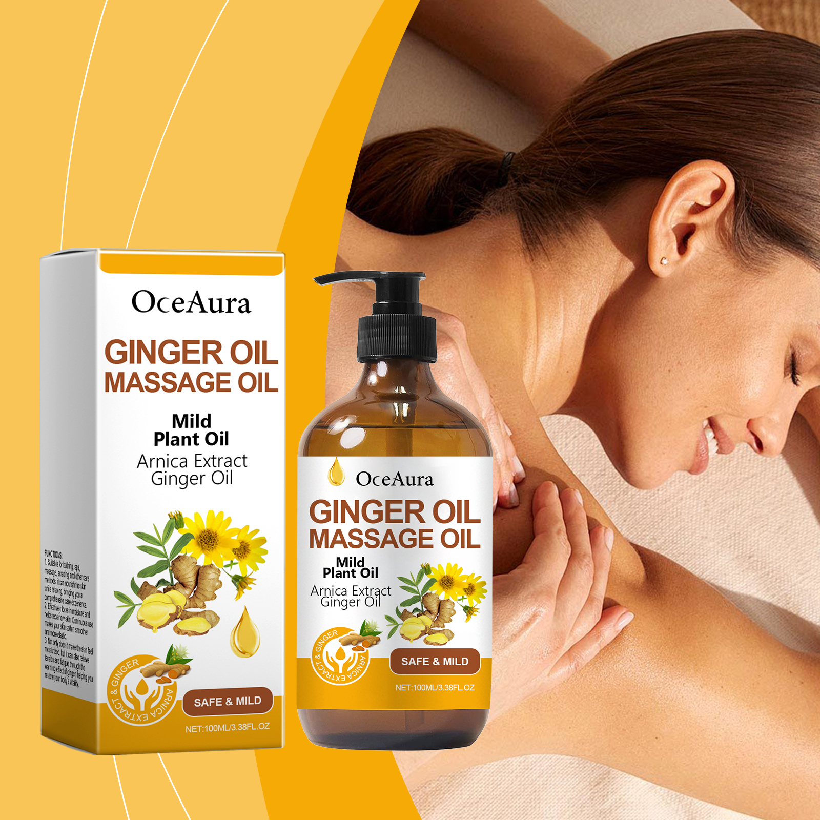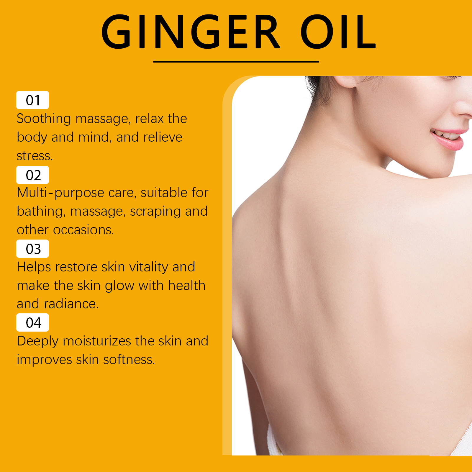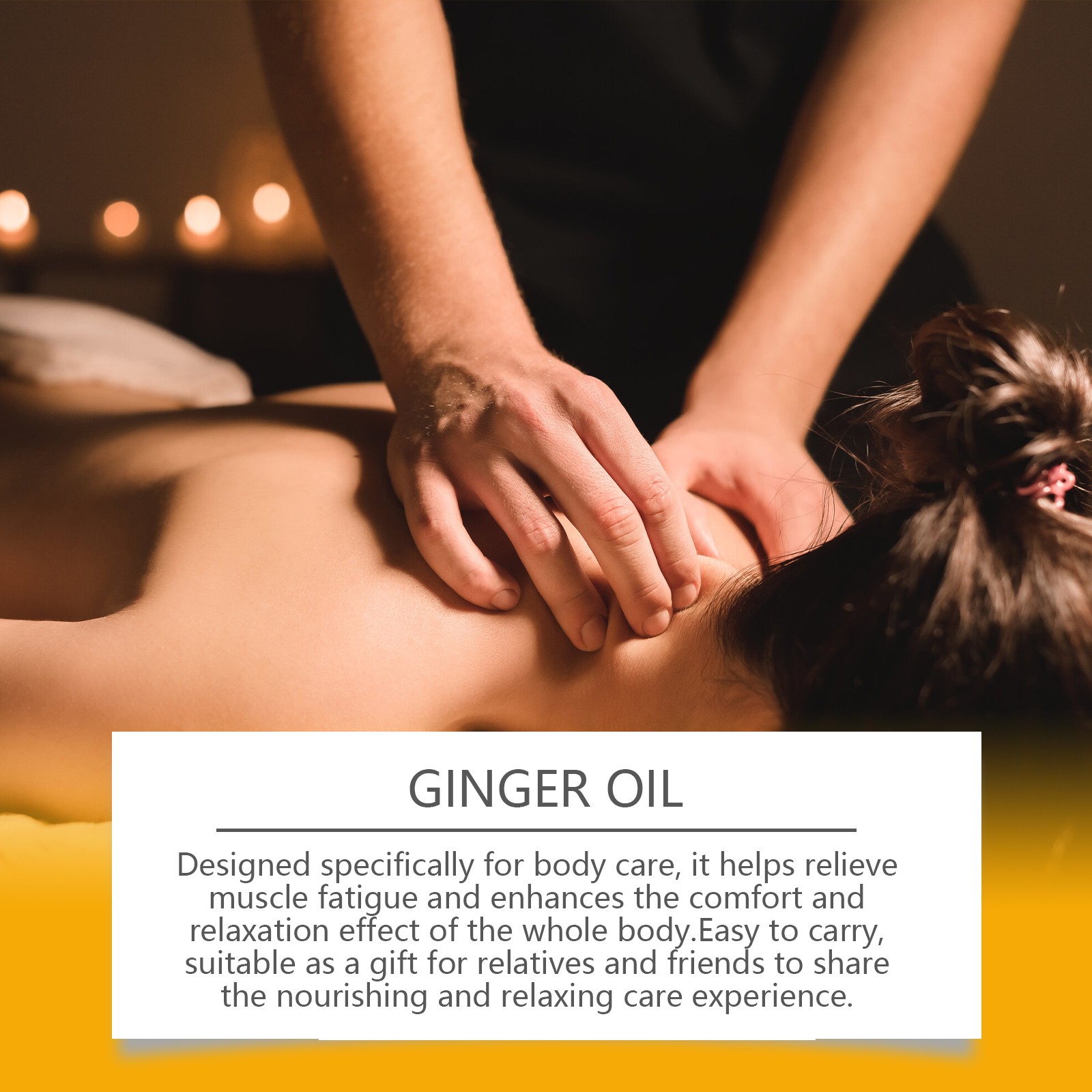 Our ginger massage oil contains glycerin, vitamin E(tocopherol). It can help rejuvenate the skin and give it a healthy glow. The way to use it is simple: clean the skin and keep it dry. Apply appropriate amount of this product to the skin. Gently massage until absorbed. And suitable for carrying around, enjoy aroma care anytime and anywhere.