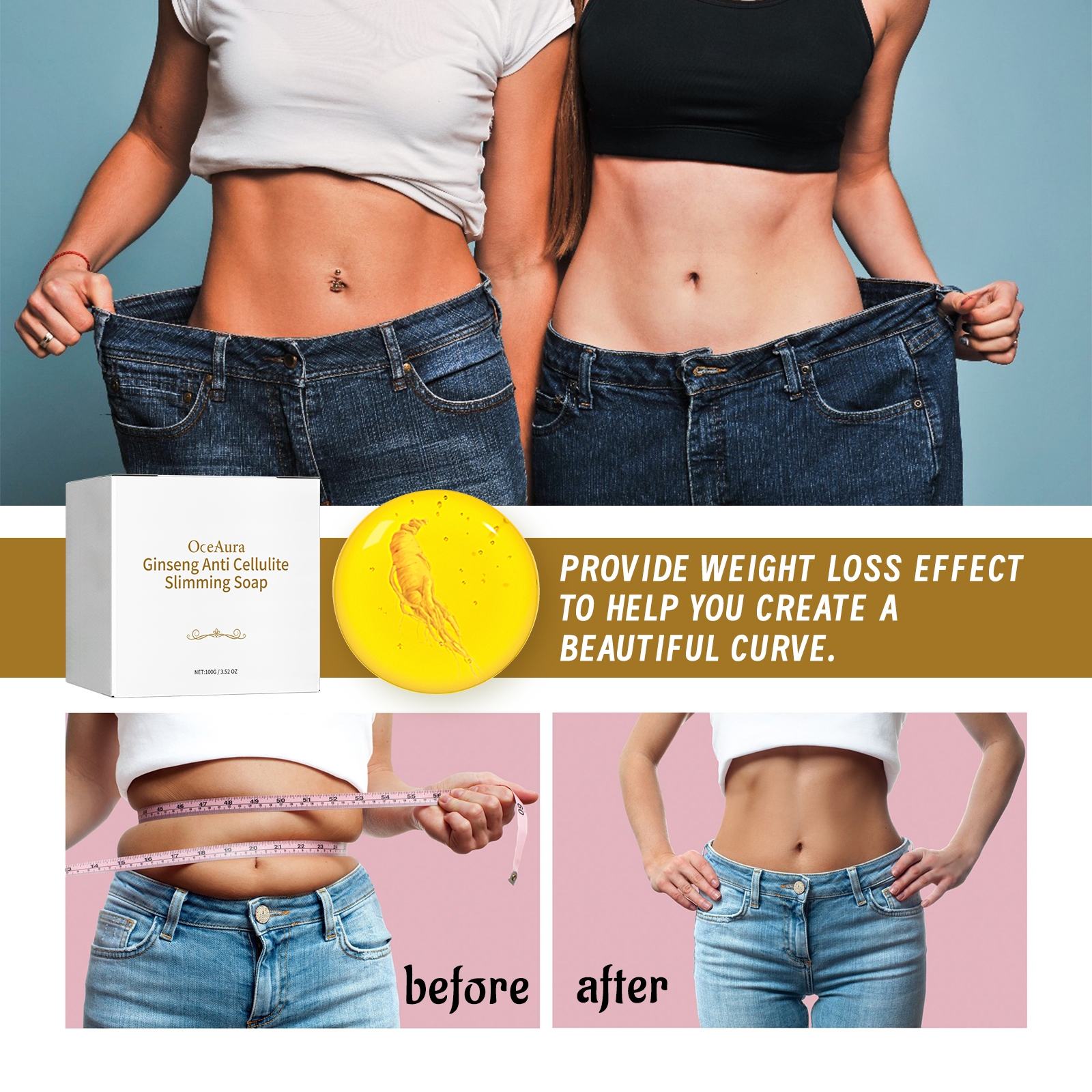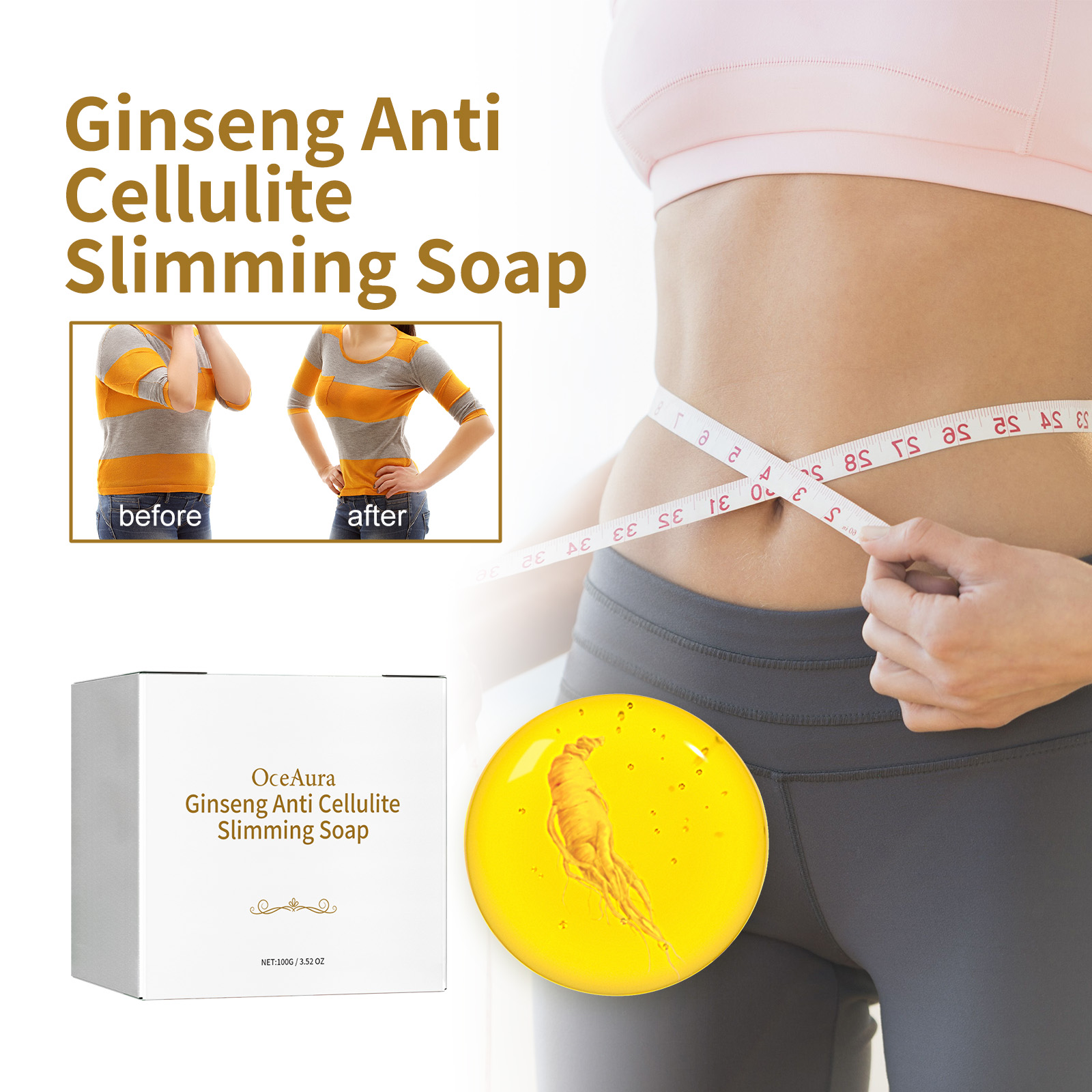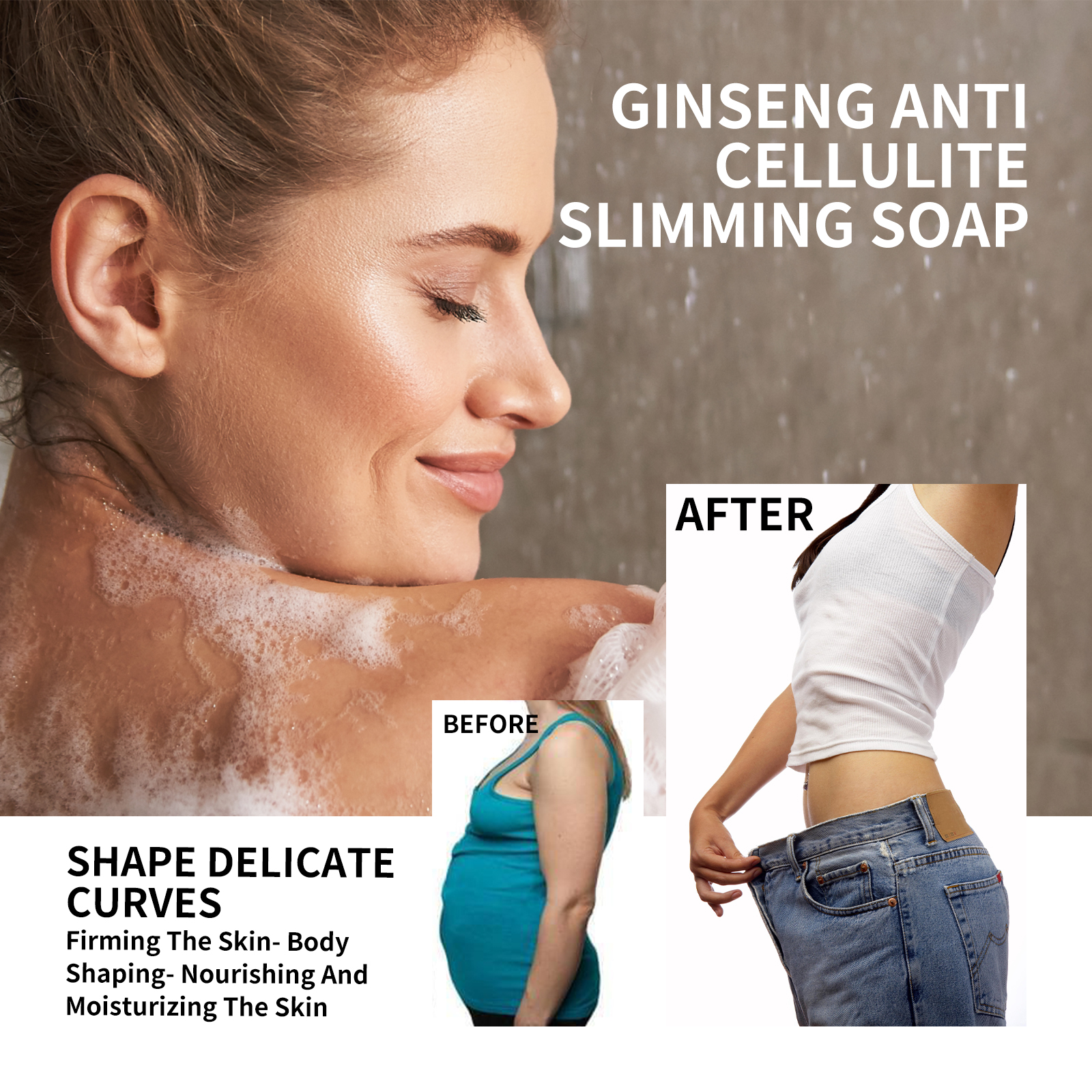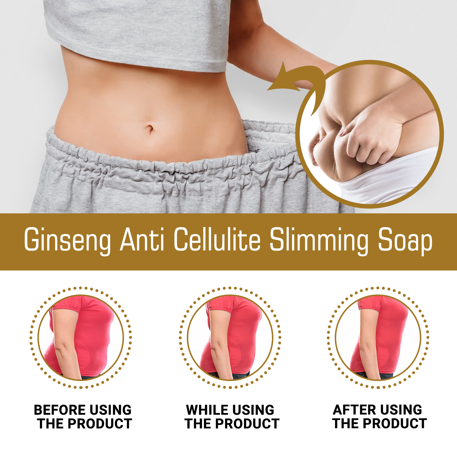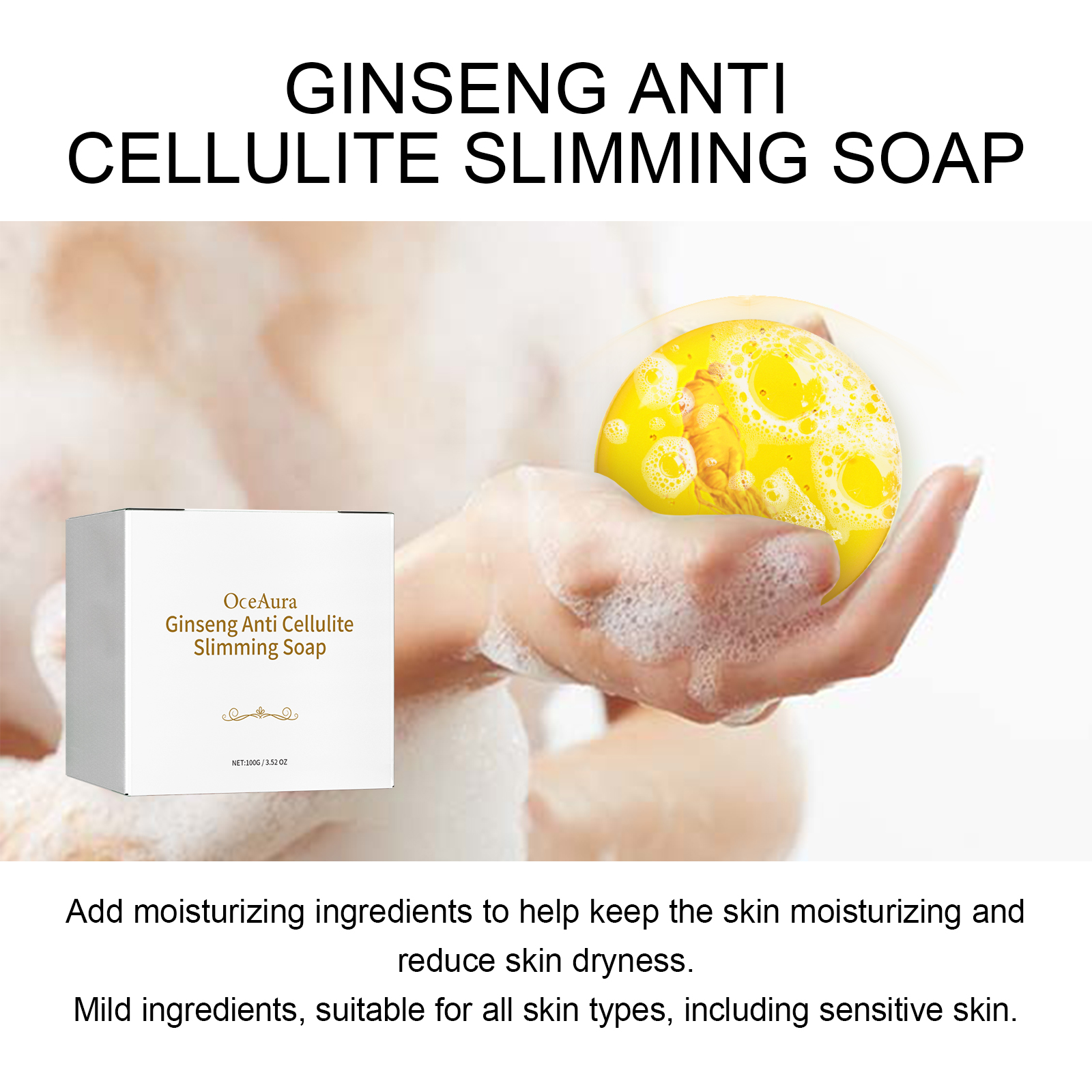 Our Ginseng Anti Cellulit contains glycerin, ginseng root extract, palm oil. It burns belly fat, tightens skin, helps keep skin hydrated and reduces dryness. The way to use it is simple: use warm water to completely wet the skin, rub soap with your hands until a rich foam is formed, massage the foam on the skin in circular motions, and finally rinse off with water. Can create a slim figure, firm skin.