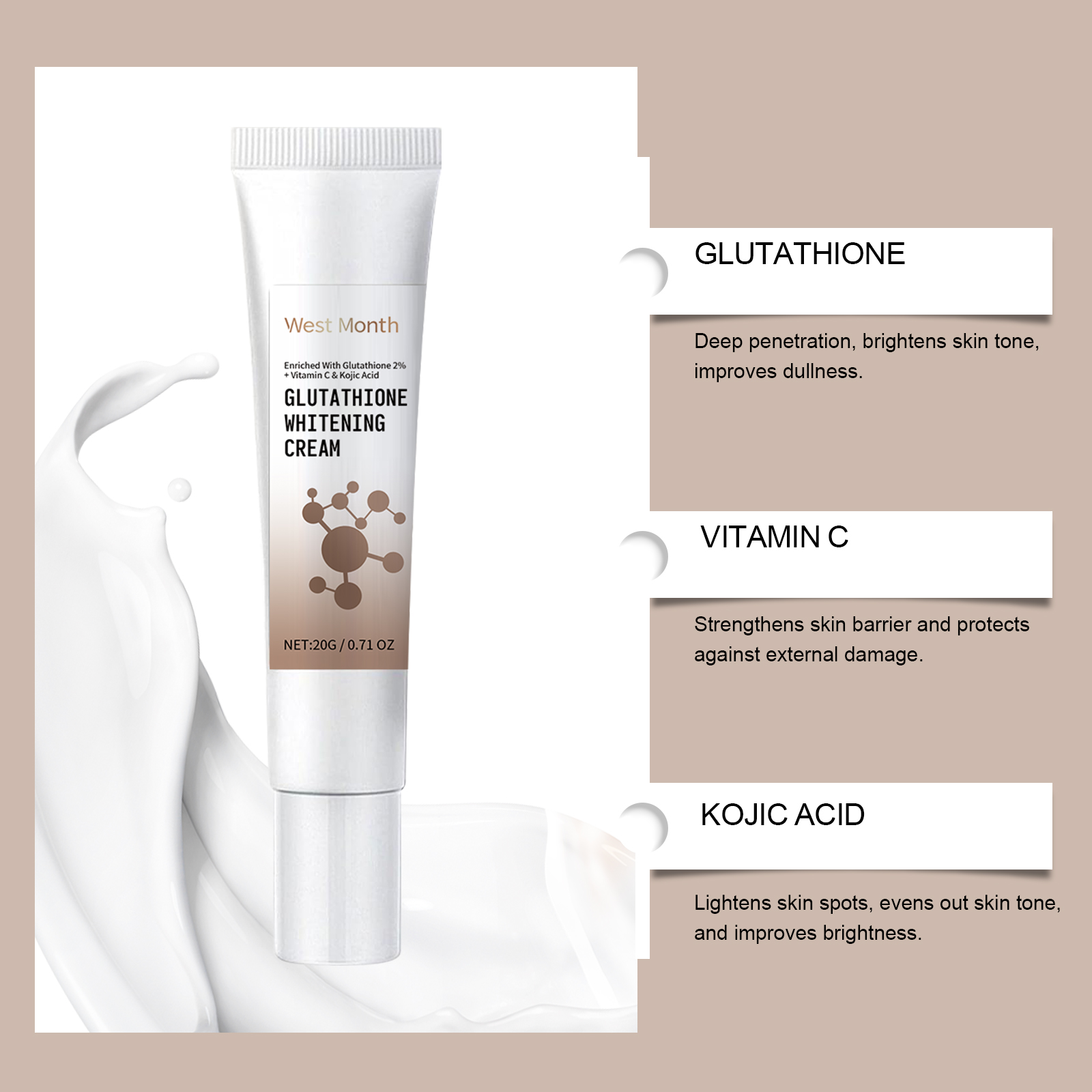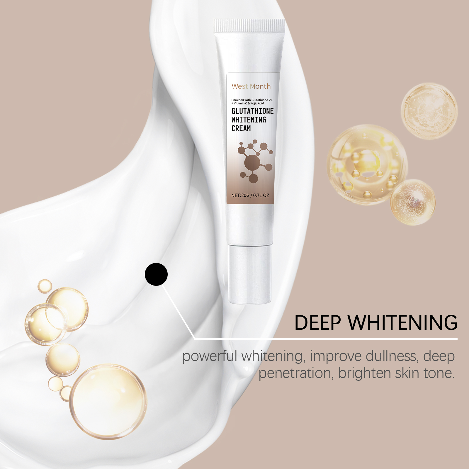 Our glutathione skin cream contains vitamin C and kojic acid. It nourishes the skin and reduces irritation. Its application method is very simple: clean and dry facial skin, apply appropriate amount of this product evenly on the face, gently massage until absorbed. And can resist free radical damage, strengthen the skin barrier, enhance the glow.
