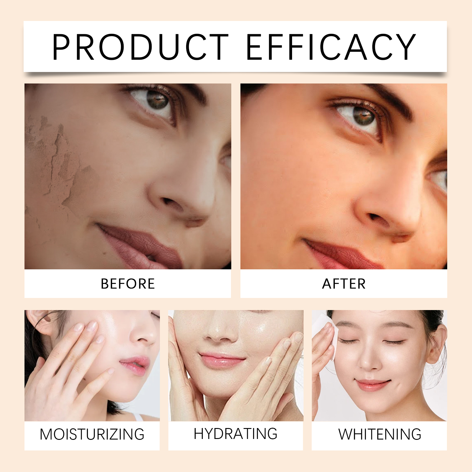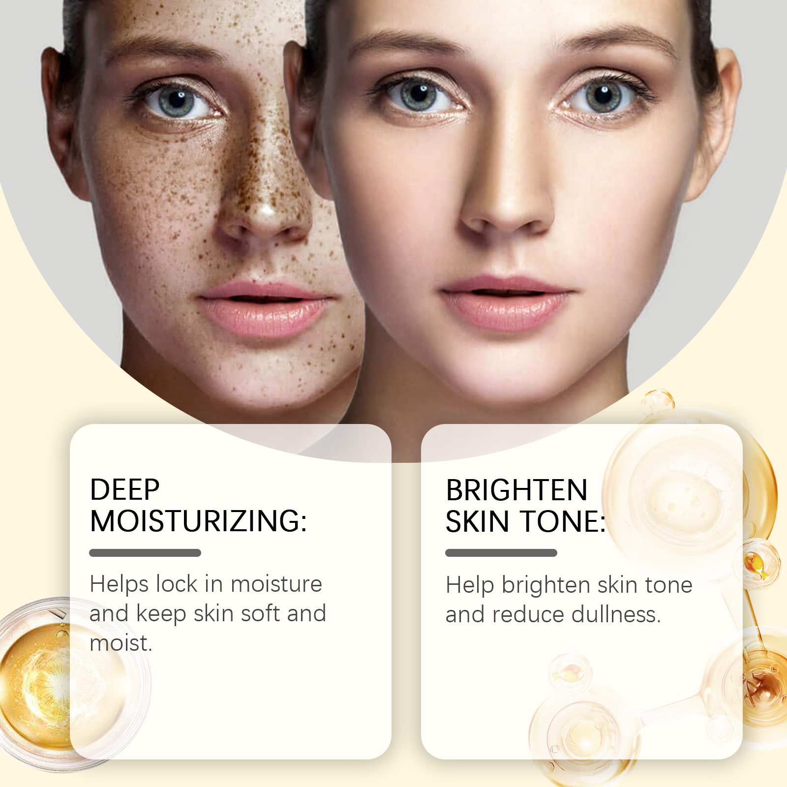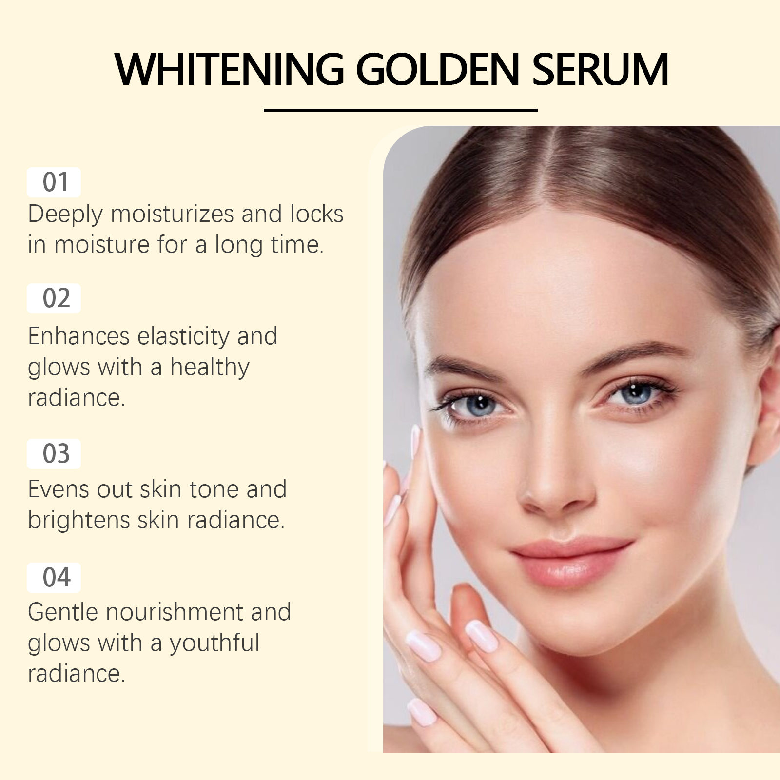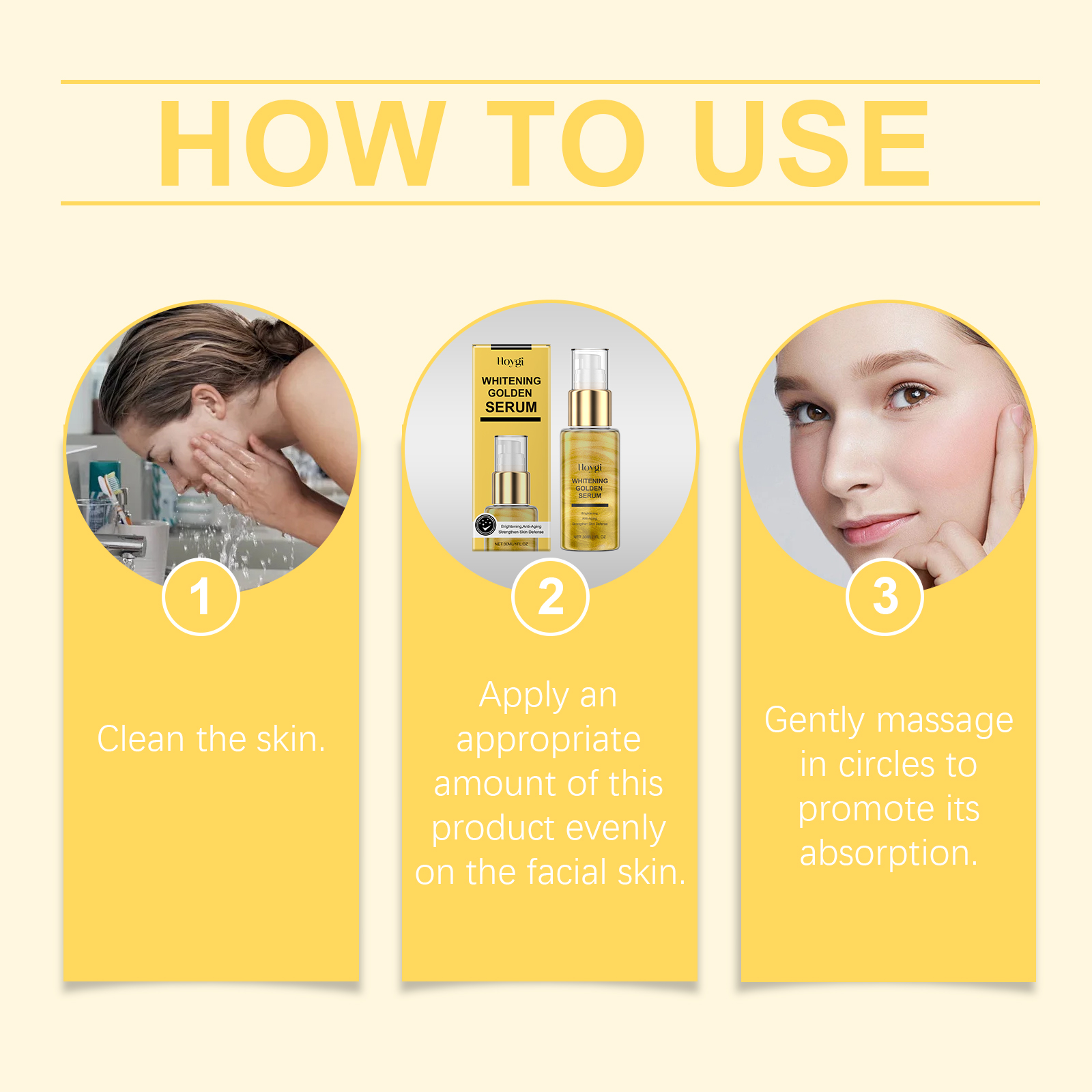 Our Gold skin care essence contains niacinamide, Centella asiatica extract, gold. It helps to lock in moisture and keep skin soft and moisturized. The way to use it is simple: clean the skin. Apply appropriate amount of the product evenly on the face. Massage gently in circular motions to promote absorption. It can also help to lighten the skin and reduce dullness.