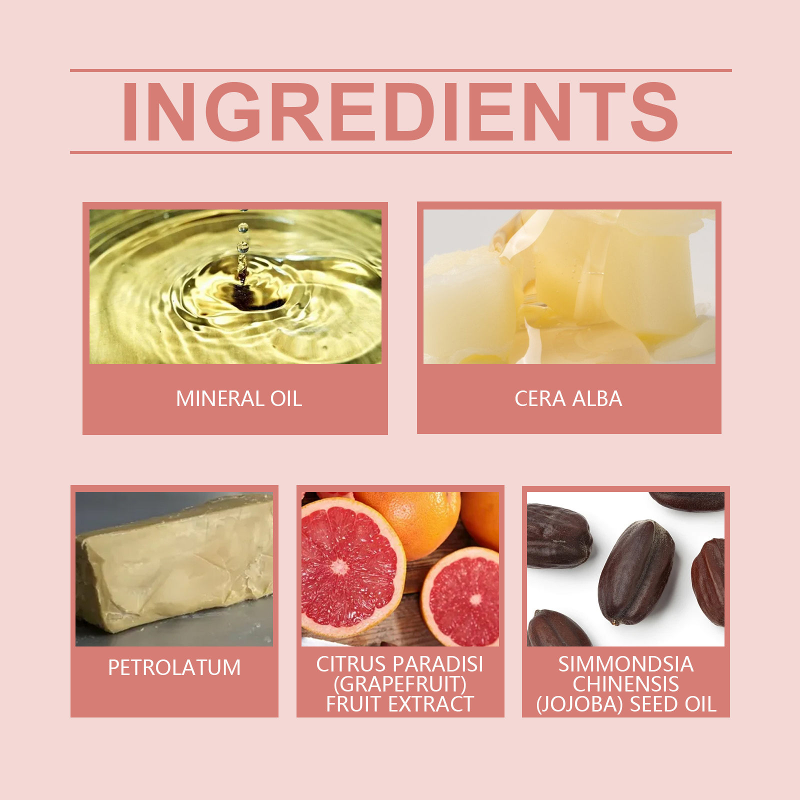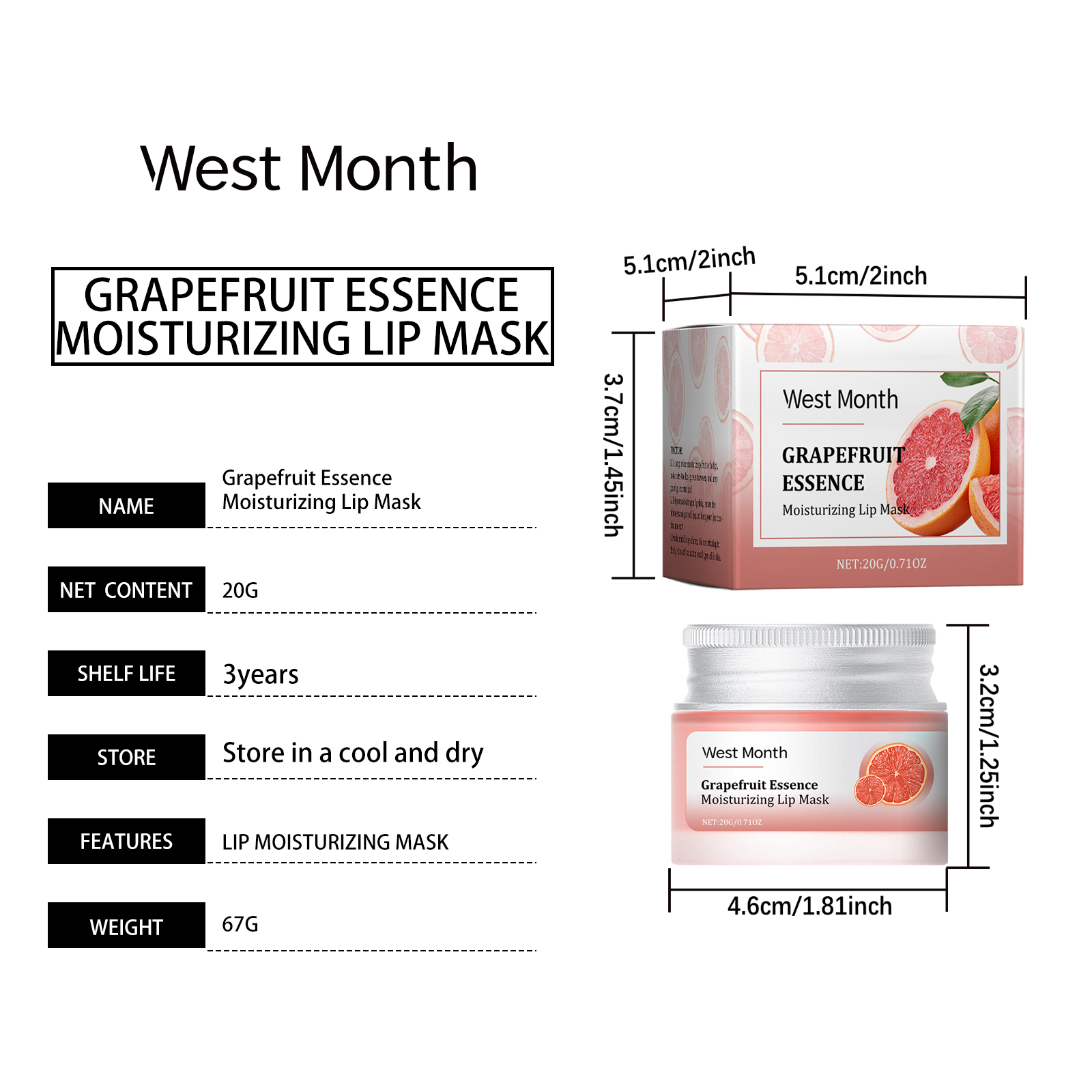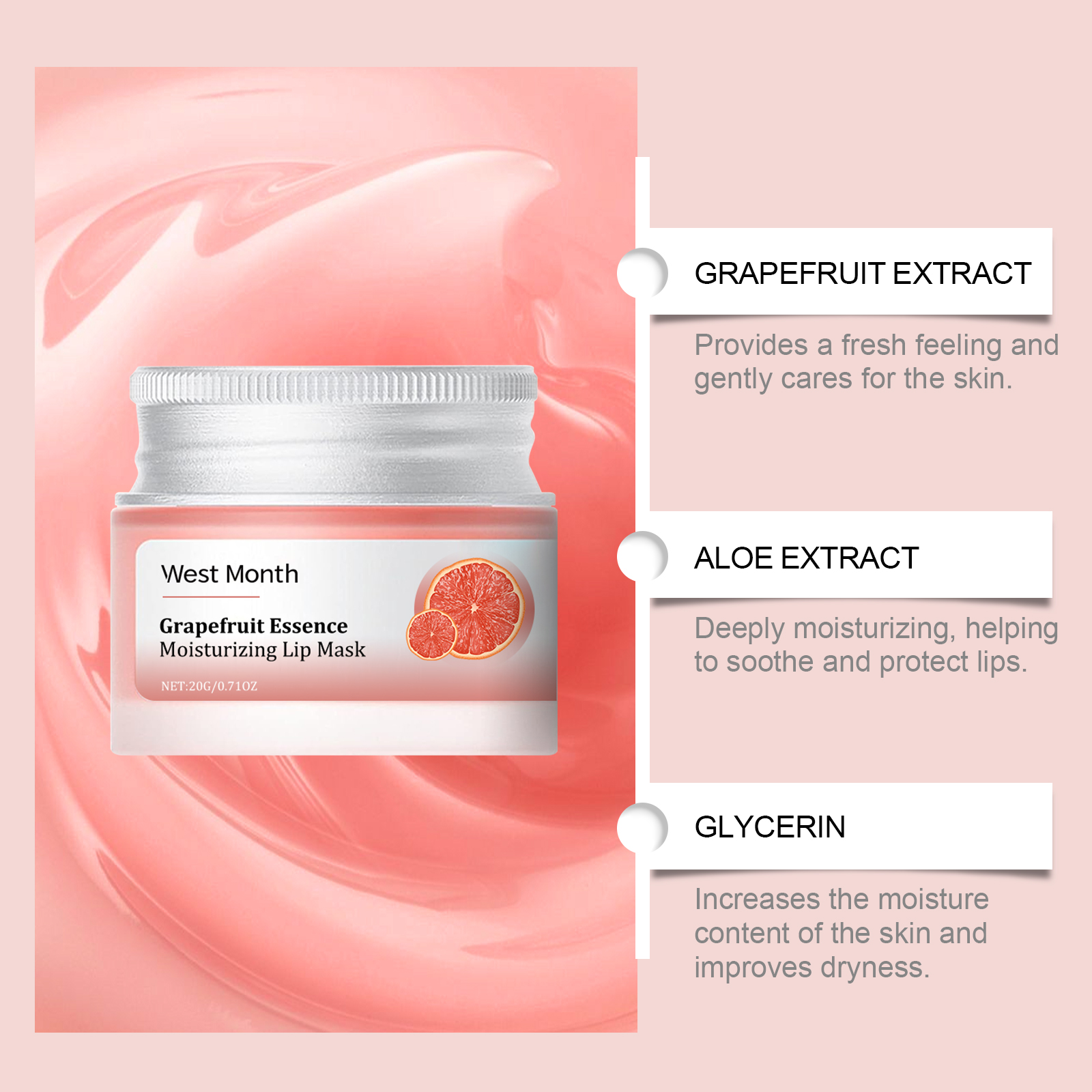 Our Grapefruit moisturizing lip mask contains mineral oil and white beeswax. It can be specifically designed to improve lip dryness and make lips softer and smoother. Its use method is very simple: clean lips, keep lips dry, take appropriate amount of this product evenly spread on the lips for absorption. And can enhance lip protection against outside interference.