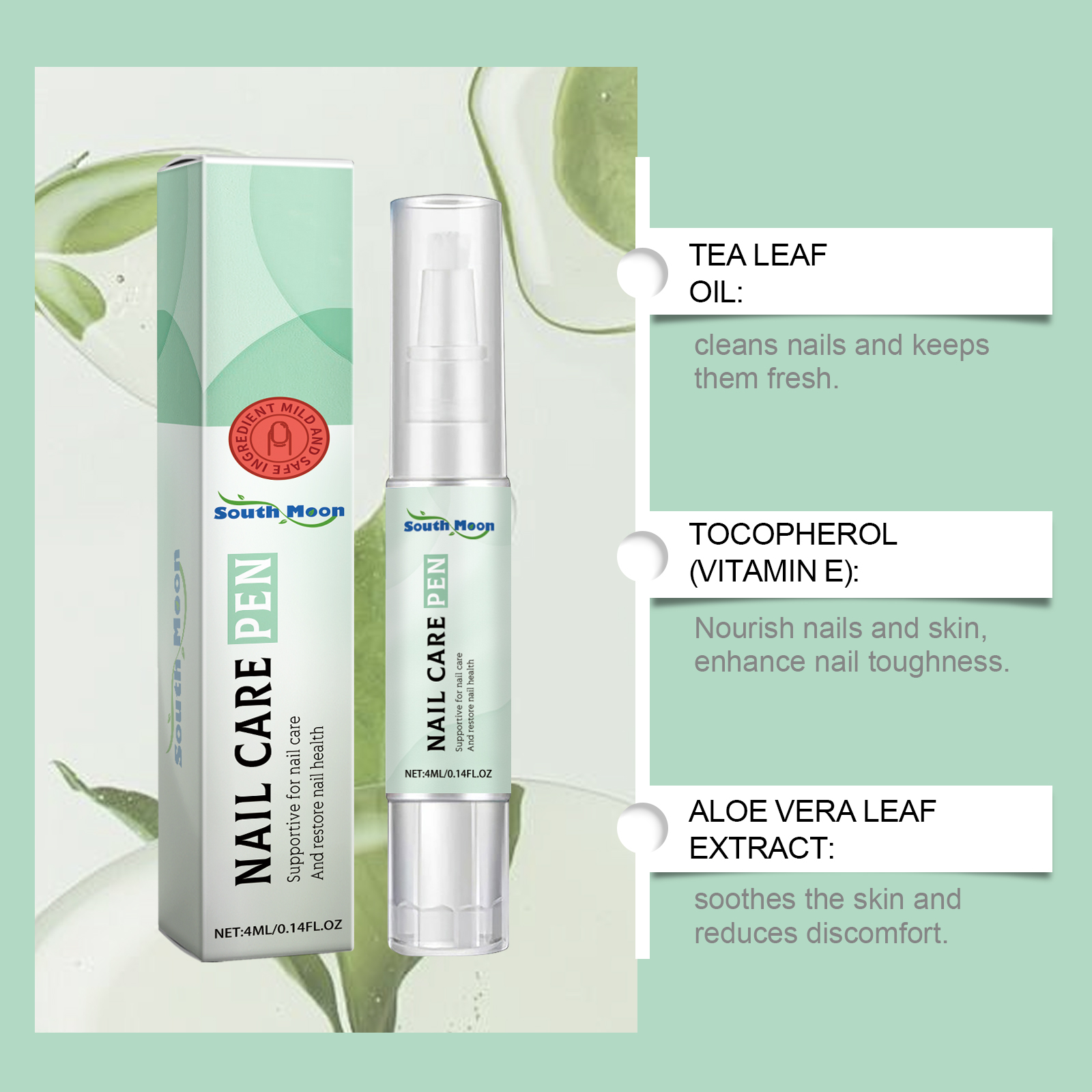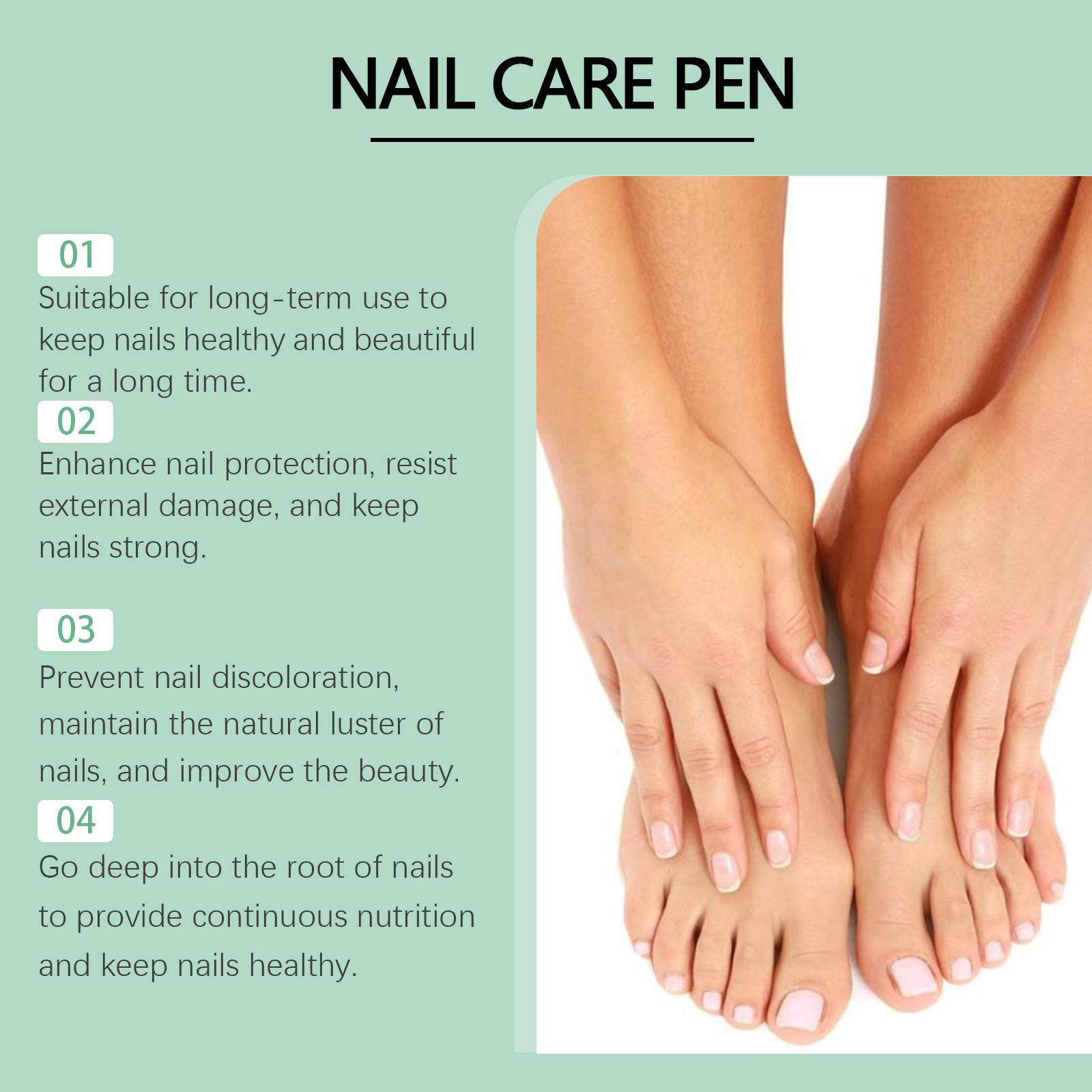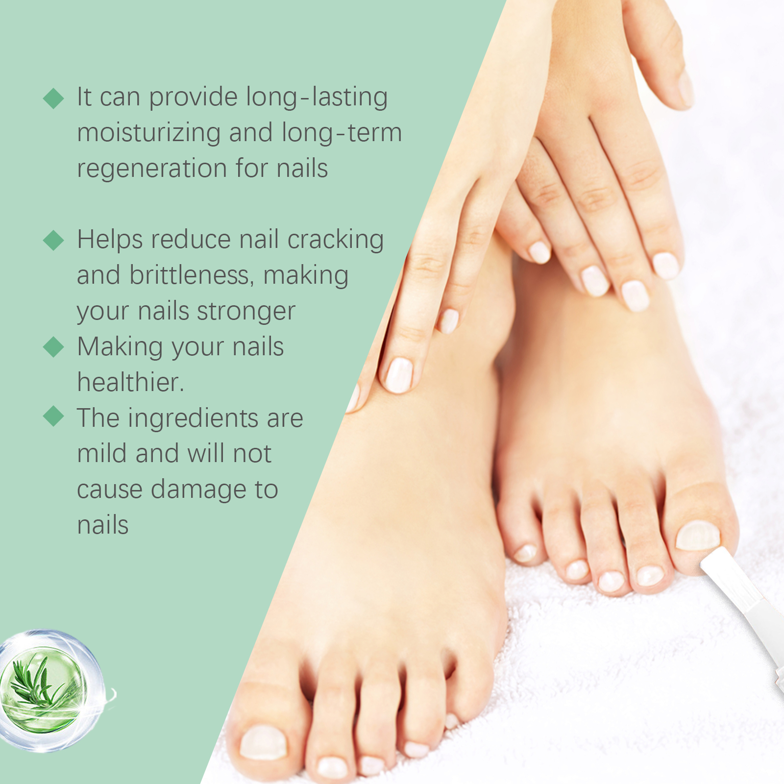 Our nail care pens contain glycerin, panthenol and PCA sodium. It deeply nourishes the nails and surrounding skin, keeping them healthy and shiny. Its application method is very simple: clean the nail and keep dry, take appropriate amount of this product, evenly apply to the affected area, gently massage until completely absorbed. It also goes deep into the root of the nail, providing continuous nutrition and keeping the nail healthy.