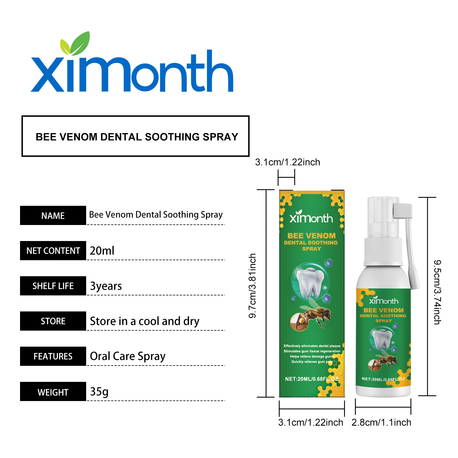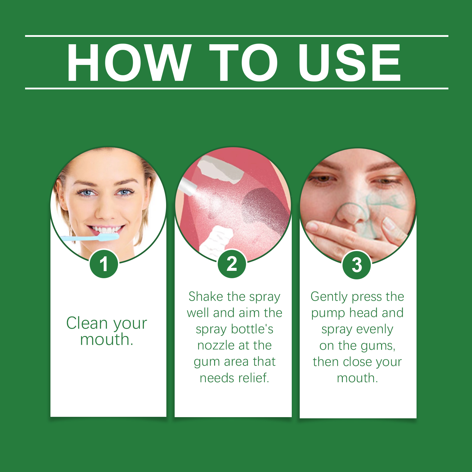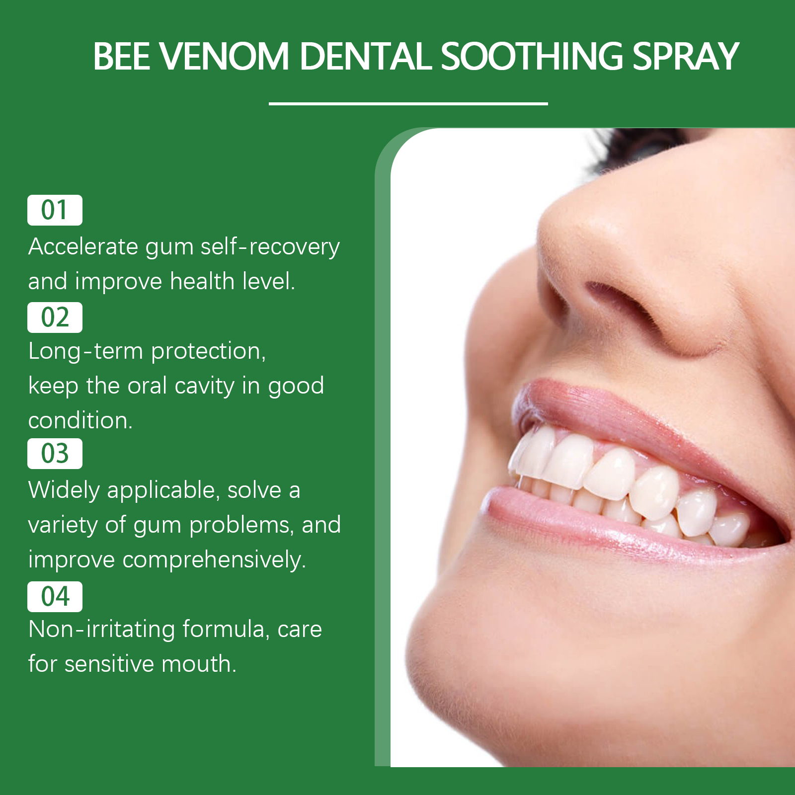 Our gum spray contains bee venom, peppermint extract, aloe vera extract. It can reduce redness and swelling of the gums and bring comfort. Strengthen the barrier and strengthen the gum protection; Accelerate gum self-repair and improve health. Long-term protection to keep the mouth in good condition. The way to use it is simple: 1. Clean your mouth. 2. Shake the nebulizer well and point the nozzle of the nebulizer at the gum area that needs relief. 3. Gently press the pump head and spray evenly on the gums. Then shut your mouth. Gum Care spray immediately improves oral freshness and long-lasting freshness. Balance the oral microenvironment to improve overall health.