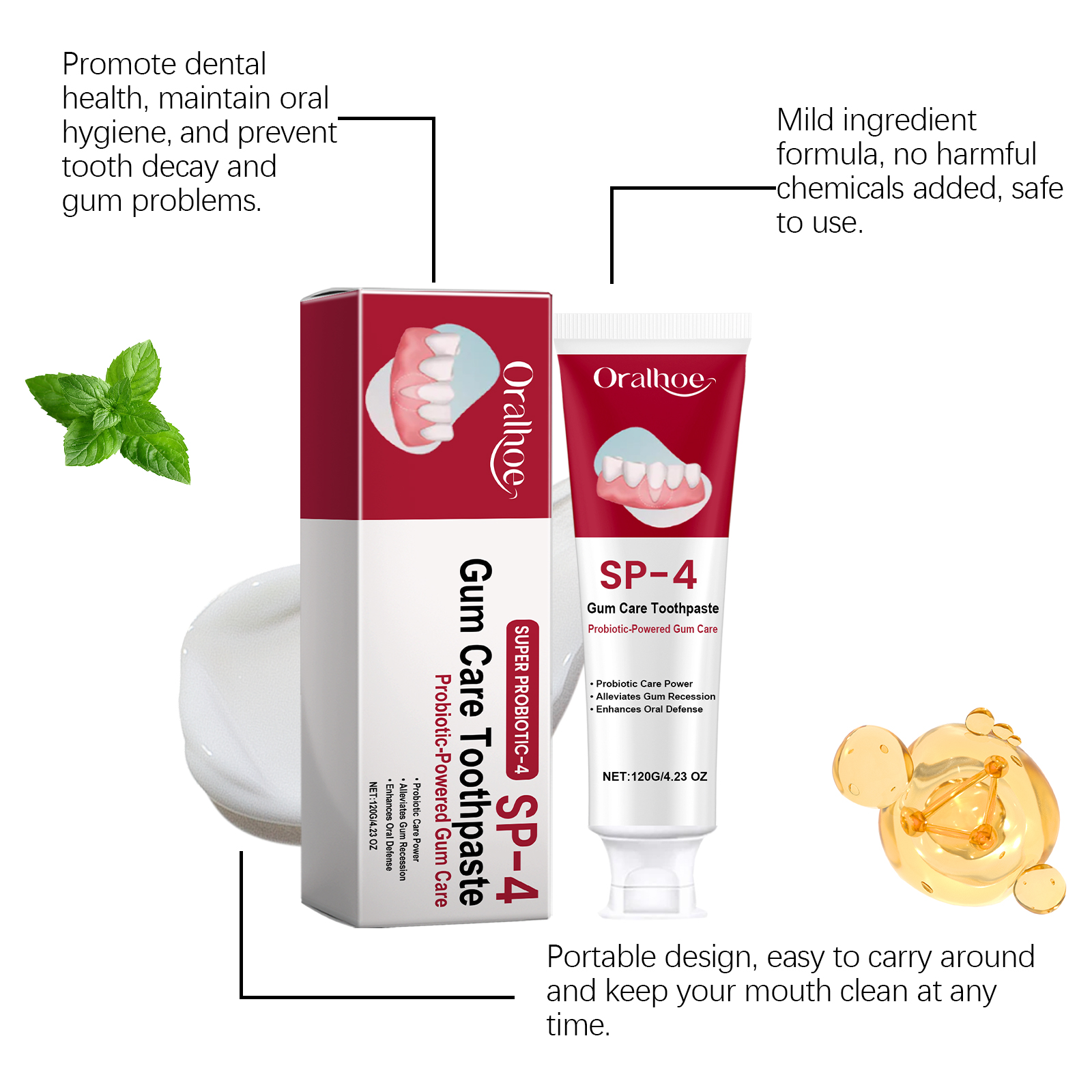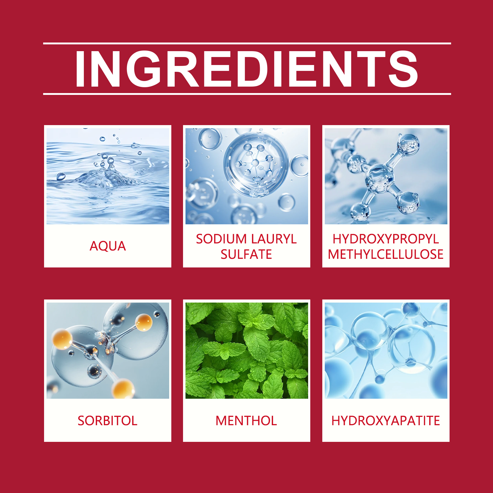 Our gum care toothpaste contains sorbitol, menthol and hydroxyapatite. It can whiten teeth and significantly improve the shine of teeth. Effective removal of macules and stains on the surface of teeth. Its use method is very simple: 1. Take the appropriate amount of this product with a toothbrush; 2. Brush your teeth gently for 3 minutes with the correct brushing method; 3. Rinse your mouth thoroughly with water. It can remove stubborn stains, whiten teeth, and make your teeth shine.