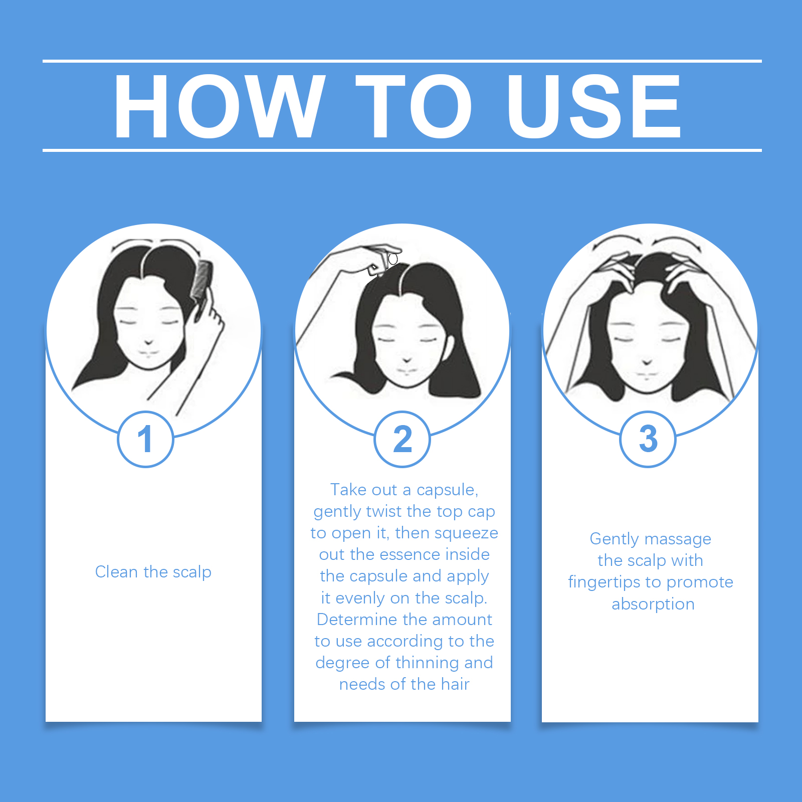 Our hair care capsules contain aloe vera extract, pumpkin extract. It can nourish and strengthen the root, accelerate growth, strengthen the hair root, reduce hair loss, improve hair toughness, its use method is very simple: clean the scalp, take out a capsule, gently twist the top lid to open, and then squeeze the essence in the capsule evenly apply on the scalp according to the thinning degree of hair and need to determine the amount of use, gently massage the scalp with the fingertips to promote absorption. It can also promote hair follicle vitality and speed up the natural growth cycle of hair.