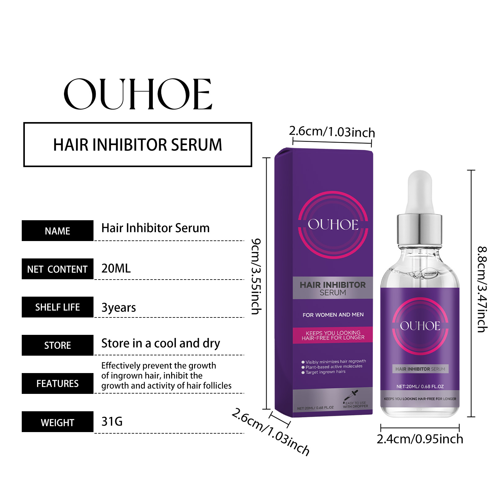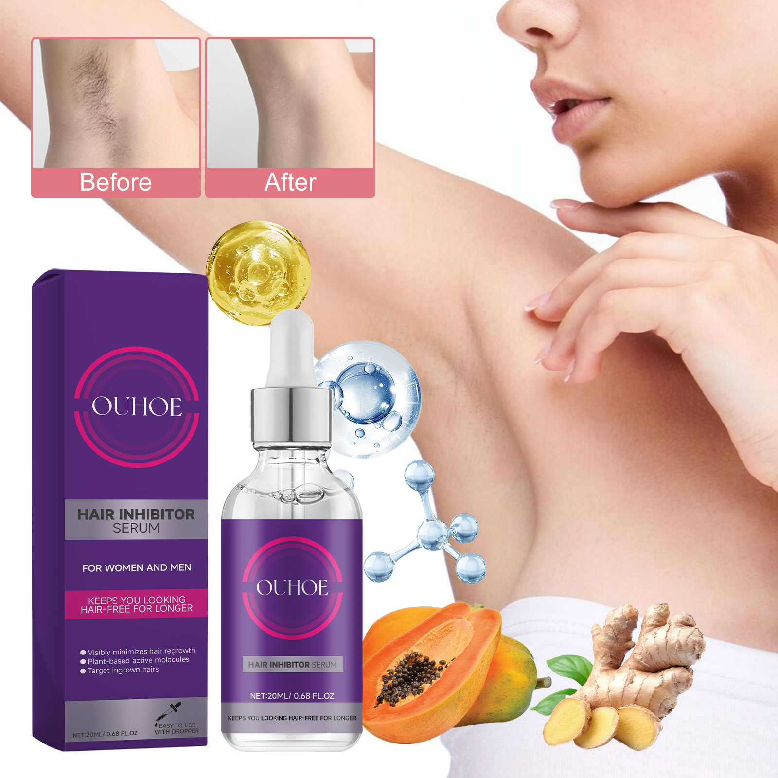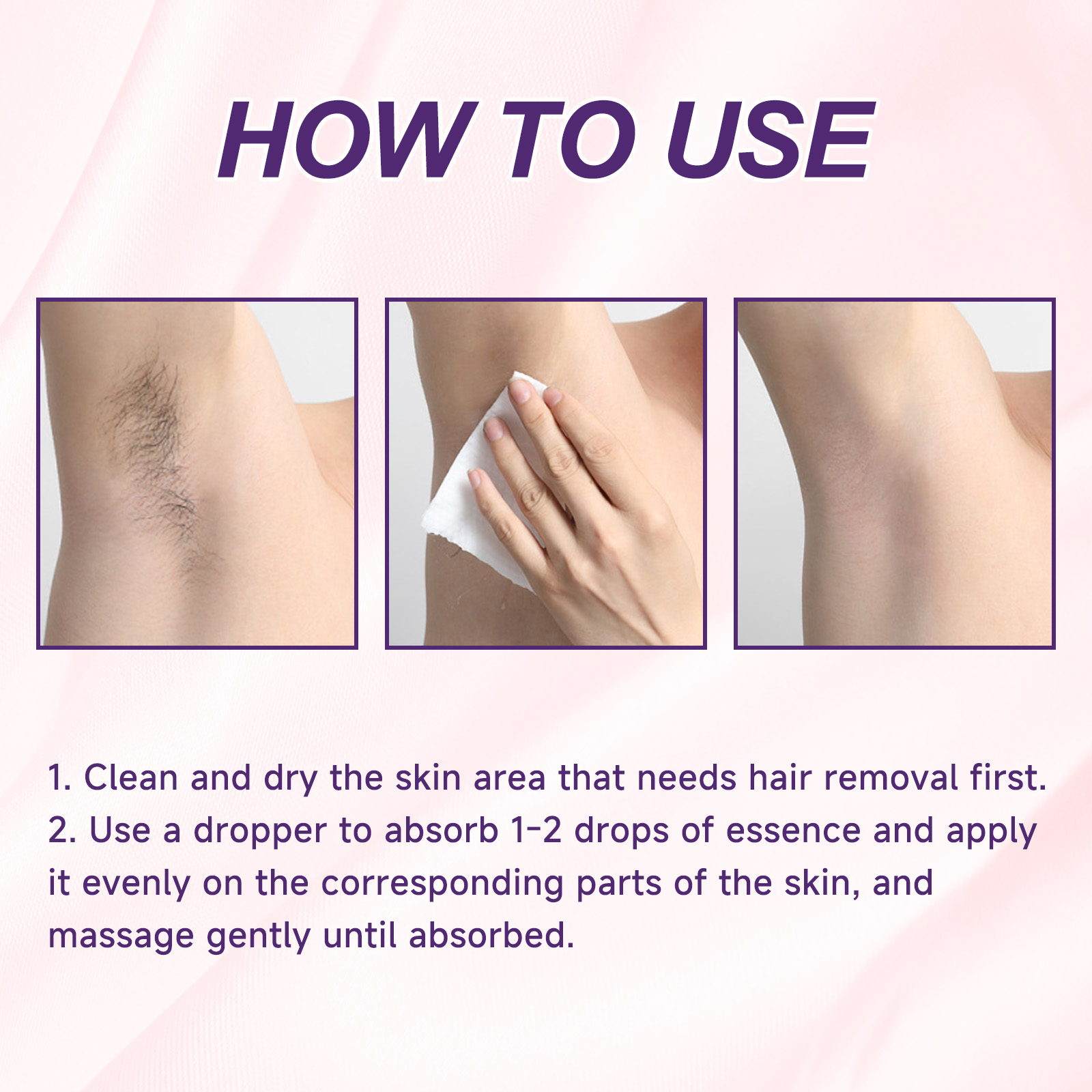 Our hair care serum contains hyaluronic acid, glycerin, hydrolyzed collagen. It can reduce embarrassment caused by thick body hair, remove excess hair, provide moisture to the skin, help maintain skin elasticity, and keep skin silky and soft after hair removal. Its application method is simple: 1. First clean and dry the area of skin that needs hair removal. 2. Use an eyedropper to absorb 1-2 drops of serum, evenly apply to the corresponding parts, and gently massage until absorbed. Hair care serum continuously removes hair, makes skin smooth and moisturized, and increases sex appeal.