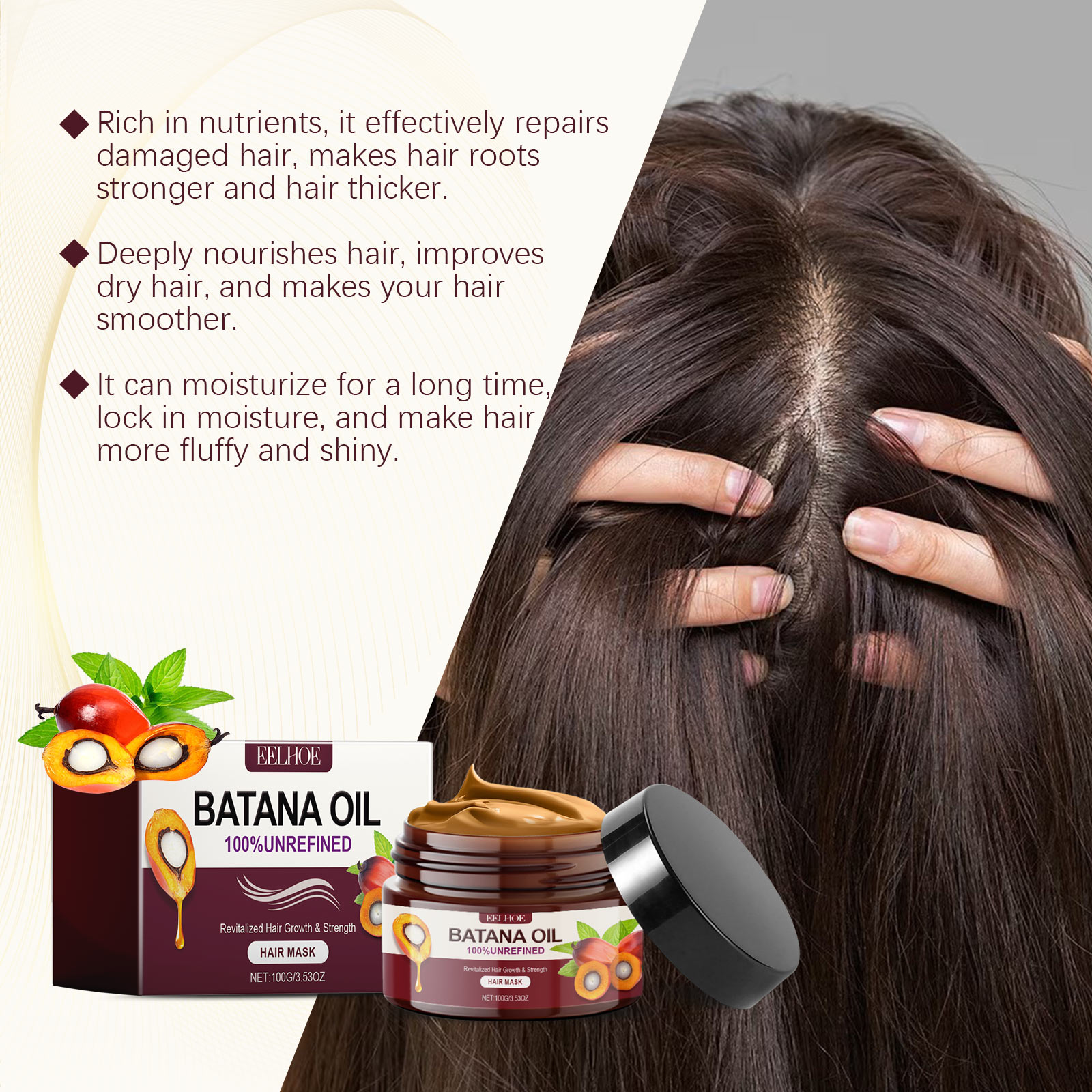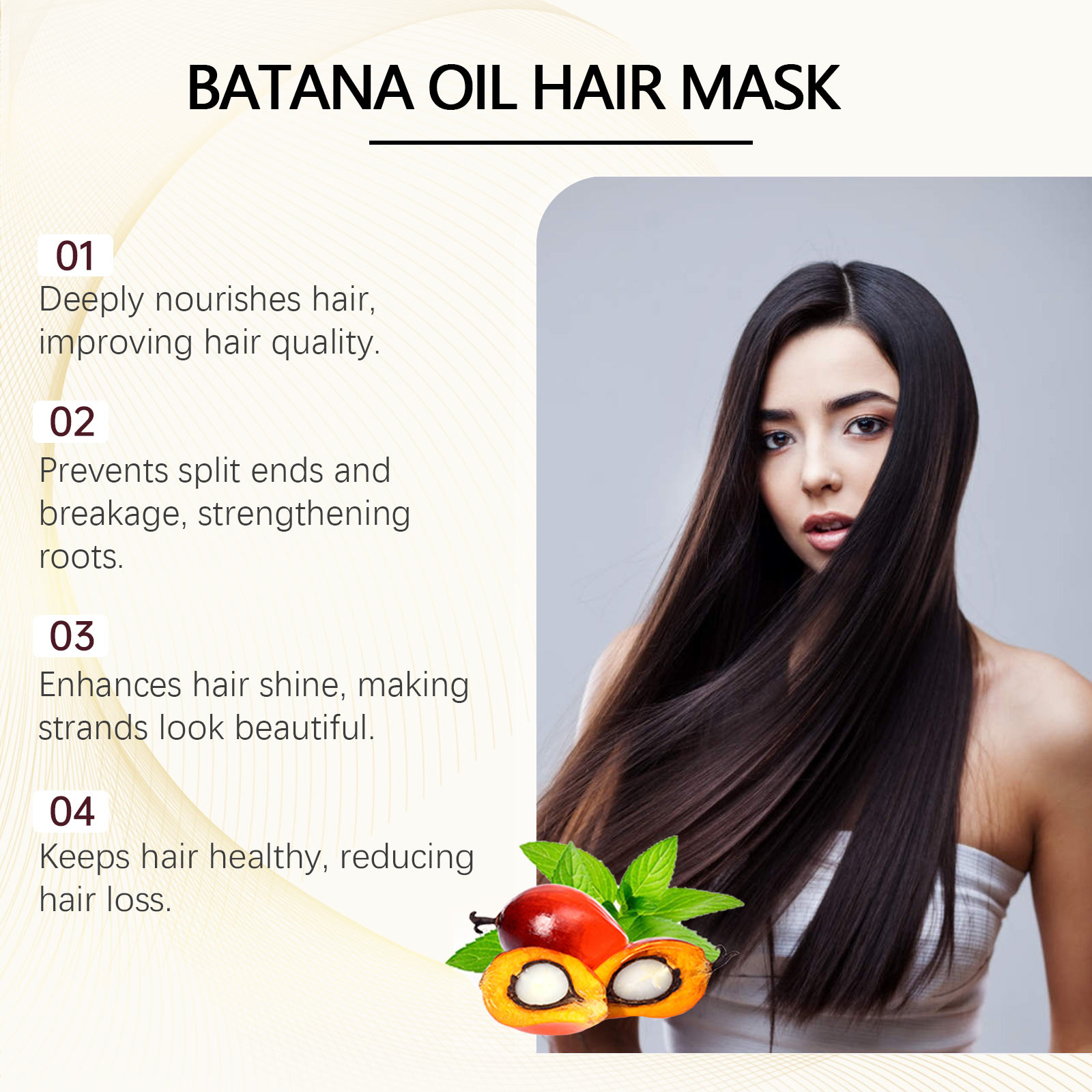 Our Batana Oil Strong Volumizing hair mask contains Batana oil. It can make hair smooth and soft easily create a variety of ideal hair styles, showing personality. Its use method is very simple: take an appropriate amount of hair mask, evenly apply on the semi-dry hair, then comb and massage for 5-7 minutes and finally rinse with water. And it can nourish your hair, improve the overall texture of your hair, and make your hair more attractive.