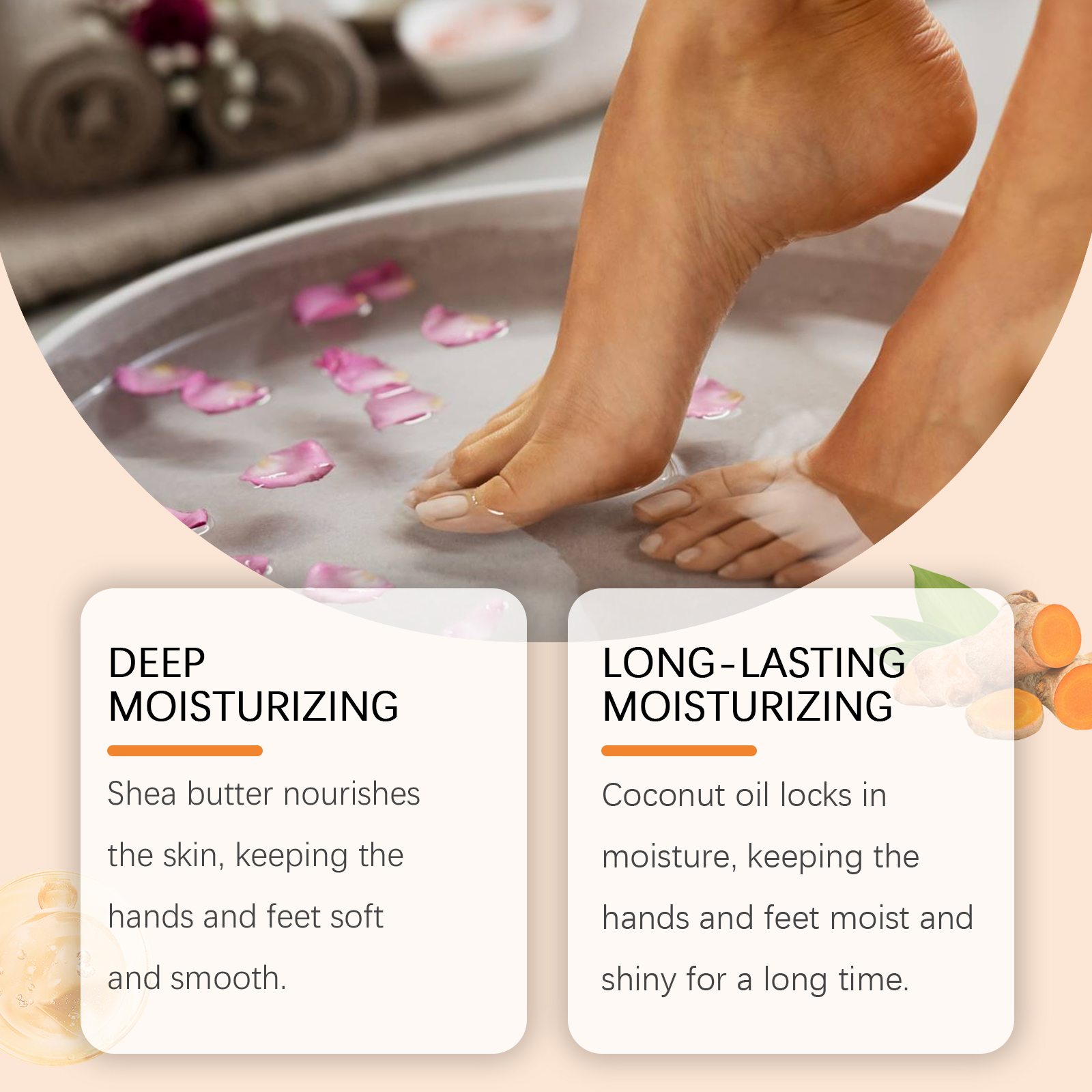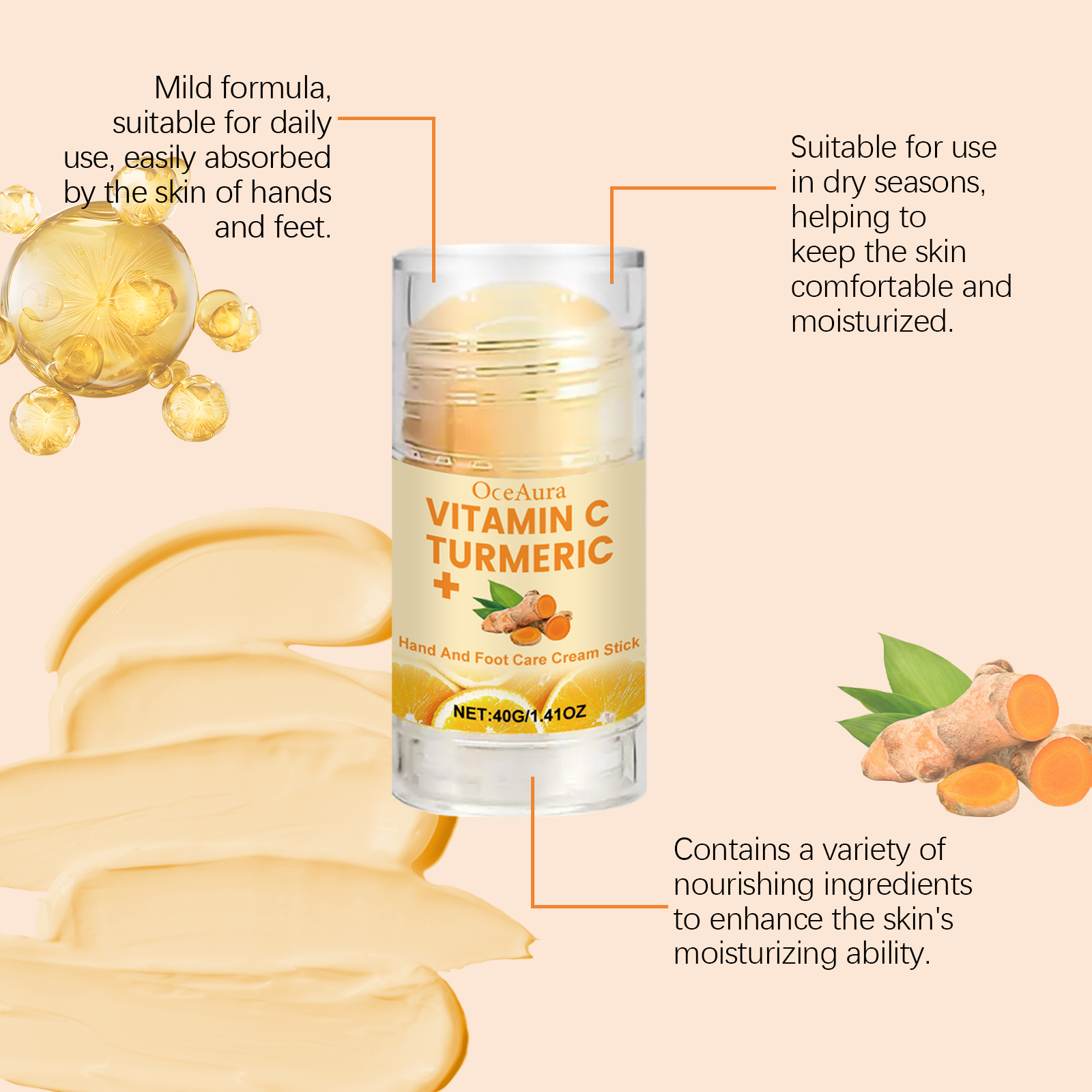 Our hand and foot moisturizing treatment stick contains mineral oil, beeswax. It nourishes the skin and keeps hands and feet soft and smooth. Coconut oil locks in moisture and keeps your hands and feet moist and shiny for a long time. Its use method is very simple: clean the skin, keep the skin dry, take appropriate amount of this product evenly spread on the skin of hands and feet. Massage gently until fully absorbed. And can improve rough and crack problems, and restore the smooth texture of the skin.