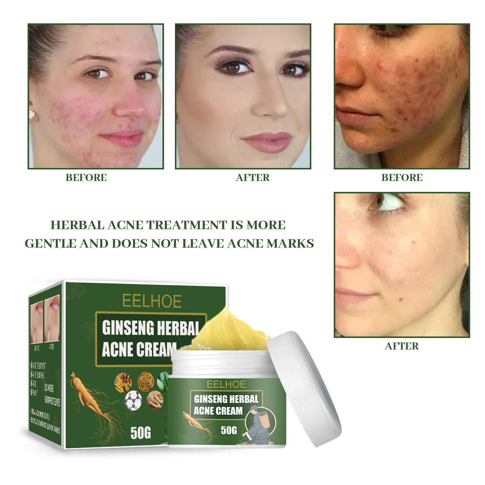 Our herbal acne cream contains hydrogenated castor oil, witch hazel nicotinamide. It can treat acne more gently and will not leave acne marks. The way to use it is simple: 1. Clean your face. 2. Dip the product in your hand and apply it to the surface of the pimple until it is fully absorbed. And can make the acne on the face disappear, gradually solve the problem of acne skin.