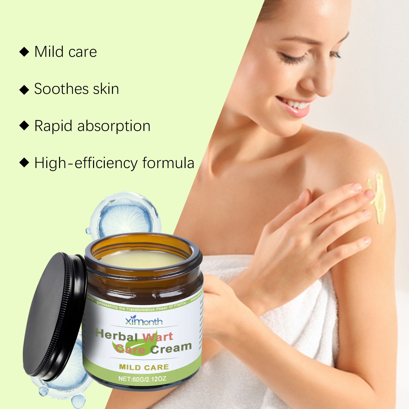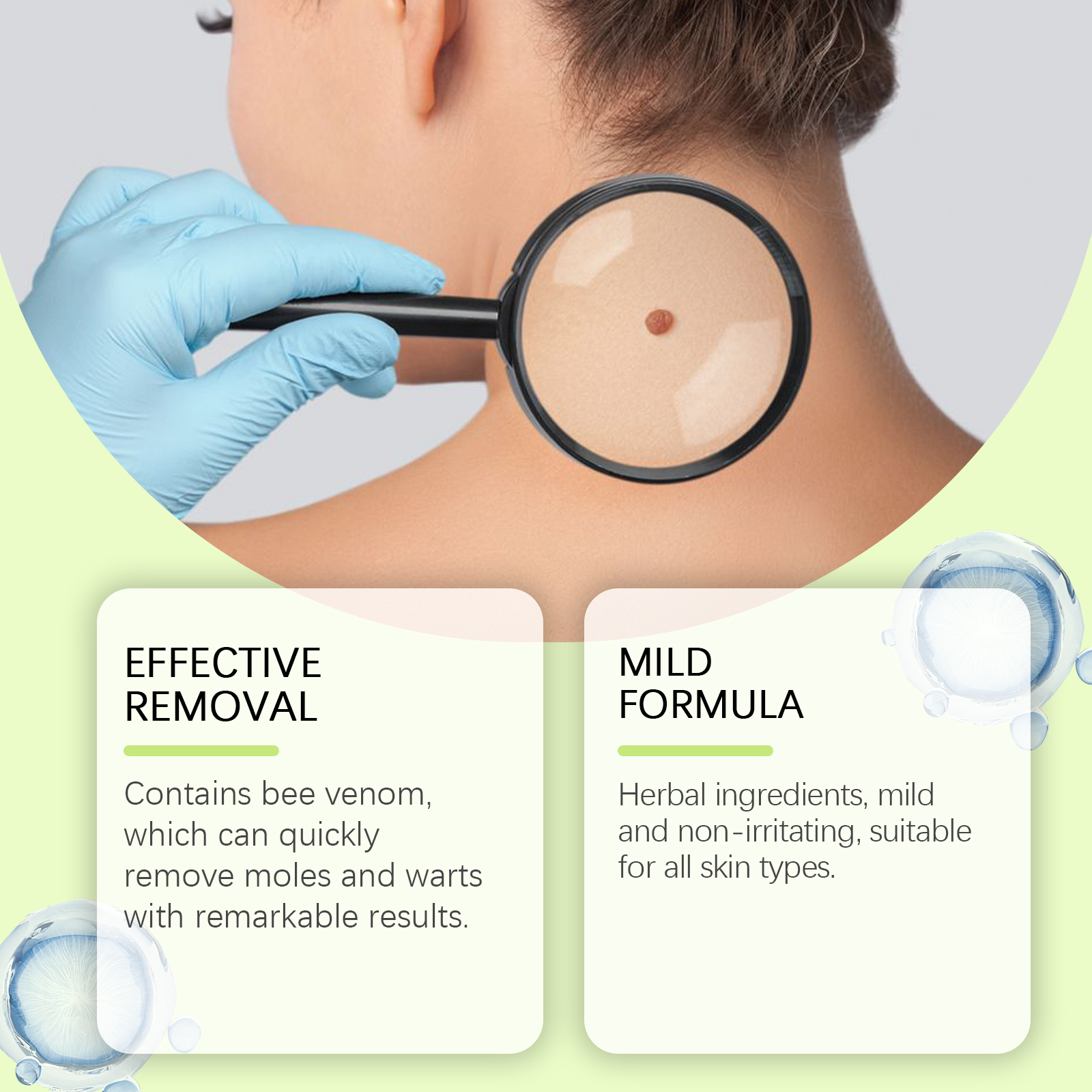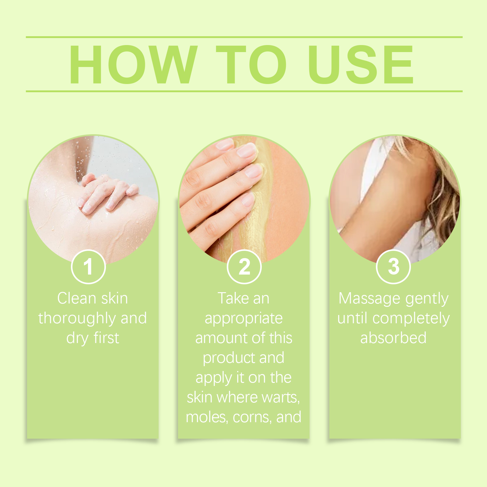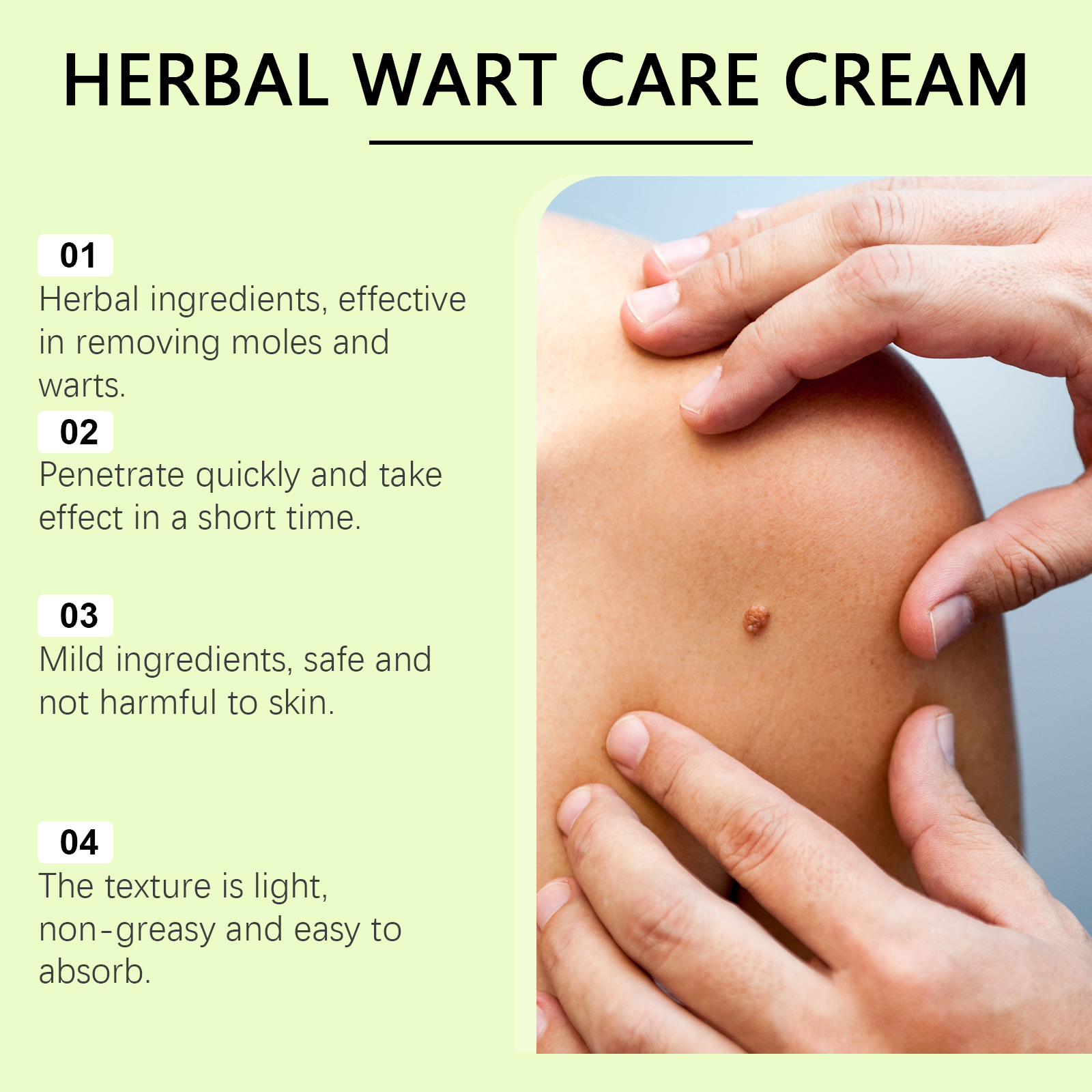 Our herbal treatments contain St. John's wort extract, tocopherols. It can be mild and non-irritating and is suitable for all skin types. Its use method is very simple: thoroughly clean the skin, dry first, take appropriate amount of this product, apply to warts, moles, millet, gently massage until completely absorbed. And it promotes healthy skin. It is painless, does not leave scars and does not cause any discomfort after use.