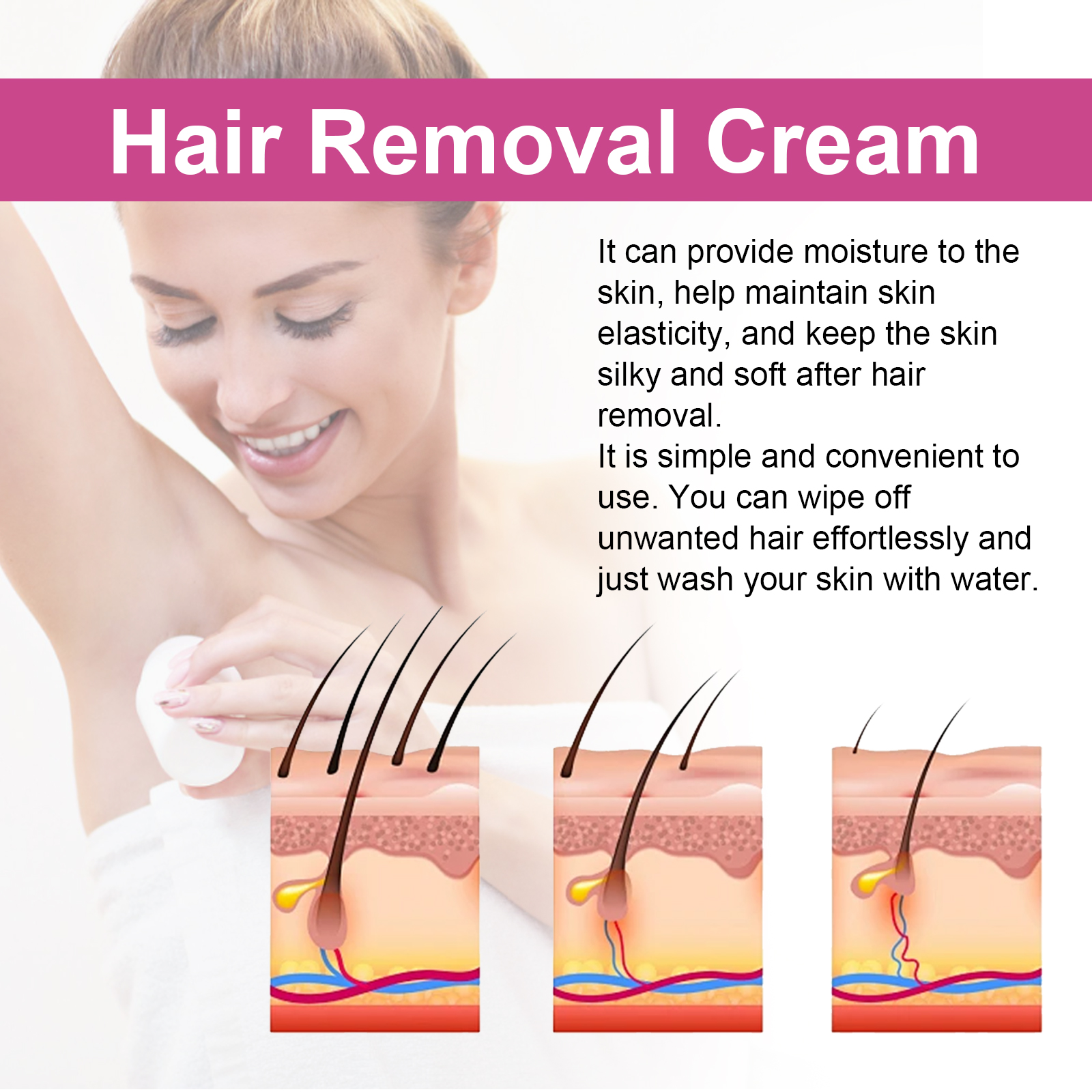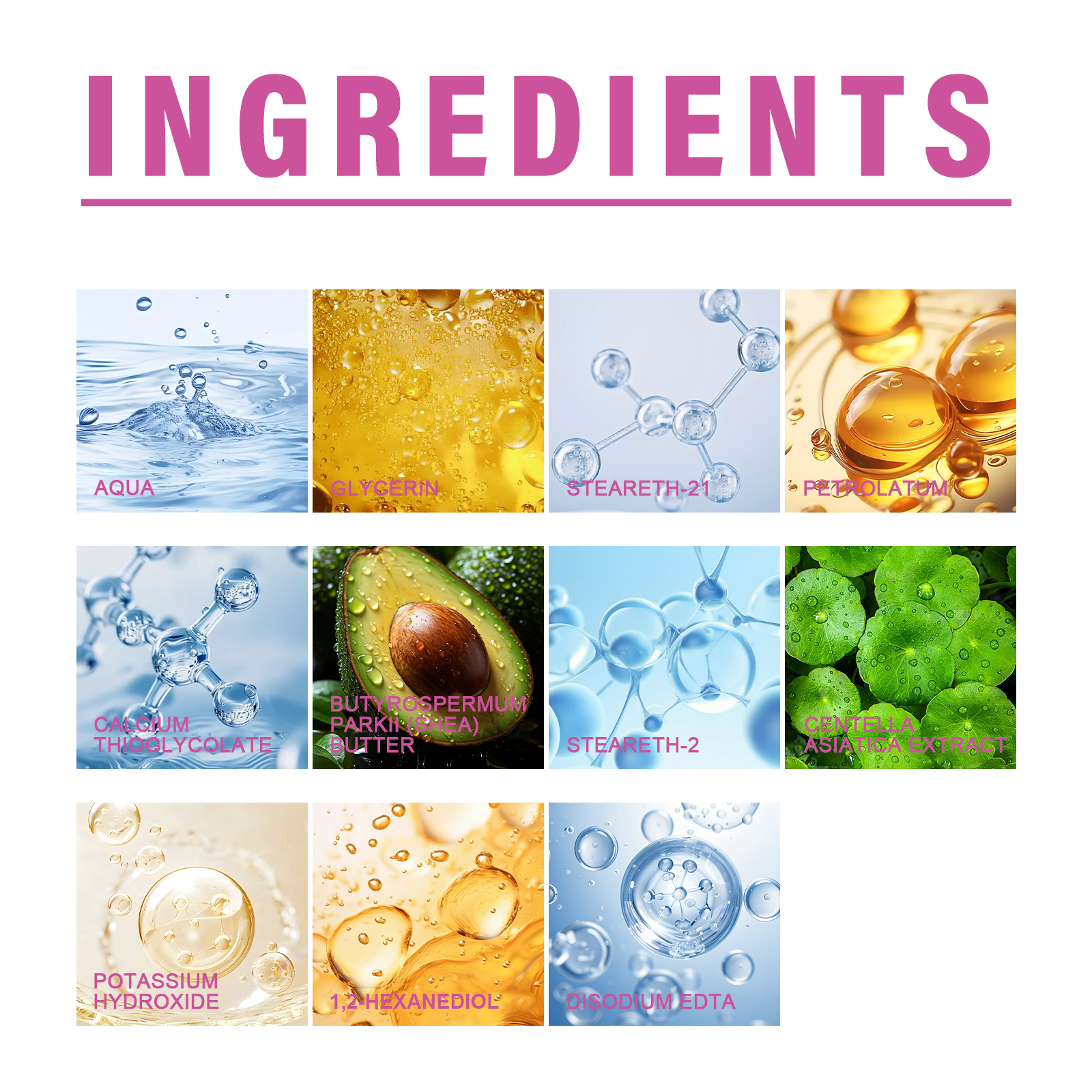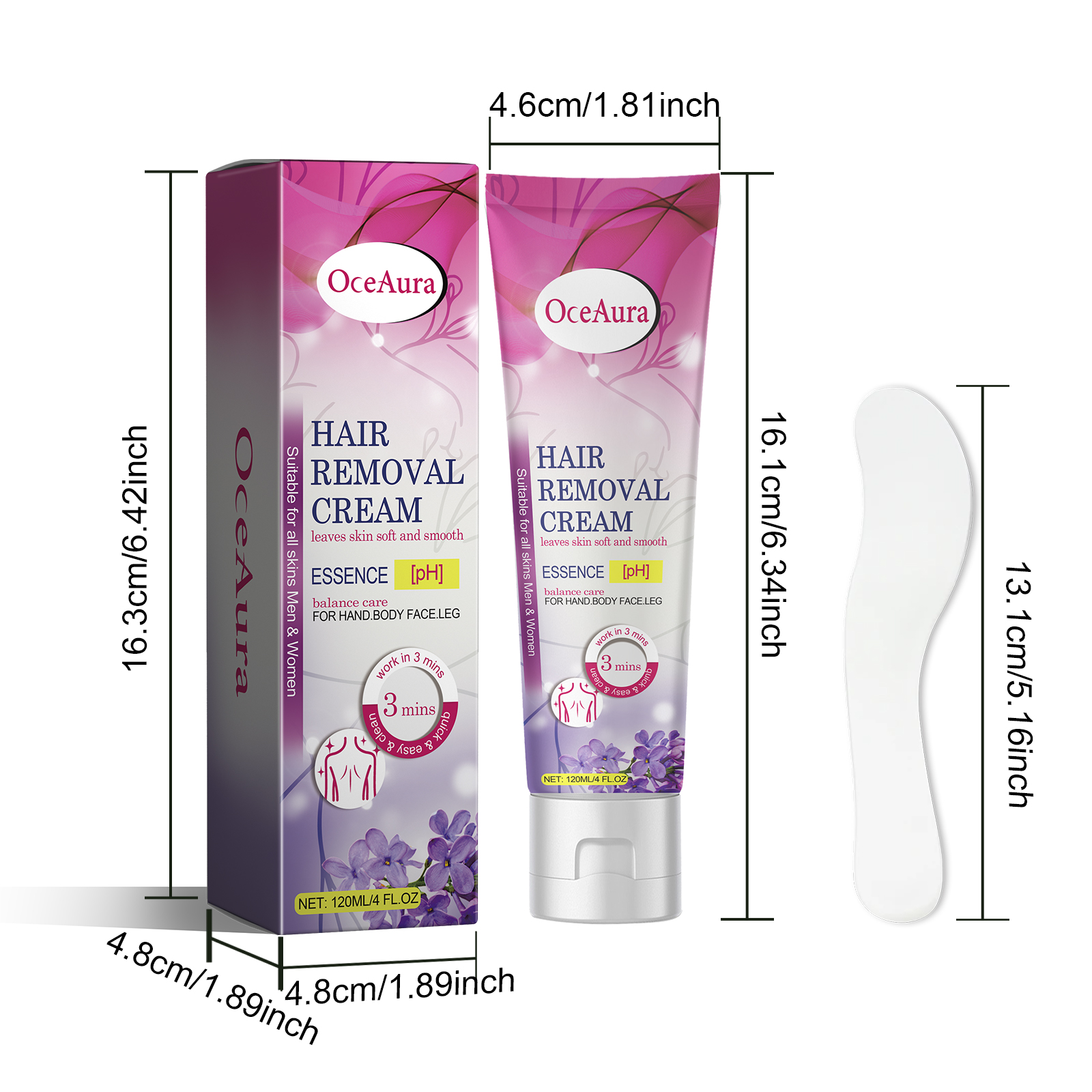 Our herbal hair removal cream contains glycerin, stearol-21. It can simply remove excess hair, provide moisture to the skin, help maintain skin elasticity, and keep skin silky and soft after hair removal. Its application method is very simple: clean and dry the skin, take a proper amount of hair removal cream, evenly apply to the desired hair removal area, let it sit for 5-10 minutes, use a spatula on the hair, and finally rinse it off with water. It quickly penetrates into the skin, dissolves hair, and helps you remove hair easily and painlessly, with mild ingredients that do not irritate the skin and leave no dark spots after hair removal.